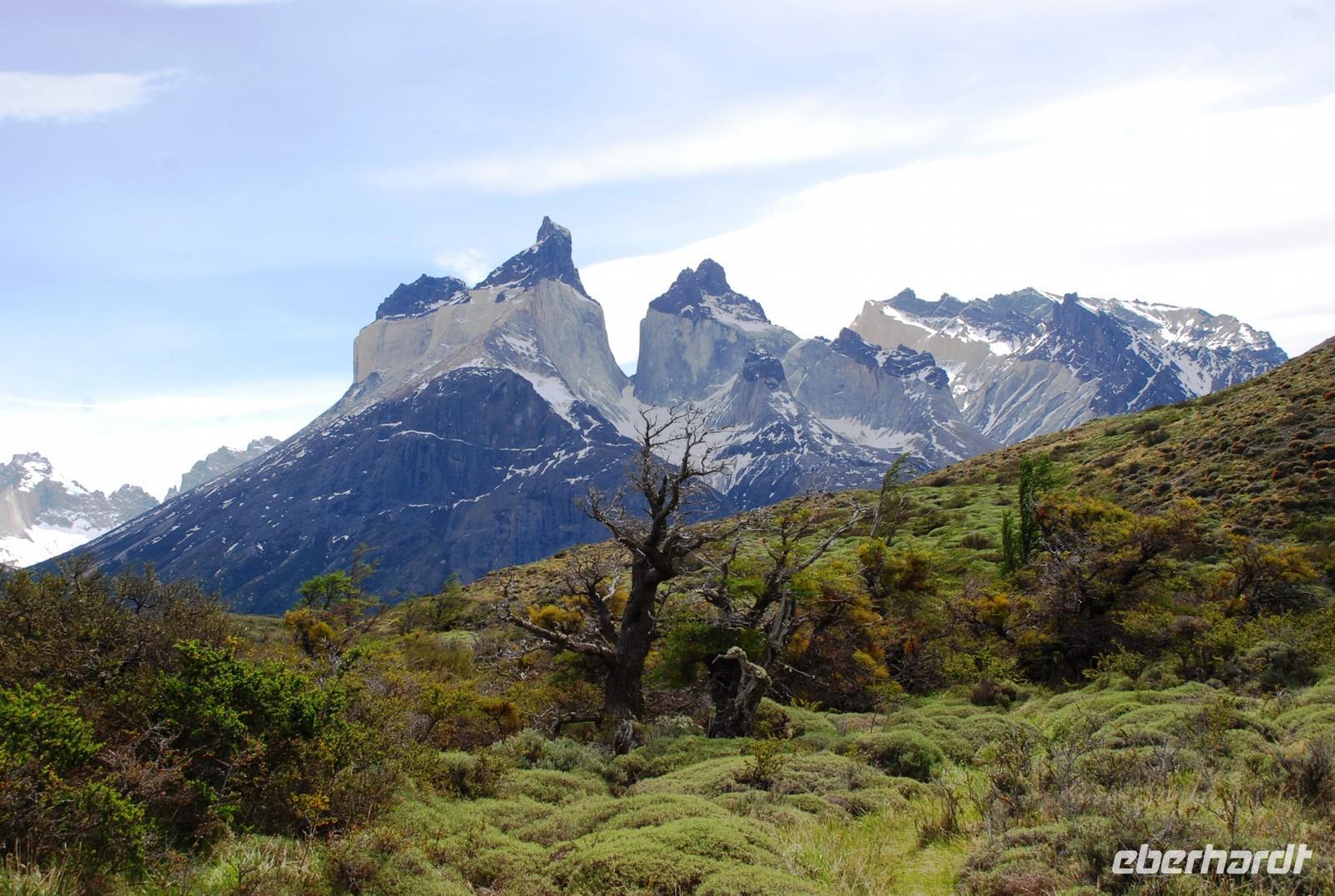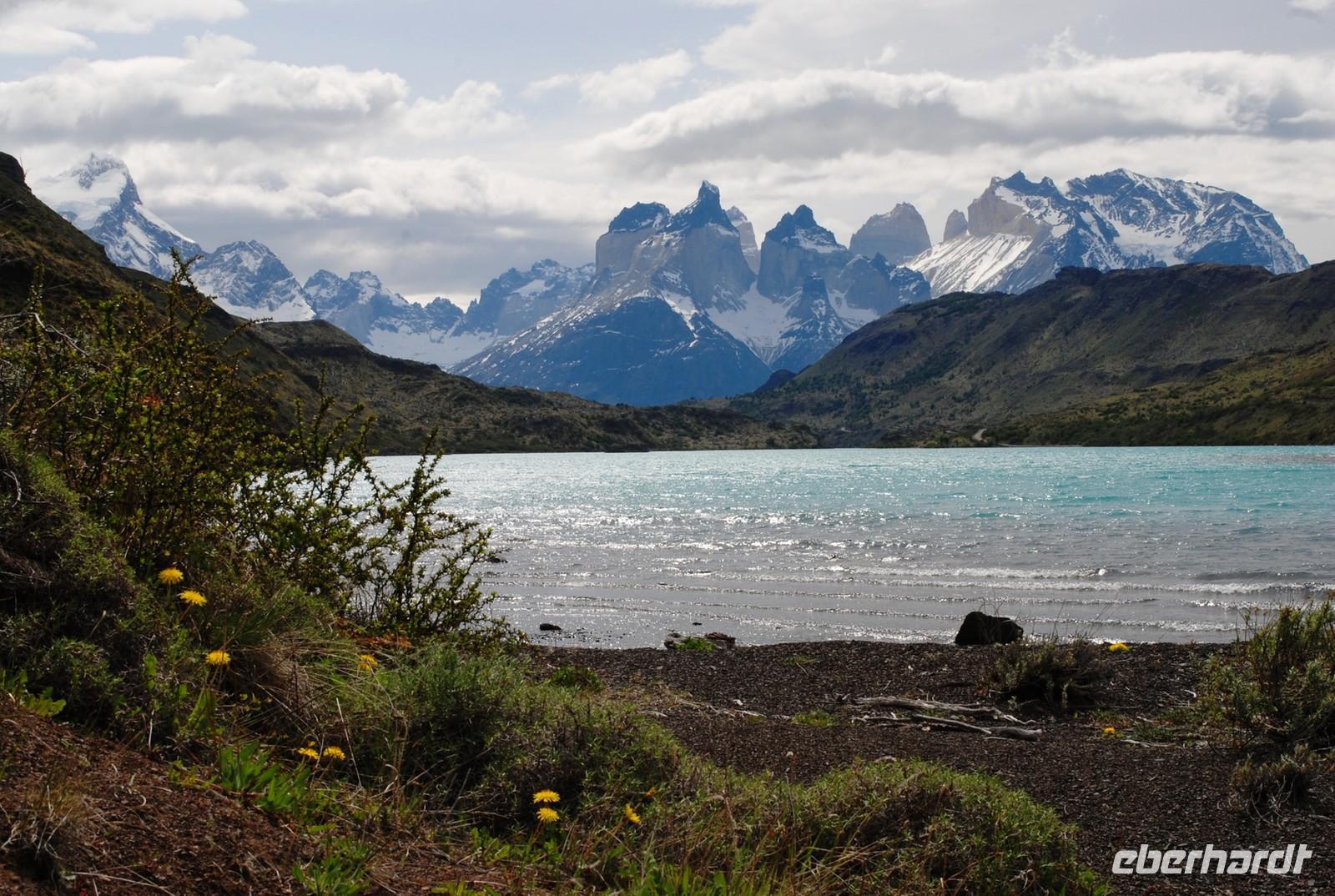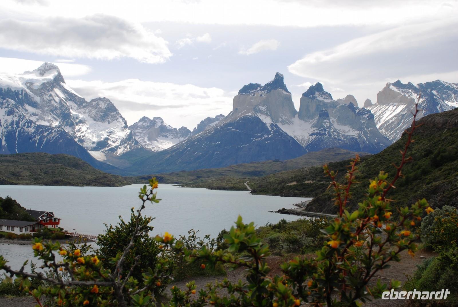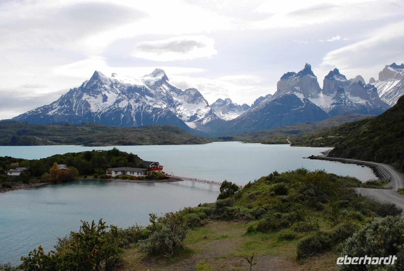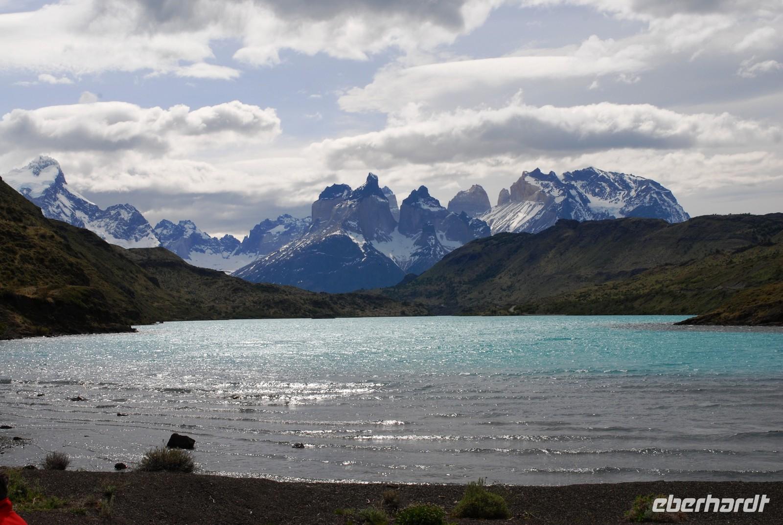Früh am Morgen zeigen sich noch einige Wolken als wir unsere Reise in den Nationalpark Torres del Paine beginnen. Der Himmel zieht jedoch schnell auf und so haben wir bei unserer Ankunft im Gebiet des Torres del Paine einen tollen Blick auf das gesamte Massiv. Wir besichtigen die Cascadas del Paine - Wasserfälle - und beobachten unterwegs Nandus, Kondore und Guanakos. Am Eingang des Nationalparks erwartet uns ein zutraulicher Rotfuchs - Colileo genannt. Nach vielen Fotostopps mit den Seen, Flüssen, den Torres und den Cuernos del Paine erreichen wir den Salto Grande am Pehoe- und Norenskjöld-See. Hier unternehmen wir einen Spaziergang, beobachten eine Guanako-Herde und essen mit gesponsertem Wein von Eberhardt unser Mittag bei über 20 Grad Celsius. Der nächste Höhepunkt ist der Grey-See mit dem gleichnamigen Gletscher. Hier wandern wir am Strand entlang zu einem Aussichtspunkt auf den in der Ferne liegenden Gletscher. Langsam verabschieden wir uns nun vom Nationalpark. Es wird noch schnell ein letzter stürmischer Abschiedsgruß aufgenommen und wir reisen zurück nach Puerto Natales. Unterwegs besichtigen wir die 30 Meter hohe Milodon-Höhle, wo Reste eines Riesenfaultieres gefunden wurden. Nach einem kleinen Snack im Restaurant "La ùltima Esperanza" fallen wir müde ins Bett.