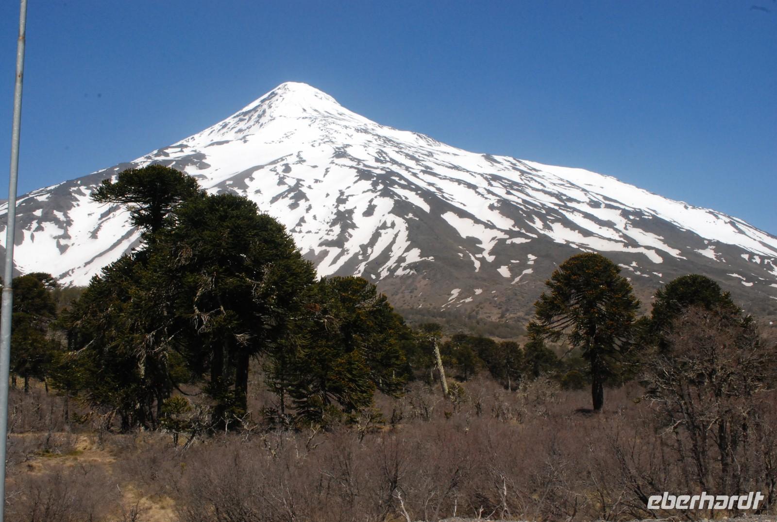 Von hier reisen wir wieder in Richtung Anden und gegen Mittag erreichen wir den Pass Cardenal Antonio Samoré und die argentinisch-chilenische Grenze. Warten, ausfüllen, Schlange stehen und freundlich lächeln reichen leider bei den chilenischen Kontrollen des Landwirtschaftsministeriums nicht aus. Hier liegen kurze Zeit die Nerven blank da wir vergessen hatten, dass man keine Samen - auch nicht von der in Chile endemischen Araukarie - einführen darf. Durch die Überredungskunst von Eric zeigen die Beamten aber doch Einsicht. Von der Grenze fahren wir nun bald durch das herrlich grüne chilenische Seengebiet und hatten den Osorno und die Aschewolke des Puyehue im Blick. Im Restaurant Vogelscheuche lassen wir uns mit Wildschweinbraten, Sauer- und Rotkraut und Vielem mehr verwöhnen und genießen den Nachmittag mit Blick auf den Vulkan im Freien!