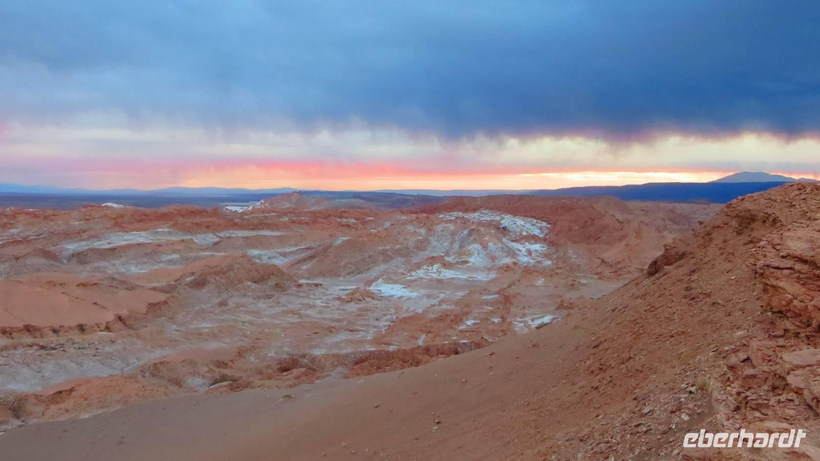 Mit Wasser für die nächsten Tage ausgestattet und alles mit Bedacht machend, da wir ja bereits auf über 2000m waren, hatten wir etwas Zeit zum Ausruhen im Hotel, bevor wir uns am Nachmittag zu einem kleinen Ausflug wieder trafen. Das Mars- und Mondtal standen auf unserem Programm. Durch die bizarre, fast unwirkliche Welt des Marstals spazierten wir etwa eine Stunde, bevor uns Luis wieder abholte und wir in das Mondtal (Valle de la Luna) weiterfuhren. Hier bestaunten wir die Felsformation der drei Marien (und stellten mich als vierte Maria dazu). Der krönende Abschluss des Tages war der unerwartet schöne Sonnenuntergang, den wir von einem Aussichtspunkt bei einem Pisco Sour und kleinen Snacks genossen. Salud!
