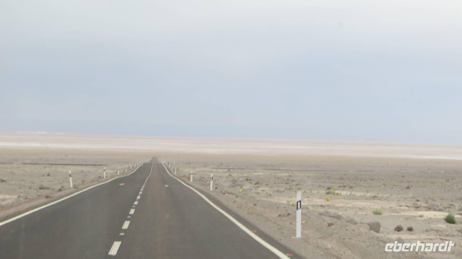 Satt und gestärkt traten wir den Rückweg nach San Pedro an. Wieder hieß es: ein Stück Schotterpiste und dann endlose Weite der Wüste - nur unterbrochen von den schneebedeckten Gipfeln der Berge und Vulkane. Doch bevor wir zum Hotel zurückkehrten, hatten wir noch ein Ziel: den Salzsee Salar de Atacama. Dieser ist der drittgrößte der Welt und bietet zahlreichen Tieren eine Heimat. An der Laguna Chaxas konnten wir Flamingos beobachten und entlang eines kleinen Rundweges die unwirkliche Welt des Salzes bestaunen. Die ungewöhnlichen Wetter- und Wolkenverhältnisse gaben diesem Besuch in der Atacama-Wüste und am Salzsee einen mystischen Beigeschmack.