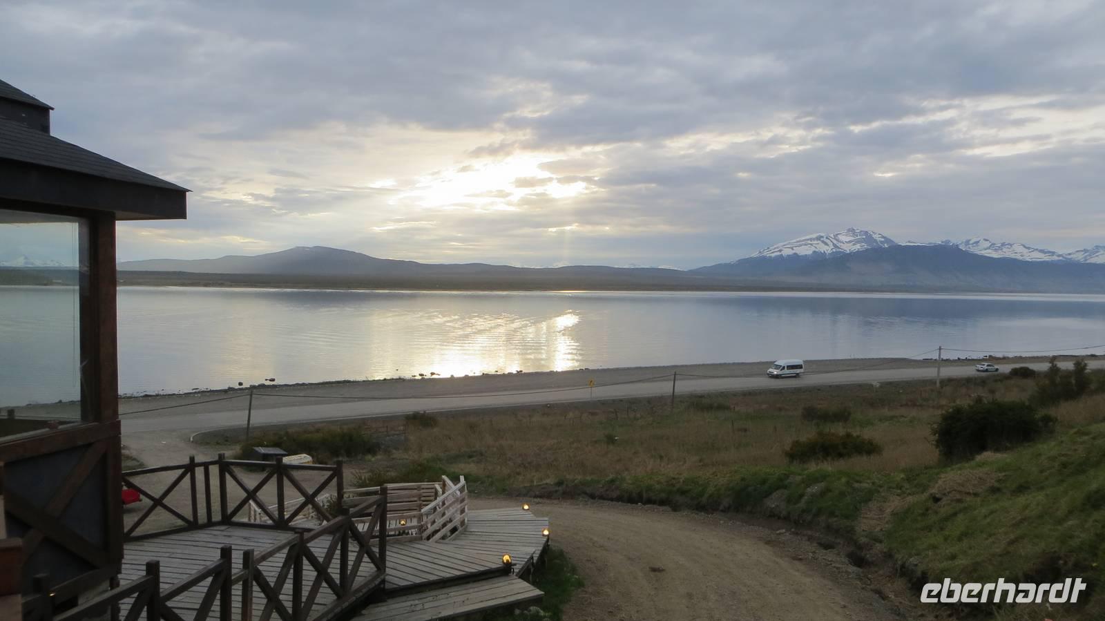 Nach weiteren fast zwei Stunden Fahrt erreichten wir schließlich das Örtchen Puerto Natalas am Seno Ultima Esperanza (bedeutet: Fjord der letzten Hoffnung). Unsere Unterkunft für die nächsten zwei Nächte ist die Weskar Lodge, welche etwas außerhalb, dafür aber mit direktem Blick auf den Fjord, gelegen ist. Bevor wir uns das gute Abendessen mit Kürbissuppe (oder Salat) sowie Lachs und Nachtisch schmecken ließen, hatte jeder, der wollte, noch die Möglichkeit ein wenig spazieren zu gehen und den Ort zu erkunden. Zum Anstoßen bekamen wir auch an diesem Abend das Nationalgetränk, den Pisco Sour serviert - und der chilenische Trinkspruch dazu klappt von Mal zu Mal bei allen besser! So mag man es kaum glauben, aber wir „feiern" in diesen Tagen bereits Bergfest unserer Chilerundreise!