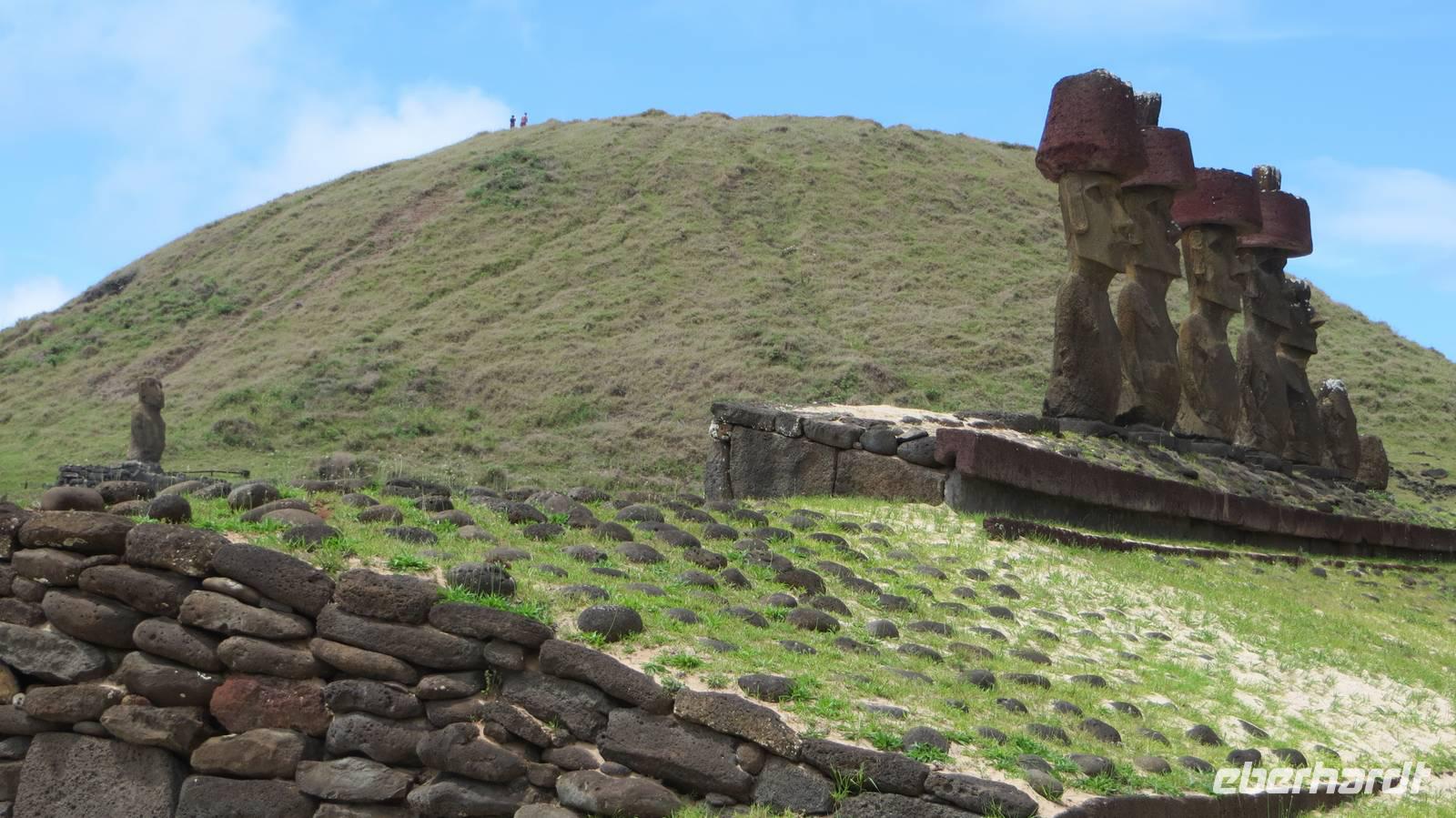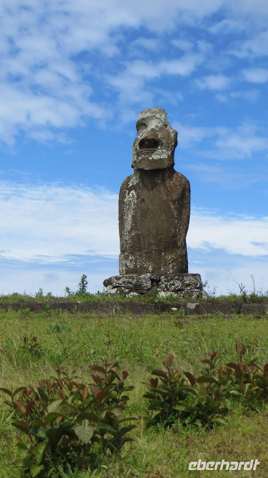 Auf Regen folgt Sonnenschein. Gut, dass wir Gruppe Sonnenschein sind, denn heute konnten wir unserem Namen wieder alle Ehre machen. Ausgeschlafen, gut gelaunt und frisch gestärkt vom Frühstück trafen wir uns halb Zehn mit Sabine für unseren ersten Ausflug auf der Insel. Zunächst fuhren wir gar nicht so weit, um die restaurierte Stätte Tahai zu bestaunen. Hier befinden sich mehrere Ahu (Plattformen) mit Moais sowie Grundrisse von Häusern, ein Hühnerstall und eine Hafenrampe. Sabine erzählt uns von den vielen ungelösten Rätseln und Theorien, an denen die Wissenschaftler bis heute tüfteln. Uns beeindrucken die Moais schon sehr. An diesem Ort sind insgesamt sieben Steinkolosse zu bestaunen. Wir finden hier den mit fünf Moai am mächtigsten wirkenden Ahu Vai Uri, sowie den Ahu Tahai und den Ahu Ko te Riku, welcher als einziger nachgebildete Augen hat. Weiter ging es dann von der Küste etwas ins Inselinnere zum Ahu Akivi, zu den sieben Moai, die als einzige auf das Meer und nicht auf das Land schauen. Wieder erfahren wir von Legenden, die man sich lange erzählte und von neuesten Theorien, warum die Moai (wieder) stehen, wie sie stehen. Logisch erscheint uns durchaus, dass es eine Art Kalender gewesen sein kann, und somit die Gesichter nach Winter- und Sommersonnenwende ausgerichtet waren/sind. Unser dritter Halt war dann am Steinbruch Puna Pau, von wo die rötlichen Kopfbedeckungen (Pukao) stammen. Bevor wir nach Hango Roa zurückkehrten, hielten wir noch am Huri A Urenga, einem einzelnen Moai, der auch in Richtung der Sonnenwende ausgerichtet war.