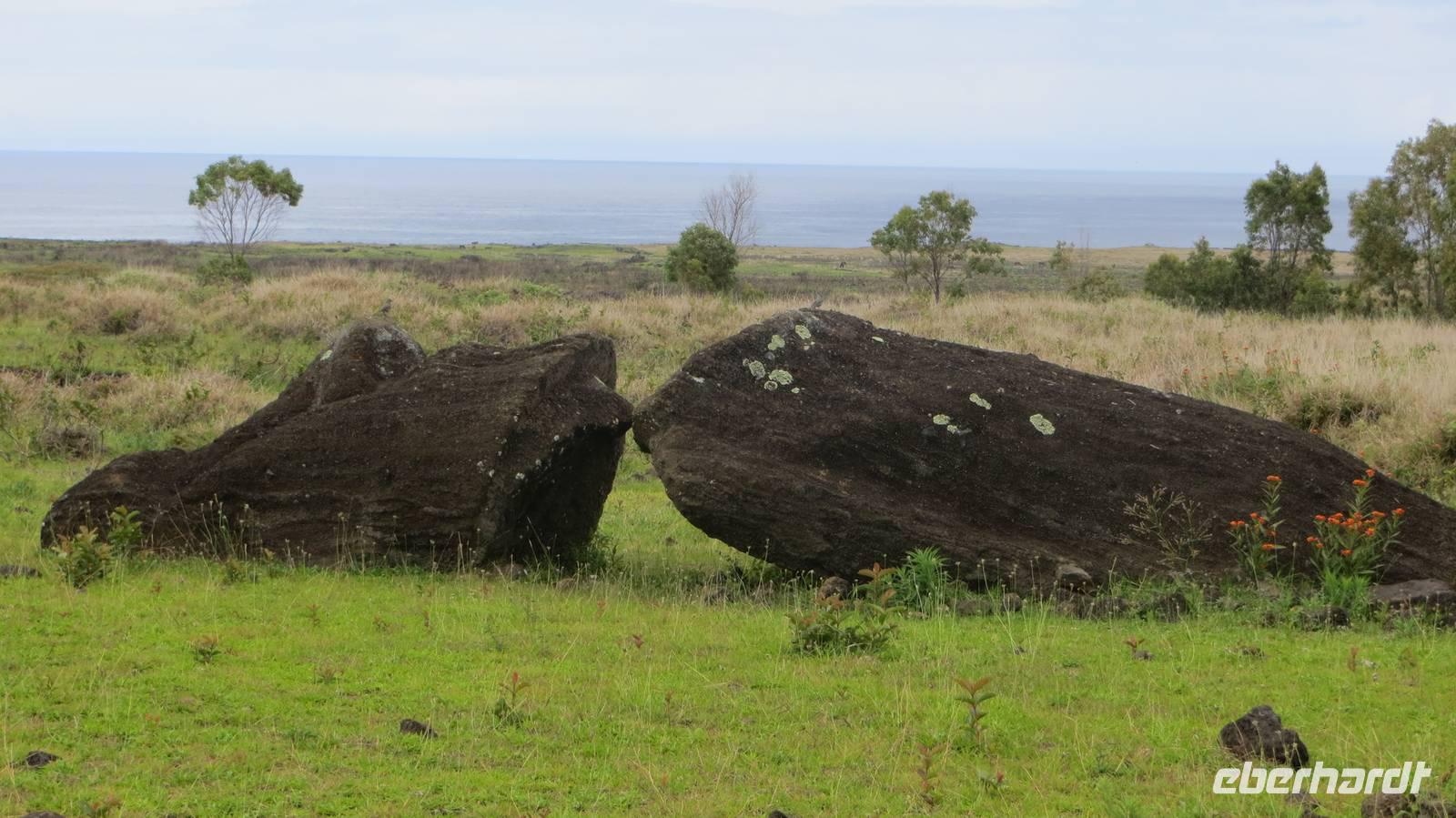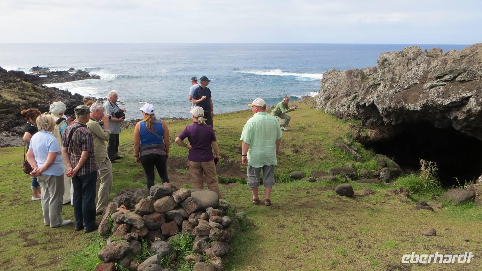 Obwohl wir heute am Morgen mit einer englischsprachigen Reisegruppe um das Frühstück konkurrieren mussten, konnten wir gestärkt in den Tag starten. Sabine und Petero holten uns wieder am Hotel O'Tai ab und fuhren heute mit uns zur Ostküste, nachdem wir gestern die Westküste erkundet hatten. Unseren ersten Halt machten wir schon nach kurzer Fahrt am Vaihu, einem umgestürzten und nicht restaurierten Moai. Die Brandung des Pazifiks war für uns ebenso interessant, wie der Moai selbst. Am Ahu Akahanga ließen wir das Umu vom Vorabend nochmals gedanklich Revue passieren, denn wir konnten einen typischen Erdofen der Rapa Nui bestaunen. Auch eine Wohn-Höhle, sowie ein umgestürzter Moai ohne Augenhöhlen und ein Moai-Kopf konnten hier besichtigt werden. Ein tolles Gruppenfoto schossen wir bei unserem nächsten Stopp am Ahu Tongariki, eine 220m lange Kultstätte mit 15 Statuen, die uns alle sehr beeindruckte und die größte auf der Insel ist! Unweit dieses Ahus findet sich der Rano Raraku, der Steinbruch, wo alle Moai's ihren Ursprung fanden. Etwa 400 Figuren warteten hier entweder auf ihre Abholung oder Fertigstellung. Nachdem wir entlang der Pfade und zum kleinen Kratersee des Rano Raraku spaziert waren, gab es ein Mittagspicknick - bestehend aus Fleisch, Hühnchen, Salat oder Fisch mit Reis. Im Anschluss besuchten wir den „Nabel der Welt" sowie den Ahu Te Pito Kura, die sich schon an der Nordküste der Insel befinden. Mit den vielen Eindrücken im Gepäck ging es weiter nach Anakena. Hier verweilten wir reichlich zwei Stunden zum Baden und Entspannen. Mit den in den 60'er Jahren angepflanzten Palmen kam ein Hauch von Südsee-Stimmung auf. Die Wellen hatten es jedoch ganz schön in sich, wie ein anderer Tourist schmerzlich feststellen musste und allen anderen Anwesenden einen großen Schrecken einjagte. Gut erholt und entspannt, traten wir die Heimfahrt zurück ins Dorf an. Immer wieder hatten wir Wolken über die Insel ziehen sehen, da wo wir waren, war jedoch immer Sonnenschein. Nur während der Rückfahrt erlebten wir einen kräftigen Regenschauer, der aber bis ins Dorf schon wieder vorbei war. Den Abend ließen wir bei einem sehr guten Abendessen im Restaurant Kaimana Inn ausklingen. Eine gesellige Abendgestaltung mit Malprogramm und Gesellschaftsspielen ließ uns wieder viel Lachen!