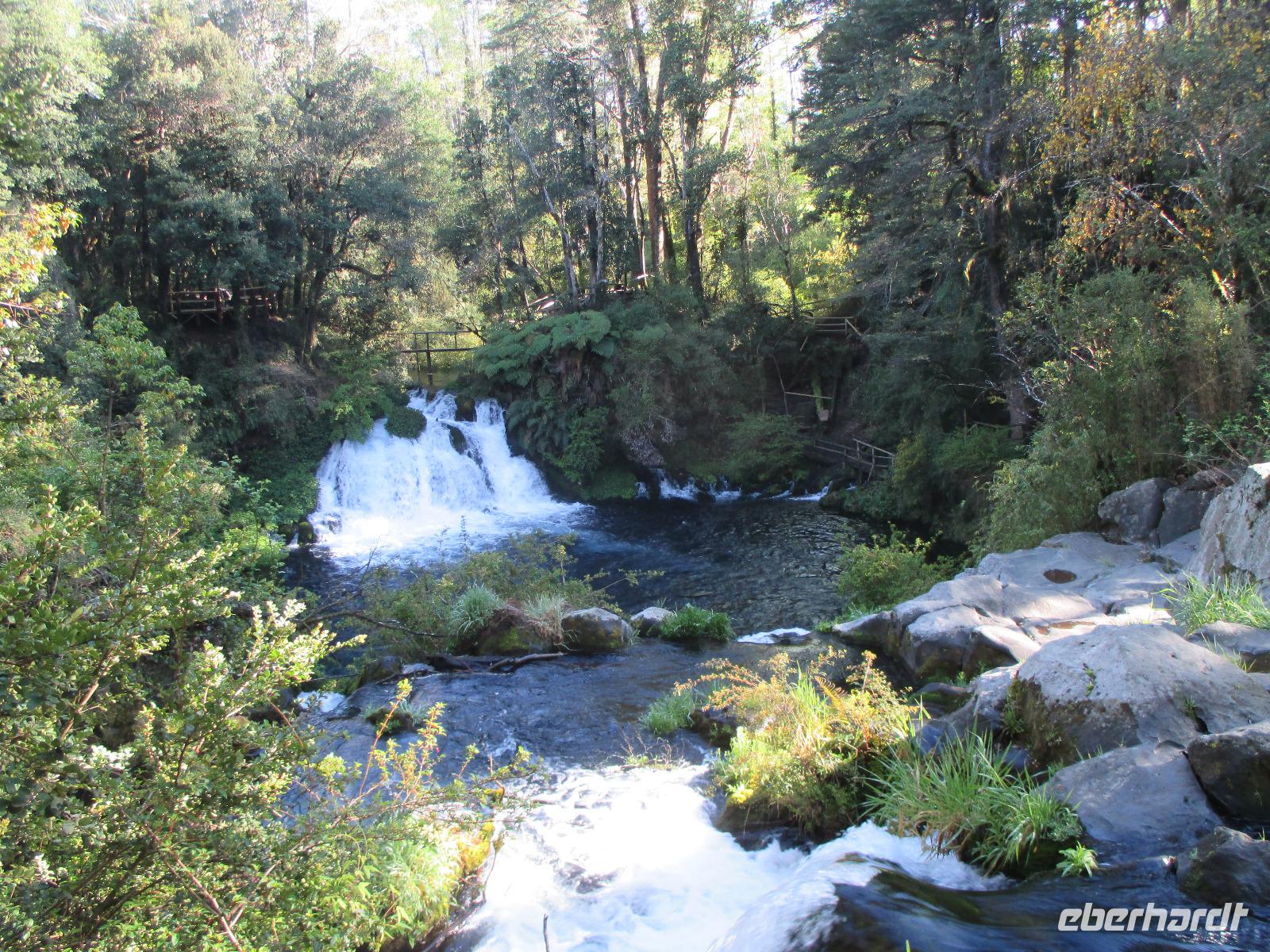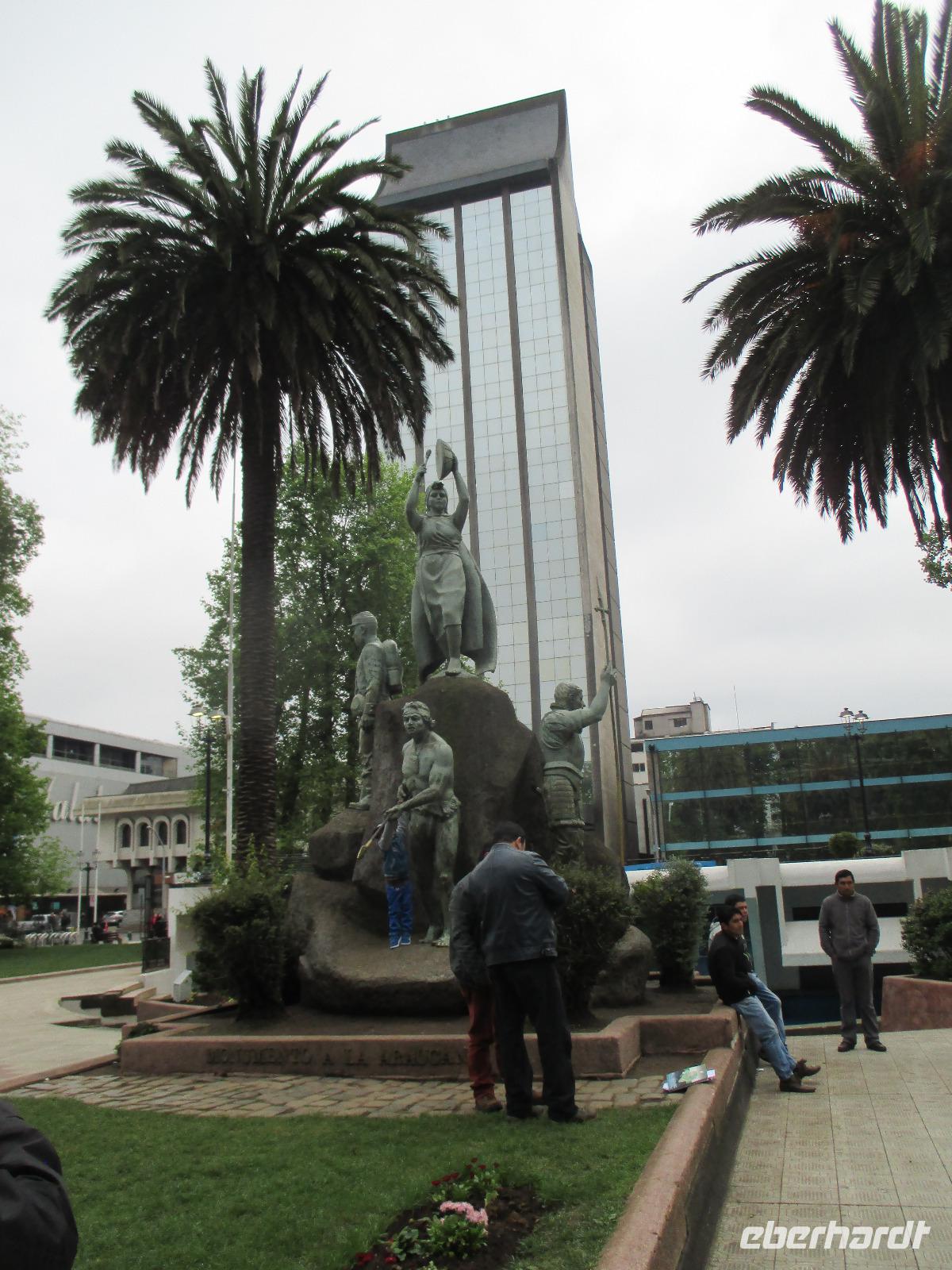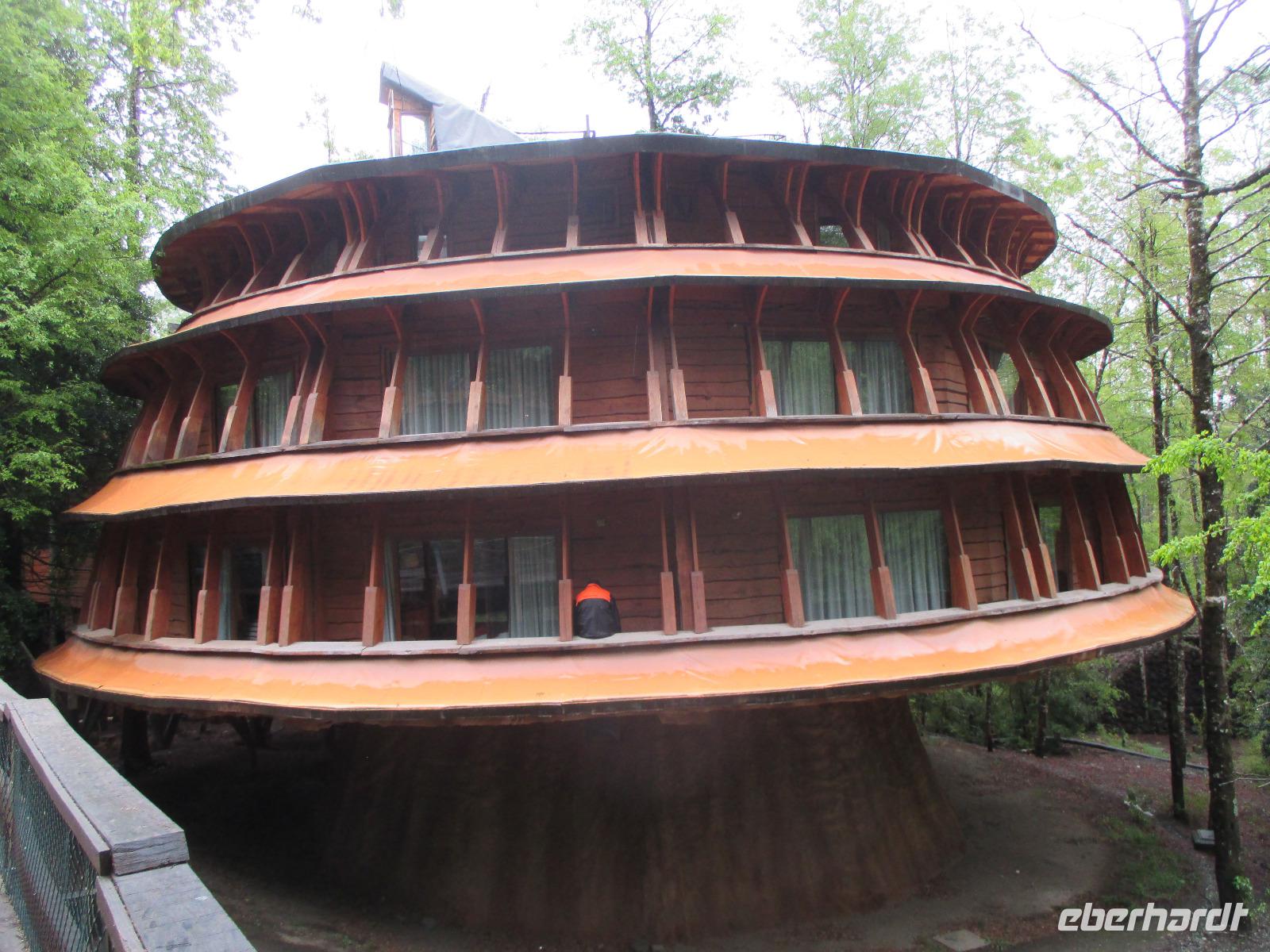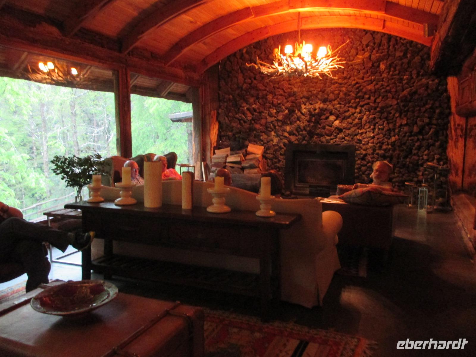 Der Grund für unsere Übernachtung am Flughafen ist unser Flug am Morgen nach Temuco. Nach rund einer Stunde Flug erreichen wir Temuco, in Mittelchile gelegen. Hier erwarten uns bereits unsere zwei Busfahrer Fransisco und Samuel, die besonderen Spaß haben, sich mit dem Bus und anderen Naturhighlights zu fotografieren;-). Unser Gepäck ist verladen und so fahren wir in die rund halbe Stunde Fahrzeit entfernte Stadt Temuco. Am Hauptplatz steigen wir uns und Eric erklärt uns am Denkmal die Geschichte der Mapuche. Danach haben wir freie Zeit um einen Kaffee zu trinken, die Stadt auf uns wirken zu lassen oder einige Besorgungen im Supermarkt zu erledigen. Zurück am Bus beobachten wir eine Demonstration von Schülern, die für ein besseres Bildungssystem auf die Straße gehen. Als sie uns Touristen entdecken winken sie uns nett zu und fragen, woher wir kommen. Mit dem Bus geht es weiter in Richtung Süden. Eine kleine Pause legen wir in Pangapuill ein. Um uns ein wenig die Beine zu vertreten spazieren wir von der hiesigen Kirche bis runter zum See. Hier ist ein kleiner Spielplatz mit einigen Sportgeräten. Beim Wippen werden wir wieder zu Kindern und die Betätigung an den Sportgeräten bringt unsere müden Knochen wieder in Schwung;-). Weiter geht es in Richtung Huilo Huilo Bioreservat. Hier unternehmen wir eine kleine Wanderung zum Huilo Huilo sowie zum Puma-Wasserfall. Durch den einsetzenden Regen ist der Weg ziemlich matschig aber dennoch macht dieser kleine Spaziergang Spaß da er uns mitten durch die Natur führt. Wir checken im einmaligen und wundervollen Baumhaushotel Nothofagus ein. Seine ganze Form ist schon sehr speziell. Im Inneren ist alles mit Holz ausgestattet, leise Musik in den öffentlichen Gängen beruhigt und unsere Zimmer sind mit großen Panoramafenstern ausgestattet, die uns am kommenden Morgen mit einem tollen Ausblick aufwachen lassen. Wir nutzen die Zeit, um das Hotel komplett anzuschauen, auch mit dem angrenzenden Vulkanhotel. Im Kaminzimmer werden wir schließlich zu einem Willkommensdrink eingeladen, bevor unser Abend bei einem Abendessen vom Buffet ausklingt.