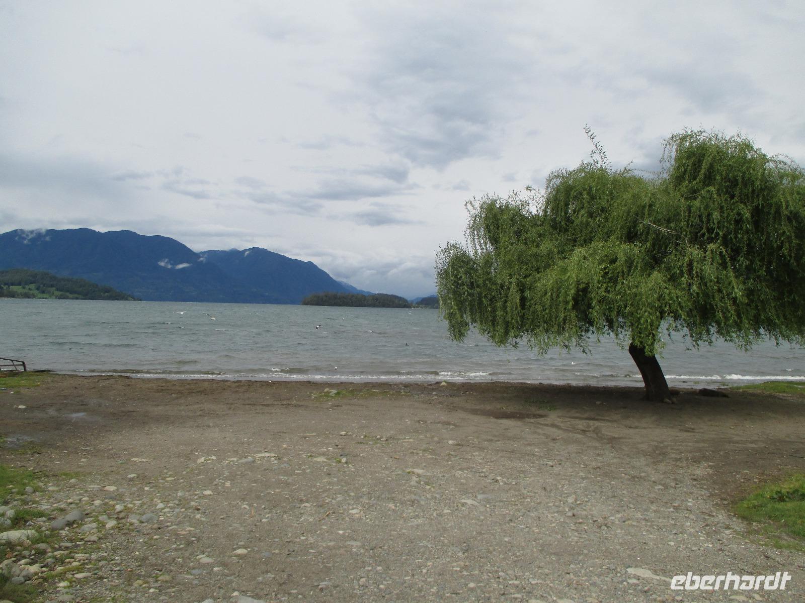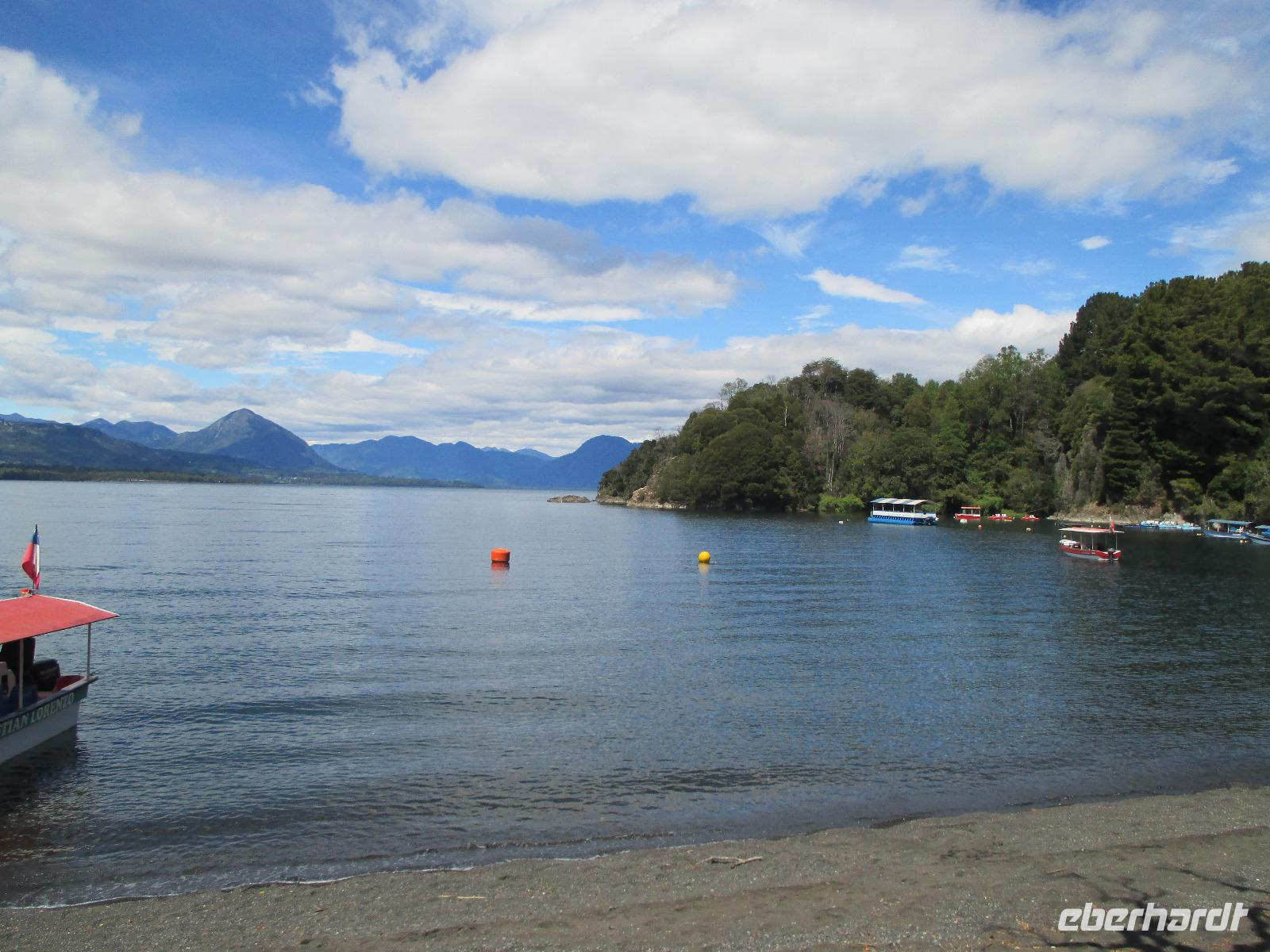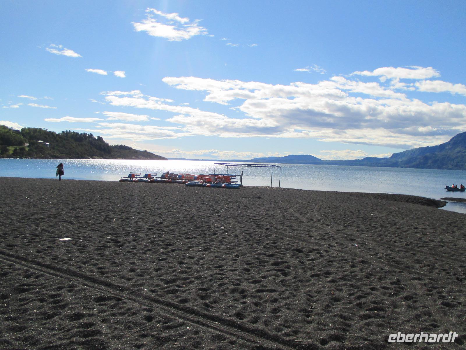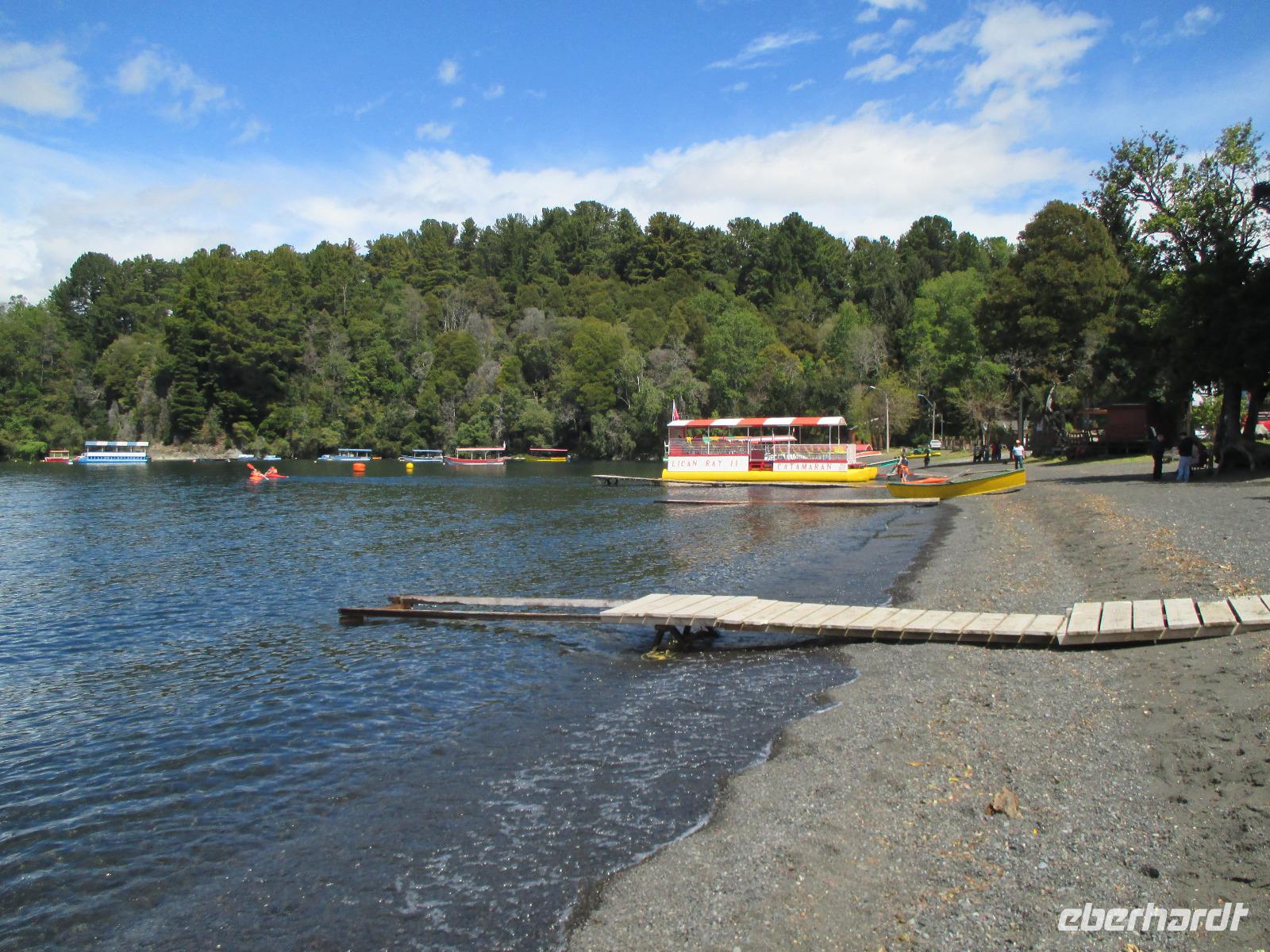 Heute meint es Eric ja wirklich gnädig mit uns. Wir dürfen ausschlafen und uns lange beim Frühstück aufhalten den unsere Abfahrt ist auf 10:00 Uhr festgelegt. Wir fahren kurz im Bus in das nächste Dorf nach Puerto Fuy, wo wir ja eigentlich mit der Fähre nach Argentinien übersetzen sollen. Da diese aber aufgrund von Wartungsarbeiten außer Betrieb ist, haben wir das Programm umstellen müssen. Aber ein kurzer Fotostopp auf den See mit der angedockten Fähre ist trotzdem drin. Der See wirkt sehr beruhigend und lässt einige Gäste von einem hübschen Sommerferienhaus träumen. Dann fahren wir ein Stück weiter bevor wir erneut aussteigen um einen kleinen Spaziergang zu unternehmen. Unser Ziel ist abermals der Pumawasserfall, nur diesmal von der anderen Seite aus. Unterwegs zeigt uns Eric sogar Kohle, die hier am Wegesrand zu sehen ist. Nachdem wir uns ausreichend die Füße vertreten haben, geht es dann in Richtung Licanray, wo wir unsere Mittagspause verbringen. Die einem mit Bierchen am See, die anderen in einem Restaurant bzw. mit einer Empanada aus dem Supermarkt. Unser nächstes Ziel ist Villarica mit dem gleichnamigen Vulkan, dessen Spitze mit Schnee bedeckt ist. Wir halten am See um ein (oder auch mehrere) Fotos zu schießen. Die Sonne strahlt wie immer vom Himmel und färbt die ganze Umgebung in kräftige Farben. Damit ist besonders die Flora und Fauna wunderschön anzuschauen. Samuel und Fransisco bringen uns entlang des Sees, an dem sich viele Ferienhäuser und Cabanas befinden, bis nach Pucon. Sie lassen uns in der Stadt aussteigen und geschlossen laufen wir in der Post auf um die notwendigen Briefmarken für unsere Postkarten zu erwerben. Die Dame in der Post ist leider nicht sehr nett und zum ersten Mal auf der gesamten Reise wird Eric wird wirklich ein wenig böse. Ihr Problem ist einfach, dass sie kein Wechselgeld hat und voraussetzt, dass wir alle passend bezahlen. Aber zum einen kann man das einfach nicht voraussetzen und zum anderen hätte es die Dame ja auch netter formulieren können. Wir werden uns übrigens einig und alle bezahlen bis auf den letzten chilenischen Peso passend. Die freie Zeit, die wir nun haben, nutze ich, mit den einigen netten Herren aus meiner Gruppe bis zum See zu laufen. Dort erwartet uns das nächste Highlight: die Sonne perlt ihre Strahlen golden auf der Oberfläche des Sees ab und davor spielt ein „leicht" betrunkener Brite mit seiner Gitarre Lieder, wahrscheinlich aus seiner Jugend. Obwohl, spielen ist wohl auch leicht übertrieben, grölen trieft es wohl eher. Aber das aus vollster Überzeugung und das soll natürlich auch belohnt werden. Es wandern einige Münzen aus meinem Portemonnaie in seinen Hut. Wir treffen uns alle zusammen wieder am Bus und fahren in unser nahegelegenes Hotel. Ein gemeinsames Abendessen rundet unseren heutigen Tag ab.