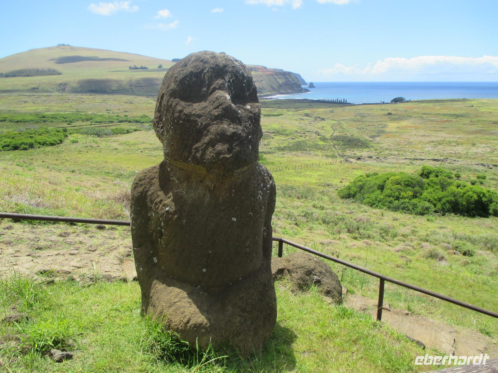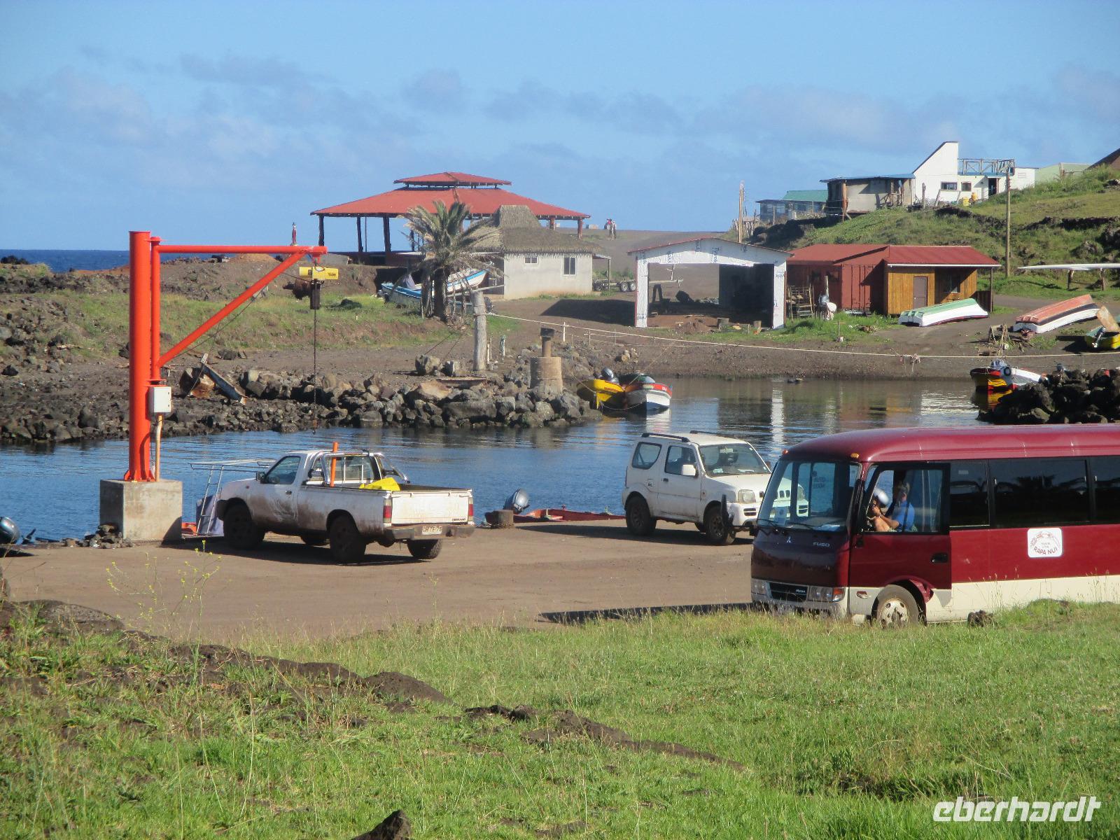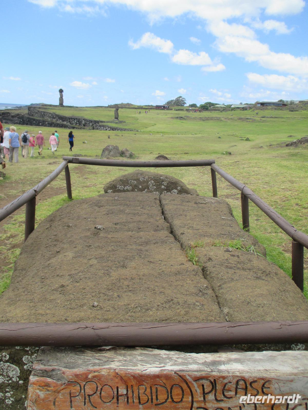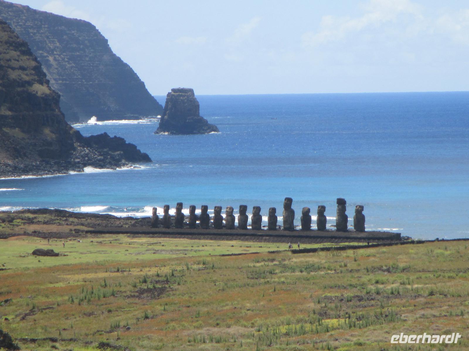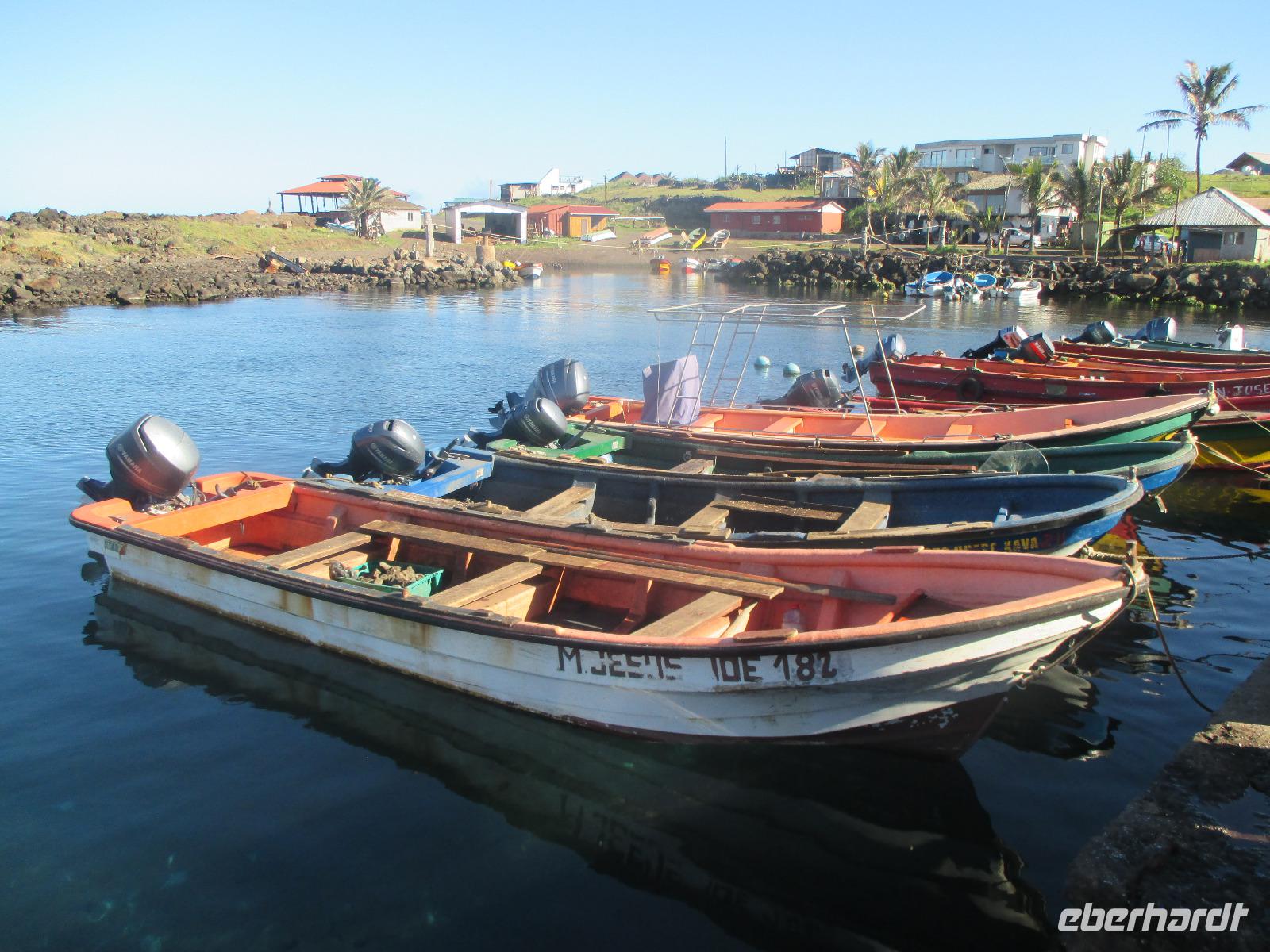 Bevor wir den heutigen Nachmittag frei gestalten können, unternehmen wir am Vormittag noch einen Halbtagesauflug, der uns zunächst in den Hafen von Hanga Roa führt. Hier legen unter anderem die Tenderschiffe der Kreuzfahrer an und die Fischer der Insel gehen hier mit ihrem Fang an Land. Es steht dann auch bereits ein Mittelsmann am Anleger an, der ihnen den Fisch abkauft um diesen an die Restaurants weiterzuverkaufen. Leider ist es somit den Inselbewohnern erschwert, preislich erschwinglich an guten Fisch zu gelangen. Wir sehen hier kleine Fische und Schildkröten, die wissen, dass hier die Fischer sind und sie gut zufüttern. Nachdem wir uns den einzigen Moai im Hafen angeschaut haben, der als einer der letzten in den 90iger Jahren restauriert wurde, fahren wir entlang des Kraters nach Vinapu. Hier besichtigen wir eine Mauer als auch einen Moai aus rotem Tuffstein. Dieser ;Moai ist der einzige weibliche, was man an die Brüsten erkennen würde. An diesem Moai ist auch noch der Bauchnabel erkennbar, was bei den anderen schon nicht mehr so ist. Malena zeigt uns noch das Kraftwerk der Insel und schon geht es weiter. Wir halten oberhalb von Hanga Roa und haben somit die Möglichkeit, die Fluglandebahn in ihrer gesamten Länge zu sehen. Nach unserem Besuch am Kratersee des Vulkan Raro Kau, ein Süßwasserspeicher, in dem auch das Wasser für die Hotels aufbereitet wird, bringt uns Luis zur Zeremonialsätte Orongo. Hier vorgelagert ist die Vogelinsel, um der auch der Vogelmannkult herrscht. Malena erzählt uns die gesamte Geschichte dazu und was für uns sehr erstaunlich ist, dass diese noch nicht mal sehr alt ist. Der letzte Vogelmannwettbewerb fand erst im jahr 1867 statt. Nachdem wir noch die Häuser angeschaut sowie einige Bilder im Eingangsbereich der Stätte angeschaut haben, fahren wir zurück nach Hanga Roa. Der Nachmittag steht uns nun frei. Wir nutzen diesen zum Mittagessen oder zwei meiner Gäste gehen sogar tauchen. Andere wiederum bummeln durch die Hauptstraße des Ortes oder ruhen sich am hoteleigenen Pool aus.
