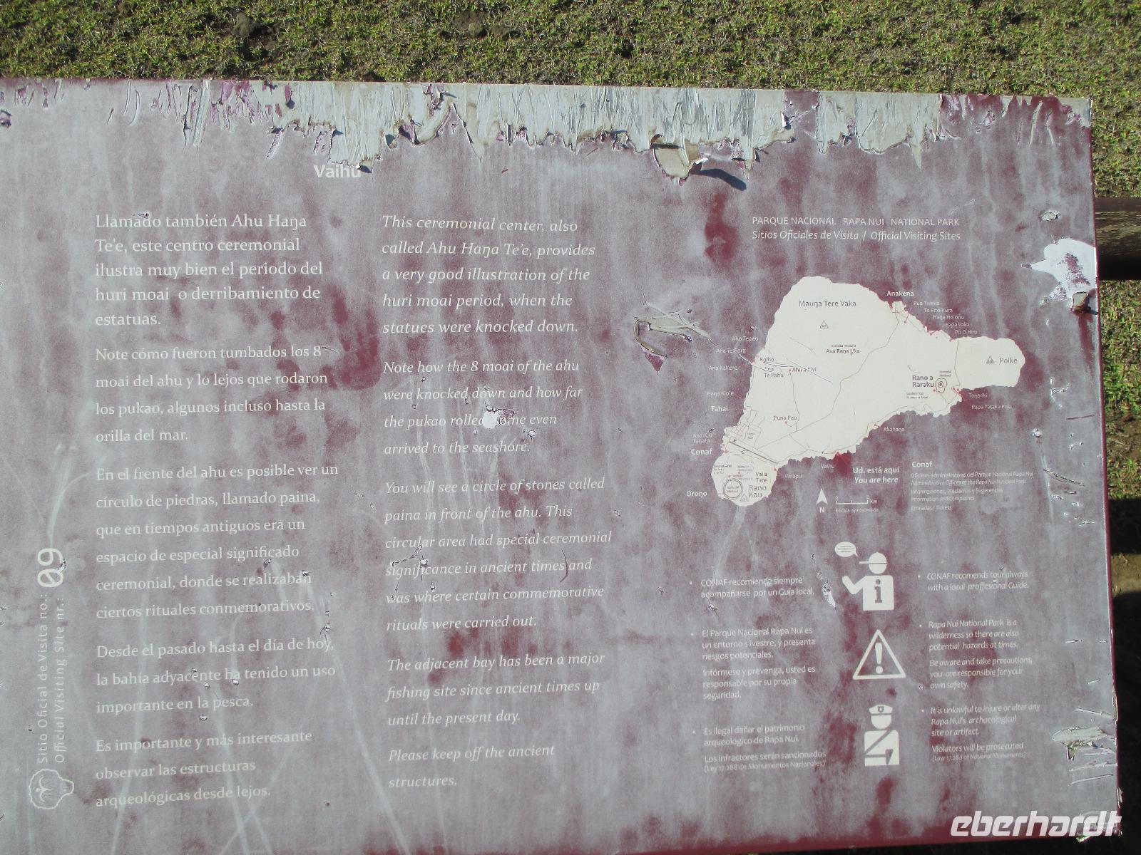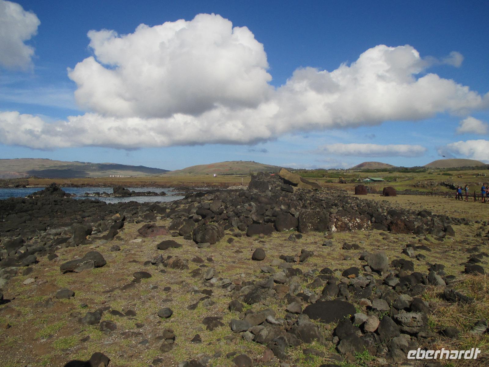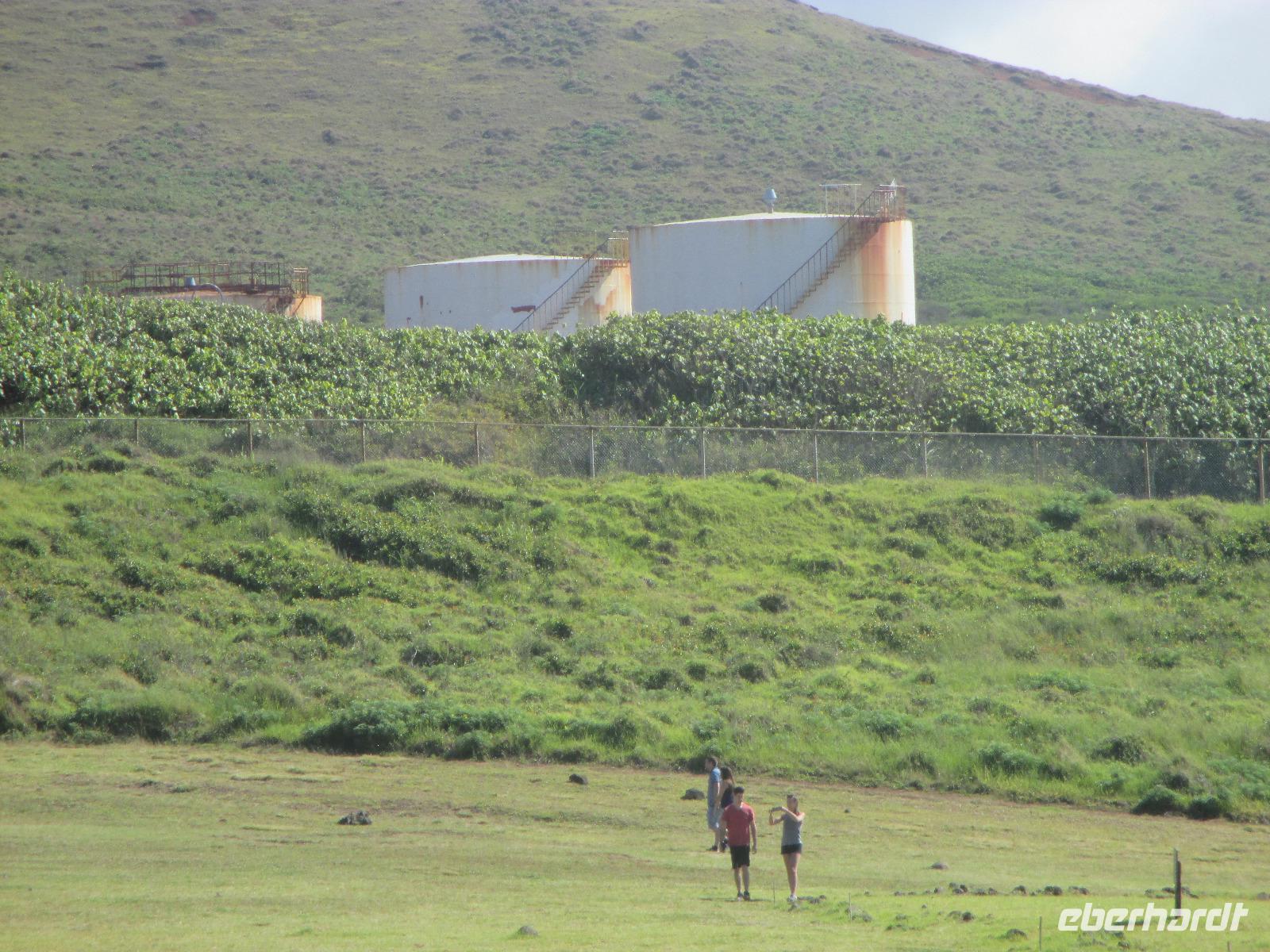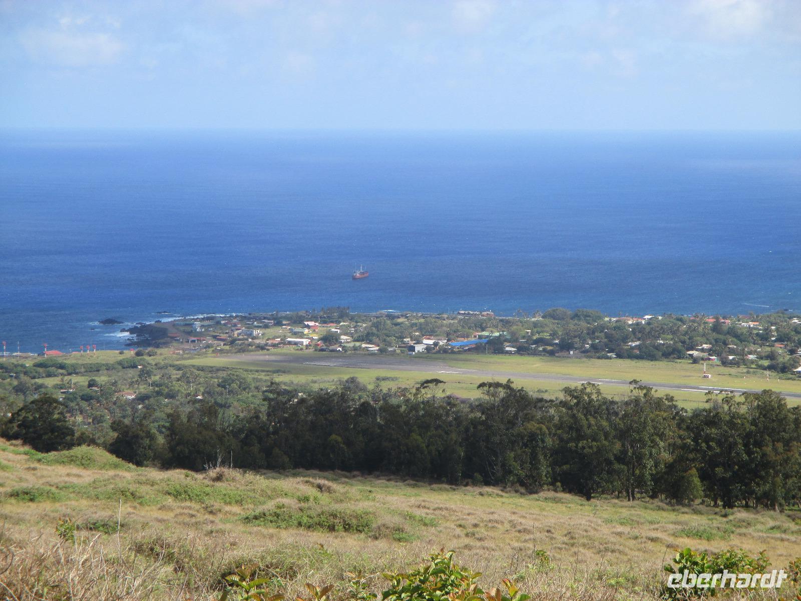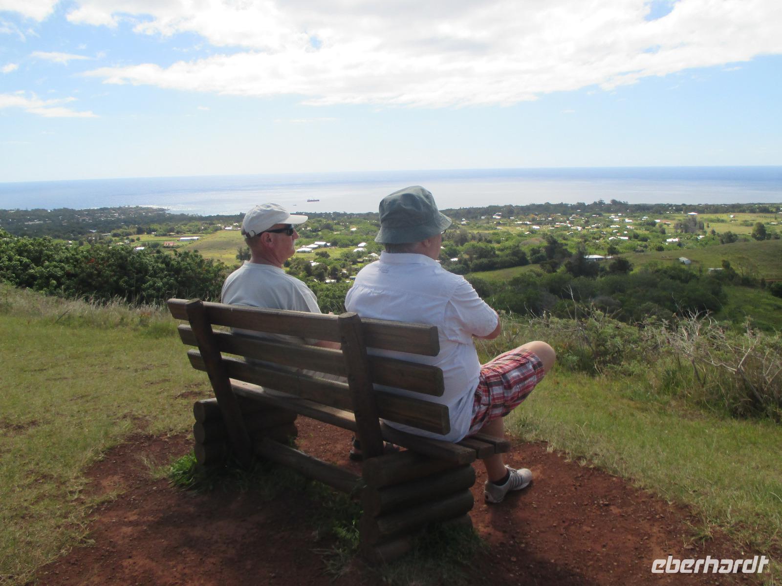 Bevor wir den heutigen Nachmittag frei gestalten können, unternehmen wir am Vormittag noch einen Halbtagesauflug, der uns zunächst in den Hafen von Hanga Roa führt. Hier legen unter anderem die Tenderschiffe der Kreuzfahrer an und die Fischer der Insel gehen hier mit ihrem Fang an Land. Es steht dann auch bereits ein Mittelsmann am Anleger an, der ihnen den Fisch abkauft um diesen an die Restaurants weiterzuverkaufen. Leider ist es somit den Inselbewohnern erschwert, preislich erschwinglich an guten Fisch zu gelangen. Wir sehen hier kleine Fische und Schildkröten, die wissen, dass hier die Fischer sind und sie gut zufüttern. Nachdem wir uns den einzigen Moai im Hafen angeschaut haben, der als einer der letzten in den 90iger Jahren restauriert wurde, fahren wir entlang des Kraters nach Vinapu. Hier besichtigen wir eine Mauer als auch einen Moai aus rotem Tuffstein. Dieser ;Moai ist der einzige weibliche, was man an die Brüsten erkennen würde. An diesem Moai ist auch noch der Bauchnabel erkennbar, was bei den anderen schon nicht mehr so ist. Malena zeigt uns noch das Kraftwerk der Insel und schon geht es weiter. Wir halten oberhalb von Hanga Roa und haben somit die Möglichkeit, die Fluglandebahn in ihrer gesamten Länge zu sehen. Nach unserem Besuch am Kratersee des Vulkan Raro Kau, ein Süßwasserspeicher, in dem auch das Wasser für die Hotels aufbereitet wird, bringt uns Luis zur Zeremonialsätte Orongo. Hier vorgelagert ist die Vogelinsel, um der auch der Vogelmannkult herrscht. Malena erzählt uns die gesamte Geschichte dazu und was für uns sehr erstaunlich ist, dass diese noch nicht mal sehr alt ist. Der letzte Vogelmannwettbewerb fand erst im jahr 1867 statt. Nachdem wir noch die Häuser angeschaut sowie einige Bilder im Eingangsbereich der Stätte angeschaut haben, fahren wir zurück nach Hanga Roa. Der Nachmittag steht uns nun frei. Wir nutzen diesen zum Mittagessen oder zwei meiner Gäste gehen sogar tauchen. Andere wiederum bummeln durch die Hauptstraße des Ortes oder ruhen sich am hoteleigenen Pool aus.