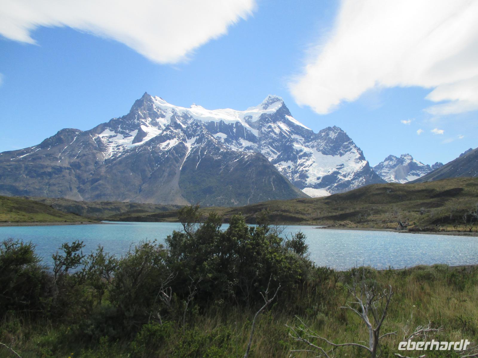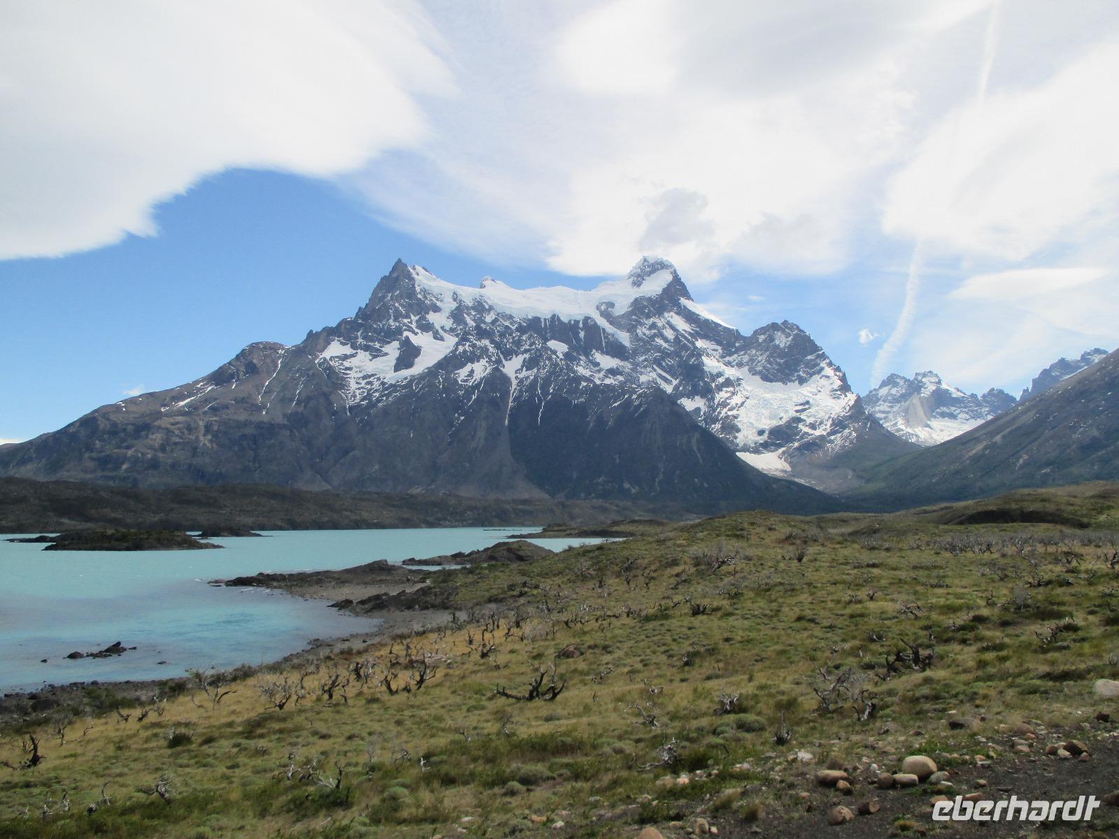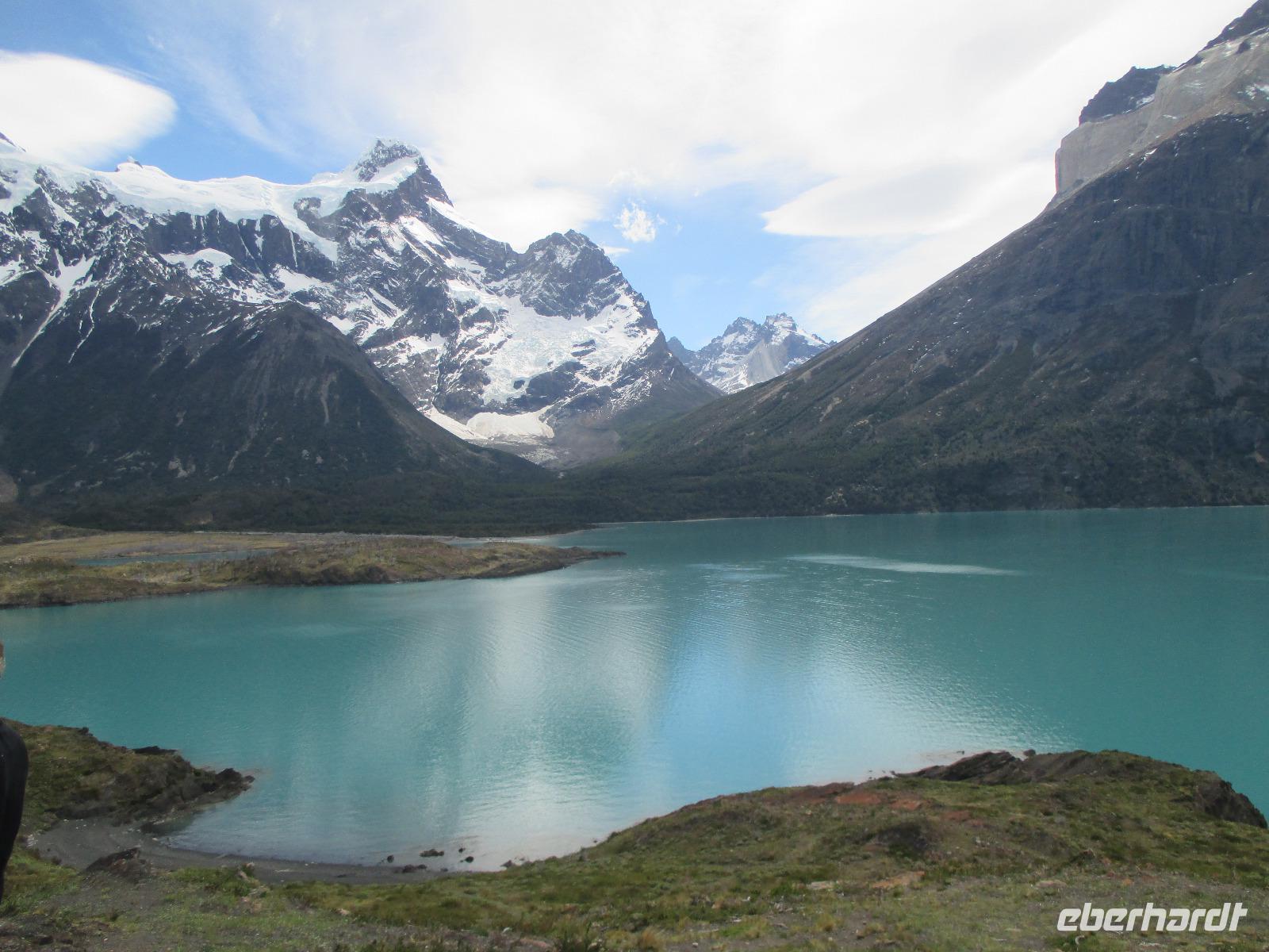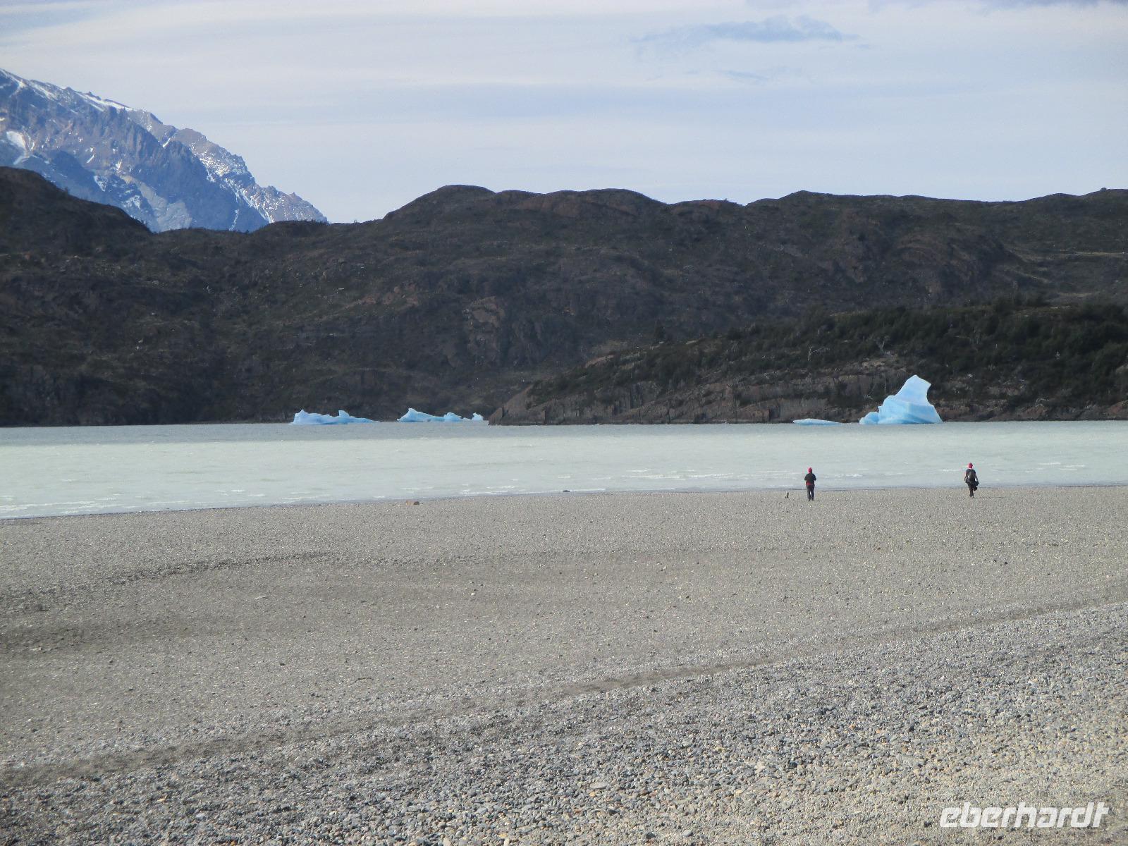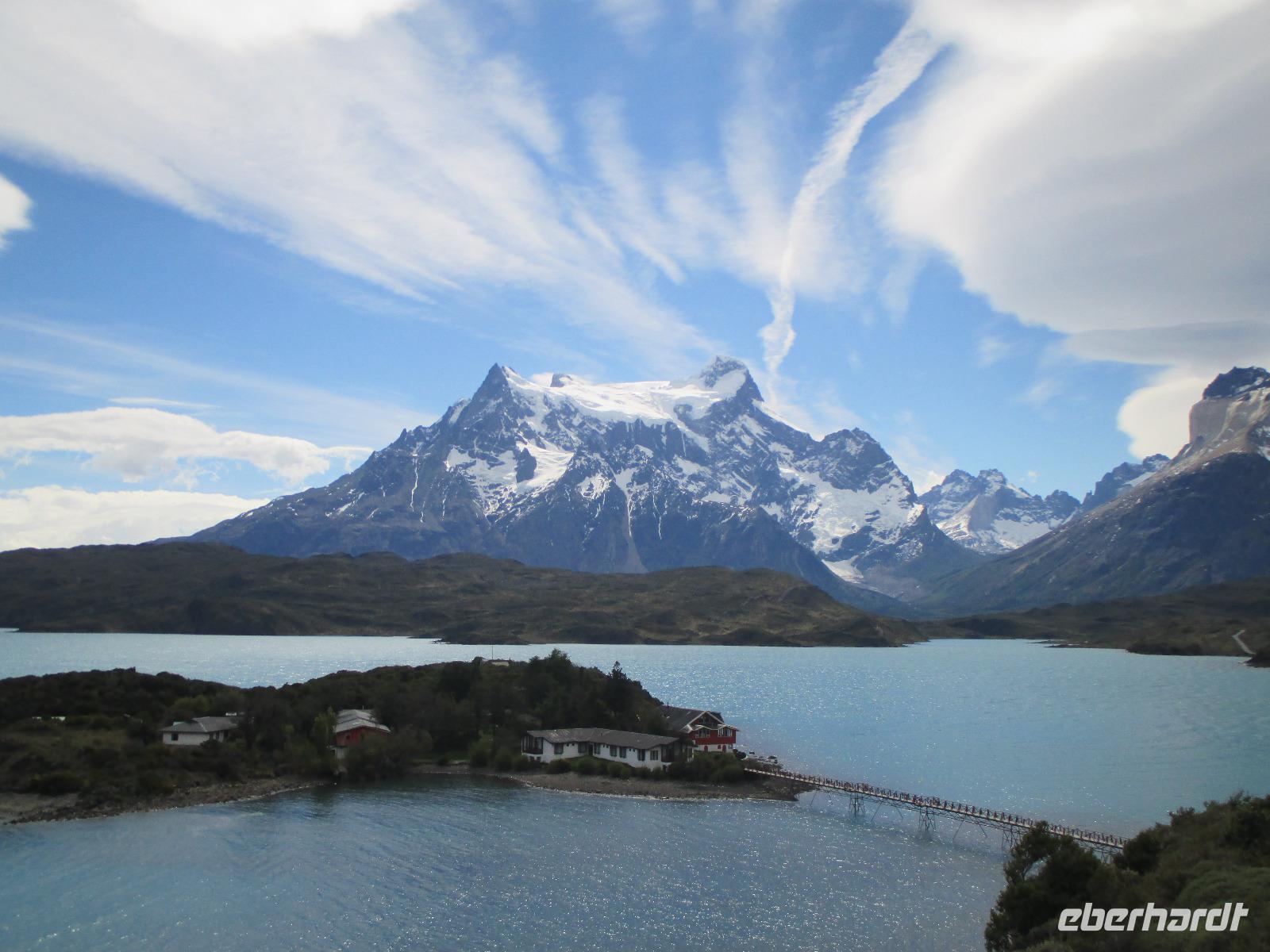 Nach dem Frühstück erleben wir ein weiteres Highlight auf unserer Reise: wir besuchen den Nationalpark Torre del Paine. Zunächst trennen uns jedoch noch 150 Kilometer vom Eingang des Nationalparks. Nach rund einer Stunde Fahrt machen wir an einem Souvenirladen einen kurzen Stopp, wo wir uns unter anderem mit Wasser für den Tag als auch mit Kaffee für den Moment eindecken. Danach geht es weiter in Richtung Nationalpark. Noch bevor wir den Eingang zum Nationalpark erreichen, haben wir mit einem Fotostopp die Möglichkeit, das imposante und bekannte Bergmassiv zu knipsen. Und auch heute haben wir wieder das beste Glück mit dem Wetter: die Hörner präsentieren sich uns wolkenlos. Also gleich die Fotoapperate bereithalten bevor es sich der Wettergott noch anders überlegt. Weiter in Richtung Eingang begegnen uns Nandus und Guanakos. An einem der zahlreichen Sees halten wir widerum für einen Fotostopp und das gewaltige Bergmassiv spiegelt sich auf der Oberfläche des Sees wieder. Am Eingang zahlt Eric für uns den Eintritt während wir an einem Aussichtspunkt weitere Blicke auf das Massiv bestaunen oder die Pause für die innere Harmonie nutzen. Immer wieder halten wir an, um Fotos schießen zu können. An einem kleinen Parkplatz steigen wir aus, um eine Wanderung zum Lago Nordenskjöld zu unternehmen. Der erste Punkt dieser Wanderung erreichen wir bereits nach wenigen Minuten: einen Wasserfall, der im Lago Pehoé mündet. Weiter geht es über Stock und Stein und nach rund 45 Minuten bei herrlichstem Sonnenschon und Ausblick erreichen wir den Lago Nordenskjöld. Hier ruhen wir uns aus und lassen die wunderschöne Natur auf uns wirken. Wir packen unsere Lunchpakete aus und machen nun eine ausgebiege Rast. Im Hintergrund hören wir, wie Lawinen den Gletscher hinab poltern. Danach geht es den gleichen Weg wieder zurück und wir machen noch einen Fotostopp oberhalb des Lago Pehoé mit dem Hostal Pehoe. Unser Fahrer Josè fährt uns bis zum Parkplatz von Lago Grey. Über eine wacklige Hängebrücke und einem kleinen Waldstück erreichen wir den Strand. Auf der Wasseroberfläche spiegelt sich die Sonne wider und in der Ferne sehen wir die Ausläufer des Grey-Gletschers. Wir spazieren entlang des Strandes bis Eric endlich eine Eisschole am Strand erblickt. Nur leider haben wir keinen Whisky parat. Oder doch???? Na klar haben wir. Nach dem Austeilen der Becher und dem Verteilen von Whisky und Eis stoßen wir mit unserem Whisky on the rocks an. Langsam müssen wir uns auf den Rückweg machen - über den Ausgang Serrano fahren wir über Schotterpiste und asphaltierte Straße zurück nach Puerto Natales zu unserer Weskar Lodge.