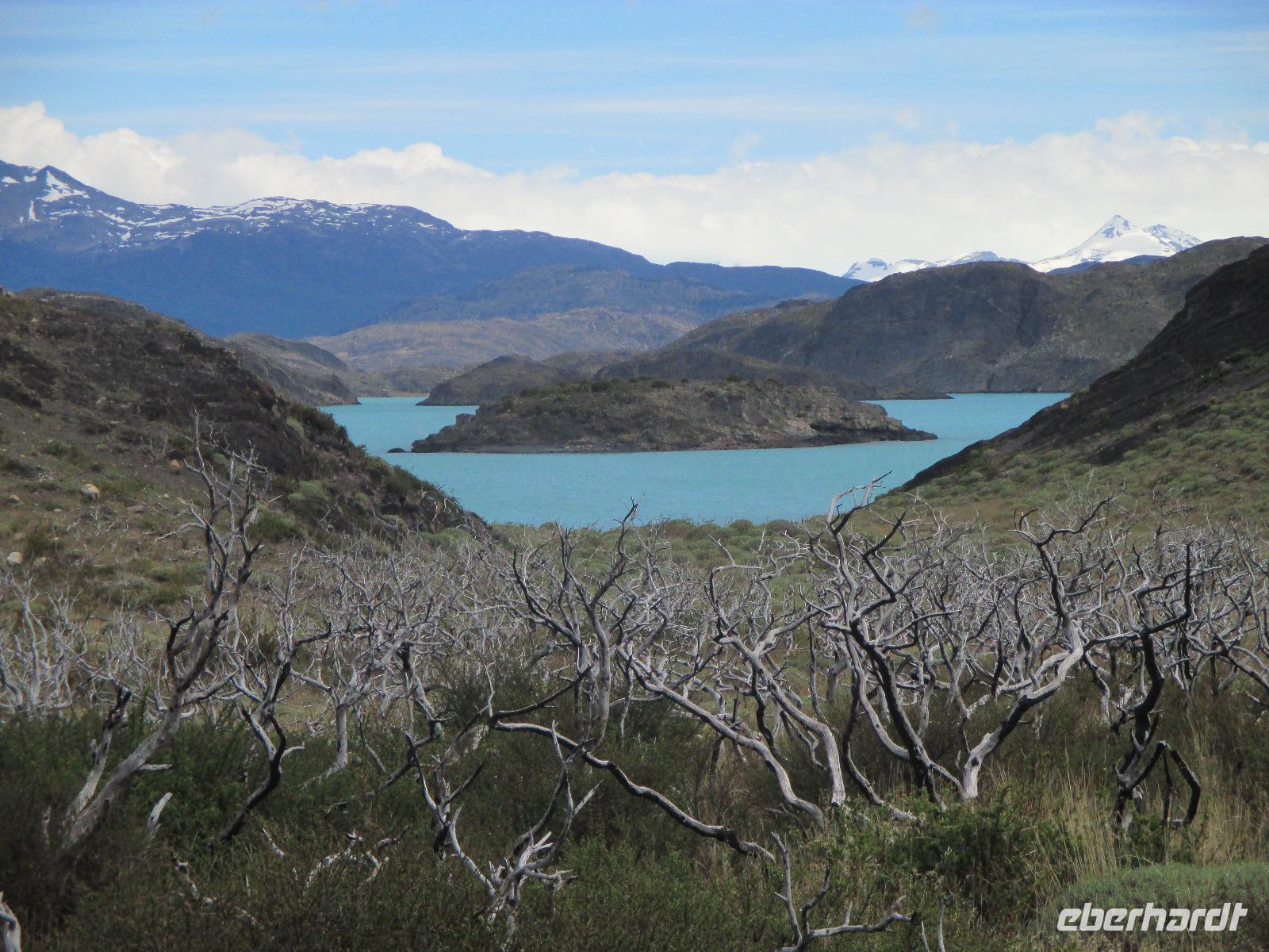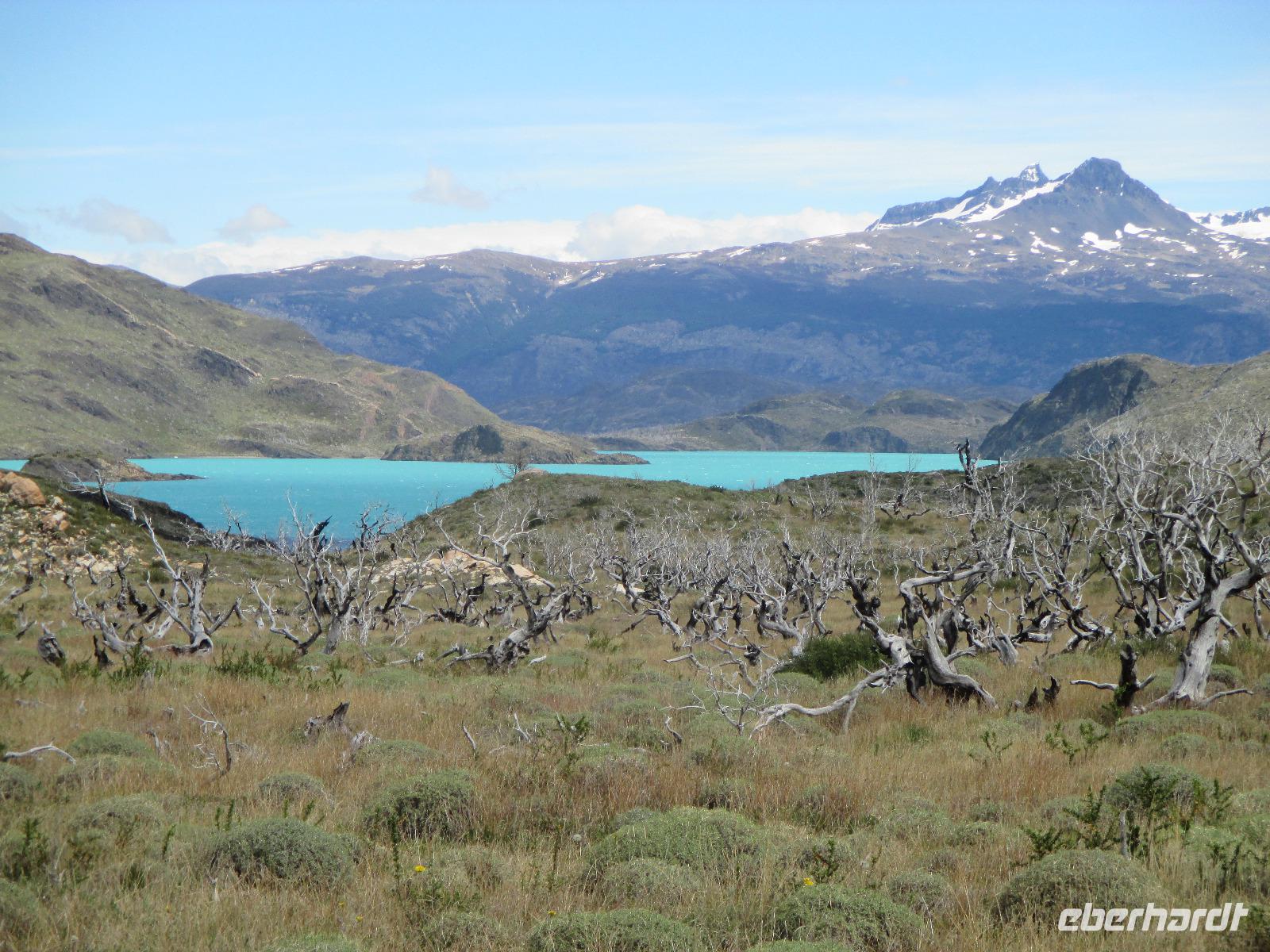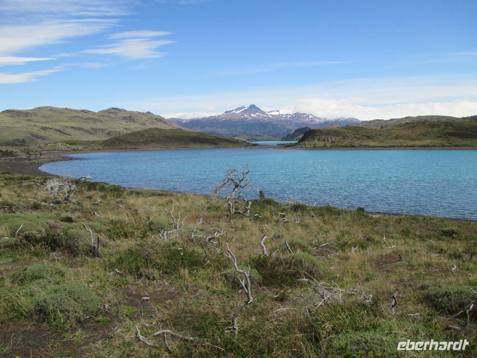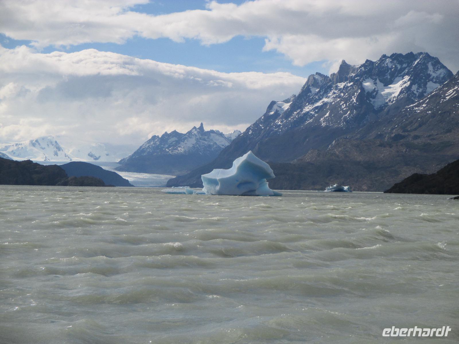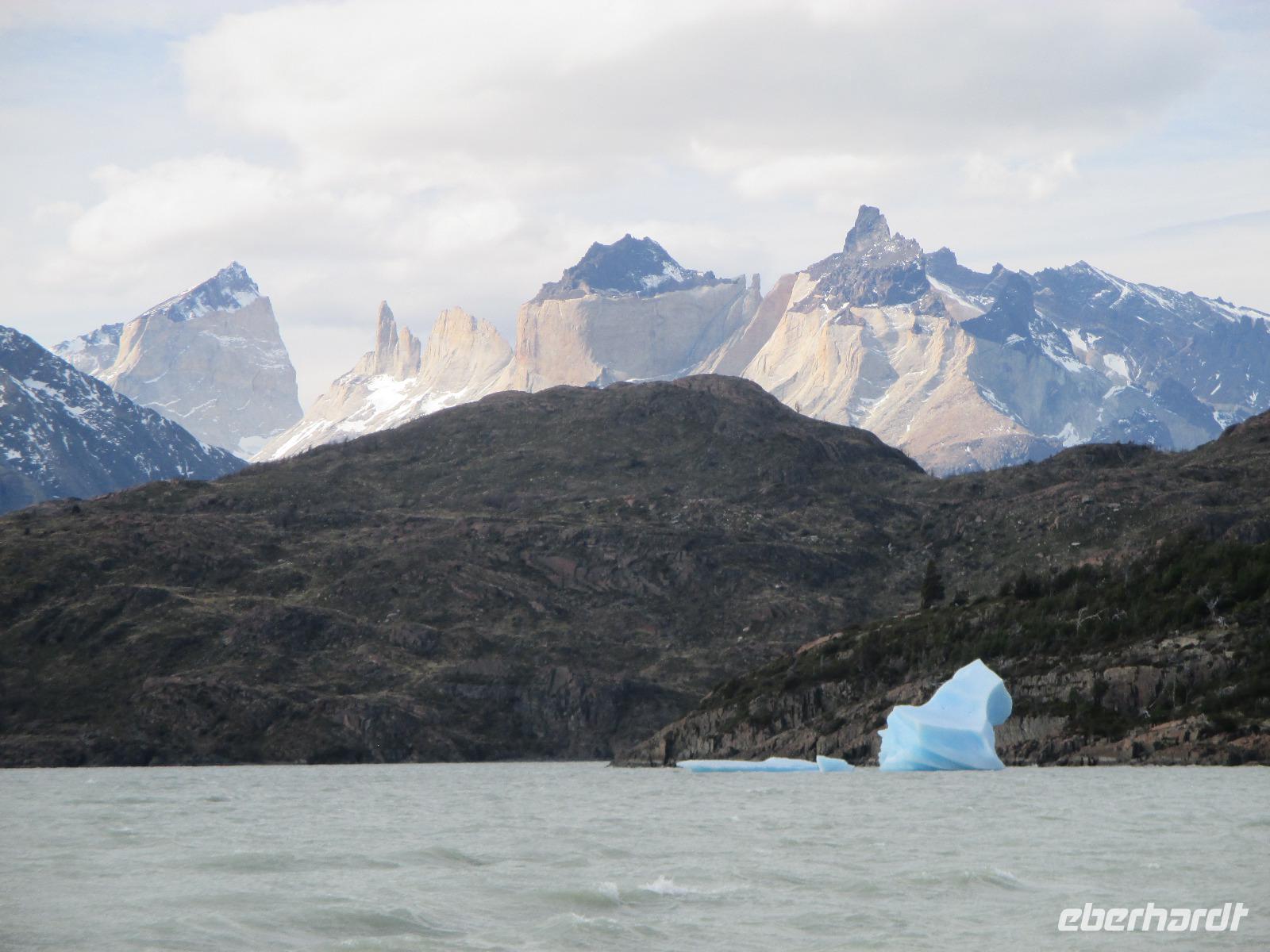 Nach dem Frühstück erleben wir ein weiteres Highlight auf unserer Reise: wir besuchen den Nationalpark Torre del Paine. Zunächst trennen uns jedoch noch 150 Kilometer vom Eingang des Nationalparks. Nach rund einer Stunde Fahrt machen wir an einem Souvenirladen einen kurzen Stopp, wo wir uns unter anderem mit Wasser für den Tag als auch mit Kaffee für den Moment eindecken. Danach geht es weiter in Richtung Nationalpark. Noch bevor wir den Eingang zum Nationalpark erreichen, haben wir mit einem Fotostopp die Möglichkeit, das imposante und bekannte Bergmassiv zu knipsen. Und auch heute haben wir wieder das beste Glück mit dem Wetter: die Hörner präsentieren sich uns wolkenlos. Also gleich die Fotoapperate bereithalten bevor es sich der Wettergott noch anders überlegt. Weiter in Richtung Eingang begegnen uns Nandus und Guanakos. An einem der zahlreichen Sees halten wir widerum für einen Fotostopp und das gewaltige Bergmassiv spiegelt sich auf der Oberfläche des Sees wieder. Am Eingang zahlt Eric für uns den Eintritt während wir an einem Aussichtspunkt weitere Blicke auf das Massiv bestaunen oder die Pause für die innere Harmonie nutzen. Immer wieder halten wir an, um Fotos schießen zu können. An einem kleinen Parkplatz steigen wir aus, um eine Wanderung zum Lago Nordenskjöld zu unternehmen. Der erste Punkt dieser Wanderung erreichen wir bereits nach wenigen Minuten: einen Wasserfall, der im Lago Pehoé mündet. Weiter geht es über Stock und Stein und nach rund 45 Minuten bei herrlichstem Sonnenschon und Ausblick erreichen wir den Lago Nordenskjöld. Hier ruhen wir uns aus und lassen die wunderschöne Natur auf uns wirken. Wir packen unsere Lunchpakete aus und machen nun eine ausgebiege Rast. Im Hintergrund hören wir, wie Lawinen den Gletscher hinab poltern. Danach geht es den gleichen Weg wieder zurück und wir machen noch einen Fotostopp oberhalb des Lago Pehoé mit dem Hostal Pehoe. Unser Fahrer Josè fährt uns bis zum Parkplatz von Lago Grey. Über eine wacklige Hängebrücke und einem kleinen Waldstück erreichen wir den Strand. Auf der Wasseroberfläche spiegelt sich die Sonne wider und in der Ferne sehen wir die Ausläufer des Grey-Gletschers. Wir spazieren entlang des Strandes bis Eric endlich eine Eisschole am Strand erblickt. Nur leider haben wir keinen Whisky parat. Oder doch???? Na klar haben wir. Nach dem Austeilen der Becher und dem Verteilen von Whisky und Eis stoßen wir mit unserem Whisky on the rocks an. Langsam müssen wir uns auf den Rückweg machen - über den Ausgang Serrano fahren wir über Schotterpiste und asphaltierte Straße zurück nach Puerto Natales zu unserer Weskar Lodge.