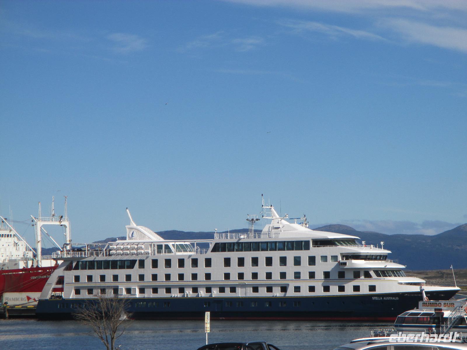 Unser letzer Tag in Argentinien ist angebrochen. Nach dem Frühstück treffen wir uns mit Eric, der unsere Pässe einsammelt. Seine Aufgabe am heutigen Vormittag ist, uns auf der Stella Australis einzuchecken. Eine Aufgabe, die auch wirklich den gesamten Vormittag in Anspruch nehmen wird. Wir als Gruppe unternehmen mit der örtlichen Reiseleiterin Mary Luz einen Auflug in den Nationalpark Tierra del Fuego. Da viele Baustelle in Ushuaia vorhanden sind, müssen wir einen kleinen Umweg in Kauf nehmen. Als wir aus der Stadt heraus fahren, nutzen wir die Gelegenheit kurz auszusteigen und ein Ausblicksfoto von Ushuaia zu machen. Durch ein grünes Tal erreichen wir die Bahnstation des "El train del fin del mundo", eine Kleinspurbahn, die auch heute noch aktiv ist und das Herz von Zugliebhabern höher schlagen lässt. Selbst der kleine Bahnhof ist mit viel Feinheiten und Raffinessen liebevoll eingerichtet. Danach geht es weiter zum Eingang, wo Mary Luz und ich noch schnell die Eintrittskarten organisieren. Unser erster Stopp im Nationalpark selber ist das südlichste Postamt der Welt. Und auch hier beschert mir unsere Reisegruppe neues Glück: ich bin nun schon zum vierten Mal hier aber noch nie waren wir alleine da sondern sonst immer mit einer Menge anderer Touristen. So können wir uns in aller Ruhe in dem kleinen Postamt, welches im letzten Jahr erweitert wurde, umschauen und uns Stempel abholen. Wer möchte, kann sich hier auch seine Postkarten für Zuhause stempeln lassen. Unser nächster Stopp ist an der Lapataia-Bucht. Wir unternehmen auch hier eine Wanderung durch einen kleinen Wald, sehen unterschiedliche Pflanzen und Pilze. An einer Bucht angelangt, genießen wir die Ruhe und Stille, die hier vorherrscht. Manch einer von uns wagt es auch, auf einen kleinen Turm, dessen Definition nicht näher bekannt ist, hinaufzuklettern. Zurück am Bus erzählt uns Mary Luz noch die Geschichte der Bieber, die hier vielfältig leben. An der Rocca-Bucht halten wir auch noch einmal, um ein paar Fotos zu machen, bevor wir zurück fahren nach Ushusaia. Hier endet unser Ausflug und wir treffen am Restaurant Ramos Generales el Almacen, eine ganz urige Kneipe in der Haushaltsgeräte aus längst vergangenen Tagen ausgestellt sind, unseren Eric wieder. Nachdem wir uns gestärkt haben,haben wir noch ein wenig Freizeit, um entweder das Museum El fin del Mundo zu besuchen oder durch die Hauptstraße Ushuaias zu schlendern. Halb sechs verabreden wir uns am Hafen und müssen uns nun leider für einige Tag von Eric verabschieden. Gemeinsam mit meiner Gruppe stürze ich mich nun in das Abenteuer "Stella Australis". Wir beziehen unsere Kabinen auf dem Schiff und treffen uns kurze Zeit später im Darwin-Salon auf Deck 5 wieder. Hier begrüßt uns unser Kapitän und stellt seine Crew vor. Danach beobachten wir das Auslaufen aus Ushuaia bevor beim Abendessen der heutige Tag ausklingt.