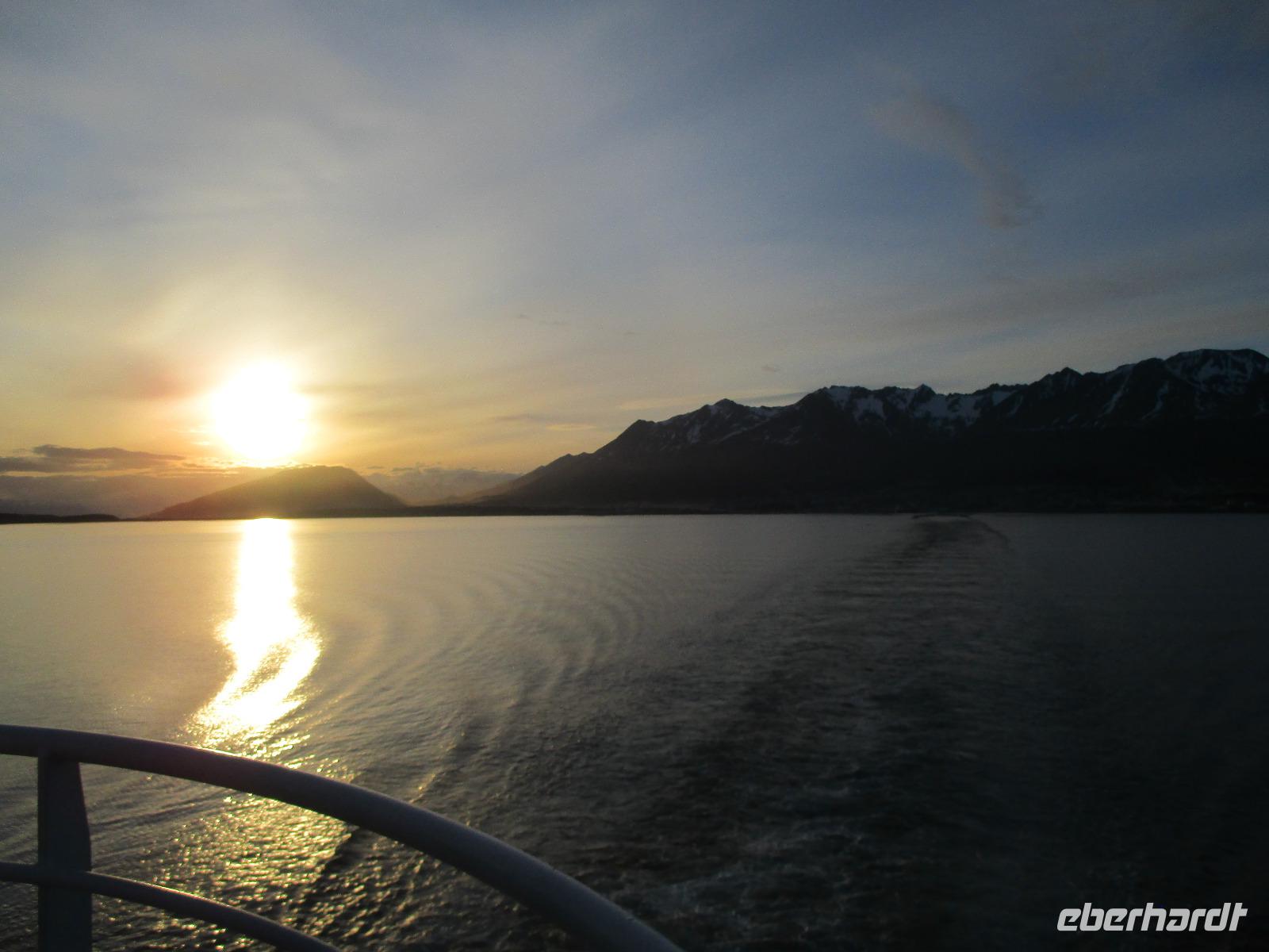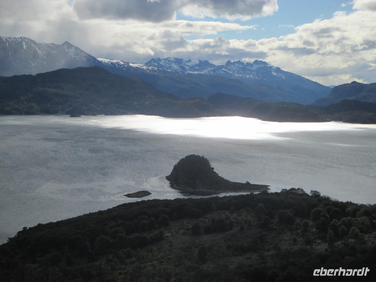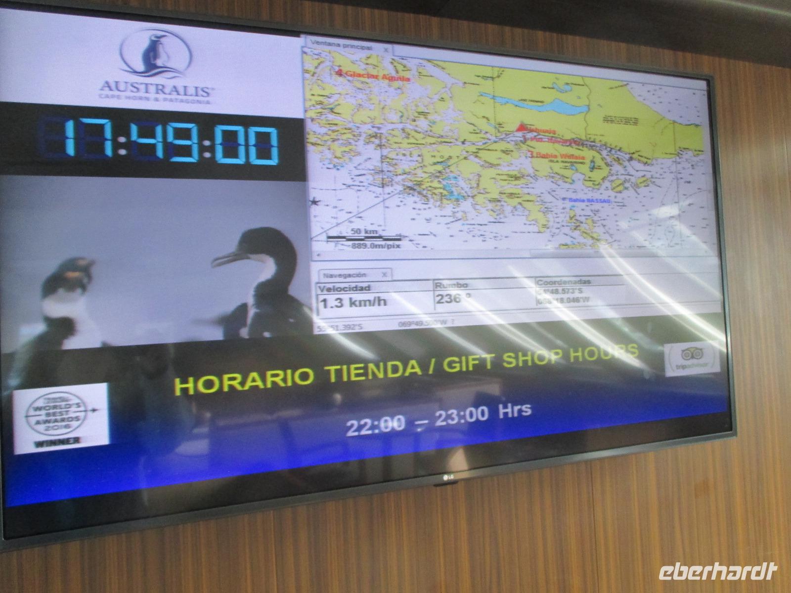 Den heutigen Vormittag verbringen wir an Bord der MS Australis. Das umfangreiche Unterhaltungsprogramm reicht von Vorträgen über das Zeigen von Seemannsknoten oder man genießt einen zweiten Kaffee an der Bar des Darwin-Decks. Zum Mittagessen treffen wir uns alle auf dem Patagonia-Deck wieder und ich erkläre meinen Gästen schon einmal das Ausschiffungsprozere am nächsten Tag. Nach einer kleinen Siesta treffen wir uns am Nachmittag erneut auf Deck 5 auf dem Darwin-Deck um uns für unseren Ausflug zum Aguila-Gletscher bereit zu machen. In den Zodiacs legen wir die kurze Distanz bis zum Strand zurück und entledigen uns dort erst einmal unseren Sicherheitswesten. Nun wandern wir entlang des Strandes und Agustin versucht uns mit seinem Flora und Fauna Wissen zu beeindrucken. Wir sehen unter anderem die mehrfach genannte Frucht Calafate. Über Stock, Stein und Moos wandern wir um eine Kurve herum und plötzlich sehen wir ihn vor uns: der Aguila-Gletscher in seiner vollen blau-weißen Pracht. Nun laufen wir näher an den Gletscher heran und machen unsere Fotos, inklusive einem Gruppenfoto. Einen kurzen Spaziergang in den Wald, dessen näheren Sinn wir leider bis heute nicht verstanden haben, bringt uns etwas weg vom Gletscher. Aber schnell sind wir wieder zurück und genießen unsere Zeit an Land. Zurück an den Zodiacs werden wir bereits mit heißem Kakao, wer möchte mit Whisky, erwartet. Danach geht es zurück auf das Schiff. Vor dem Abendessen erwartet uns die Schiffs-Crew zur Verabschiedungsveranstaltung. Es wird sich noch einmal bei allen Mitgliedern bedankt und die Stella-Fahne wird verlost. Aber dann kommt es zum eigentlichen Höhepunkt der Veranstaltung: der Verlosung der Seekarte. Diese kann man ersteigern und wir überbietet sich ständig? Natürlich die Amerikaner. Die Angebote steigen und steigen und selbst der Aktionär gerät bei diesen Summen in wahre Euphorie. Letzendlich geht die Karte für 2.700 USD nach Amerika. Waahnnsinnnnn. Normal sind Gebote zwischen 600 und 1.000 USD. Aber die beiden Amerikaner hatten ihren Spaß und das ist ja das Wichtigste. Danach geht es wieder auf Deck 1 in den Speisesaal. Der Kapitän erwartet uns bereits und begrüßt jeden einzelnen Gast per Handschlag. Ein sehr netter Zug von ihm. Ein letztes Mal lassen wir uns von den Köchen mit einem leckeren Abendessen verwöhnen. Den letzten Abend lassen wir dann bei einem Pisco Sour in der Bar ausklingen.