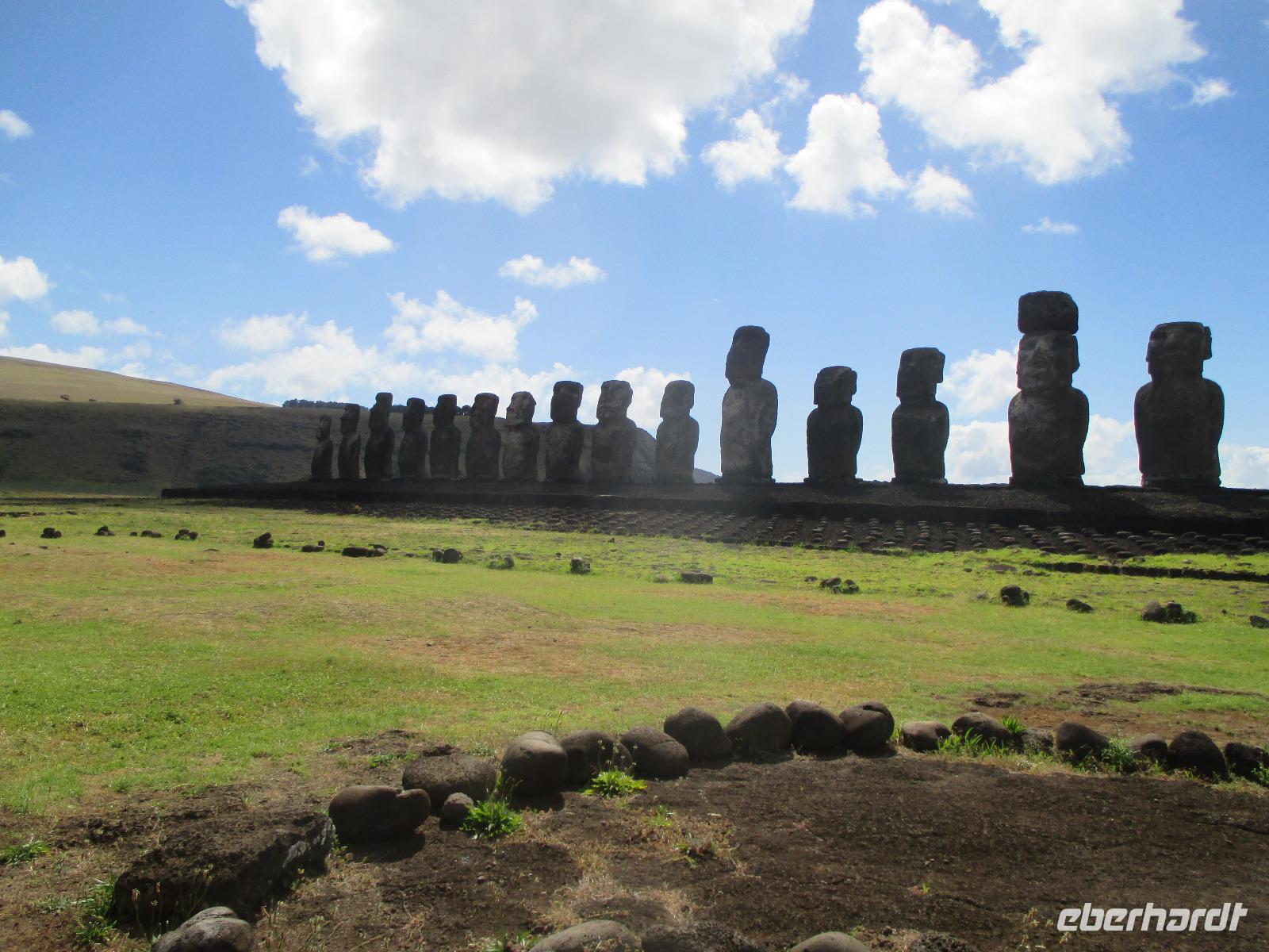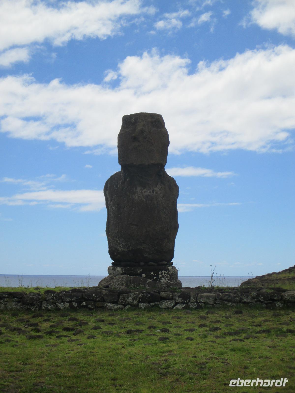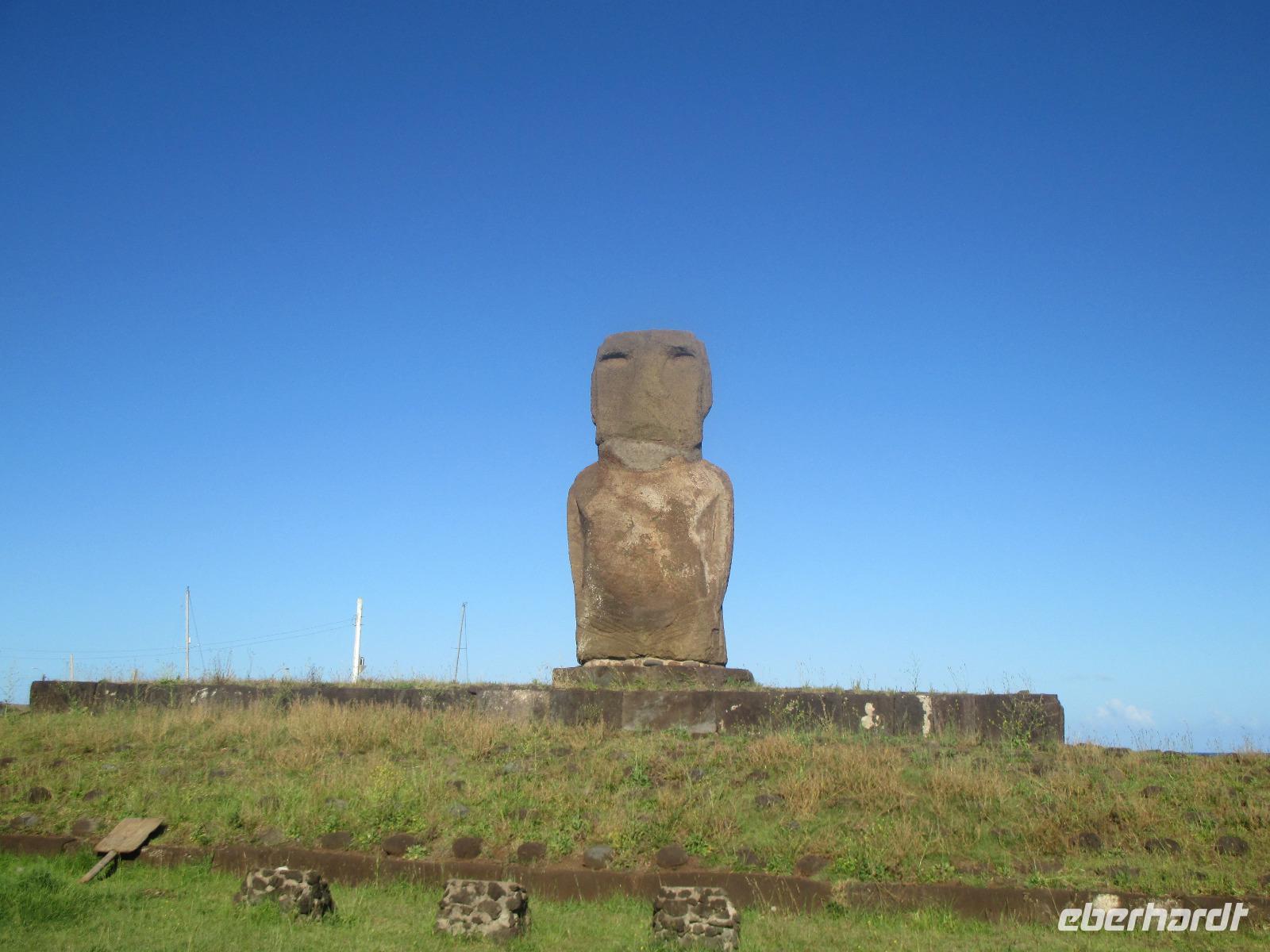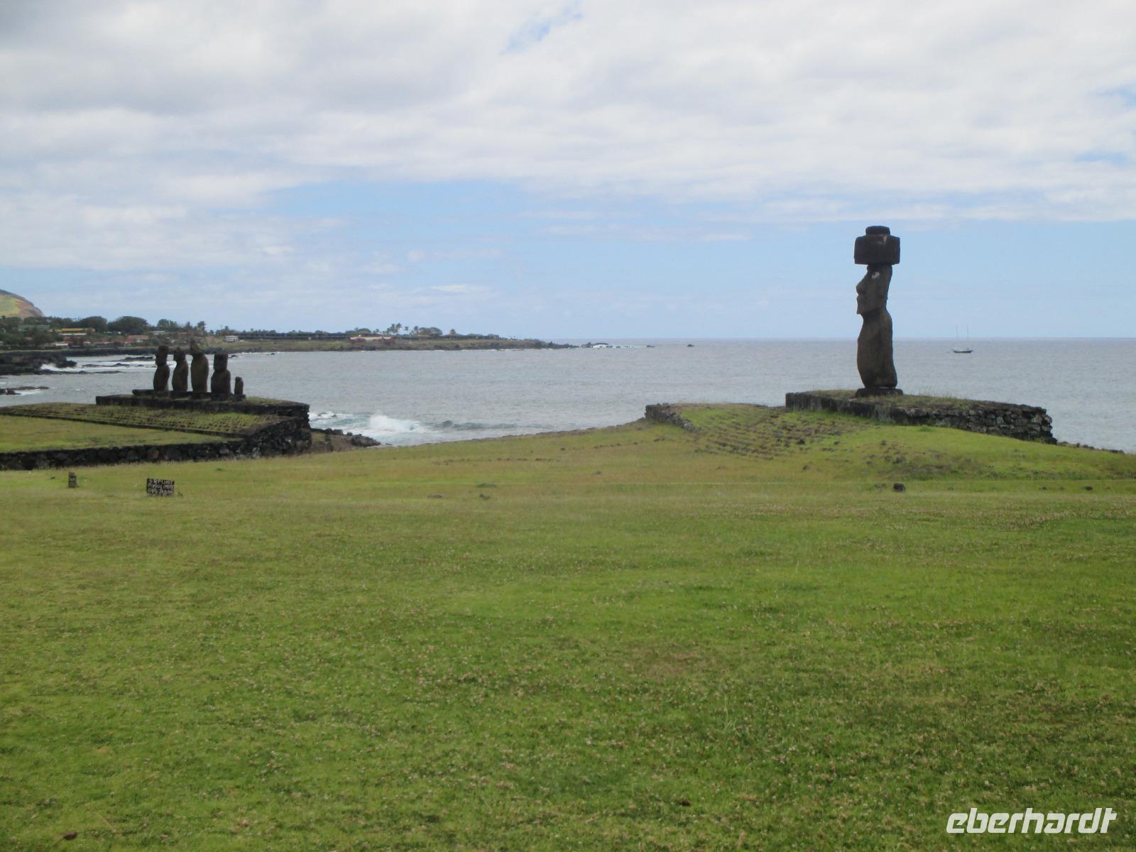 Nach dem Frühstück treffen wir uns an der Rezeption. Ich teile die Bordkarten aus und gemeinsam spazieren wir zum Flughafen hinüber, wo wir für unseren Flug auf die Osterinsel einchecken. Pünktlich halb zehn geht der Flieger in die Luft. Es wird uns ein Frühstück serviert und auch ein Unterhaltungsprogramm steht uns zur Verfügung. Nach mehr als 4,5 Stunden Flug erreichen wir die legendäre Osterinsel. Jetzt noch schnell die Uhr um zwei Stunden zurück gestellt und das Abenteuer kann beginnen. Am Ausgang warten bereits unser Fahrer Luis als auch unsere örtliche Reiseleiterin Malena auf uns. Gemeinsam fahren wir in das rund fünf Minuten entfernte Hotel O'Tai. Nach dem Checkin bleibt uns noch ein wenig Zeit für das Frischmachen und umziehen. Am Nachmittag schließlich holt uns Malena ab und wir fahren entlang der Küstenstraße zu unserer Besichtigungsstätte, nach Tahai. Es handelt sich hierbei um eine restaurierte Stätte und Malena führt uns in die Geschichte der Osterinsel und Moais ein. Zudem besuchen wir hier das Grab von William Mulloy, der maßgeblich an der Restaurierung mit beteiligt war. Ein weiterer besonderer Moai der hier in Tahai steht ist der einzige Moai mit Augen. Diese wurden den Steinfiguren erst zum Schluss eingesetzt und damit sehen wir auf der Insel keinen weiteren Moai mit Augen. Danach geht es zur Ausgrabungsstätte Aku a Kivi, eine ebenfalls restaurierte Stätte mit ca. 7 Moais auf einer Plattform. Durch die stetig scheinende Sonne erblühen auch die Pflanzen ringsumher und geben dieser Ortschaft einen besonderen Touch. Der nächste Punkt auf unserem Programm ist Puna Pau, wo wir uns als erstes die Feuerpflanze anschauen. Dann laufen wir einen Berg hinauf, von dem aus wir einen wunderschönen Blick auf das Dorf Hanga Roa haben. Zudem ist die Stelle hier bekannt für die Hüte der Moais. Überall liegen größeren rotfarbene Steine umher, aus denen die Hüte hergestellt wurden sind. Unser letzer Moai für den heutigen Tag ist ein einzelner, der fast vergessen wirkt. Hinter diesem Moai befindet sich eine kleine Feuerstelle, oder ist es ein Grill, oder was soll das sein? Die Bewohner der Insel sind sich noch nicht einig darüber und aus diesem Grund kann uns auch Malena nicht sagen, was dieses Gebilde darstellen soll. Zurück im Hotel speisen wir heute hier zu Abend. Gemeinsam mit einem Reisegast gehe ich am Abend noch in eines der zahlreichen Restaurants für einen gemeinsamen Drink.