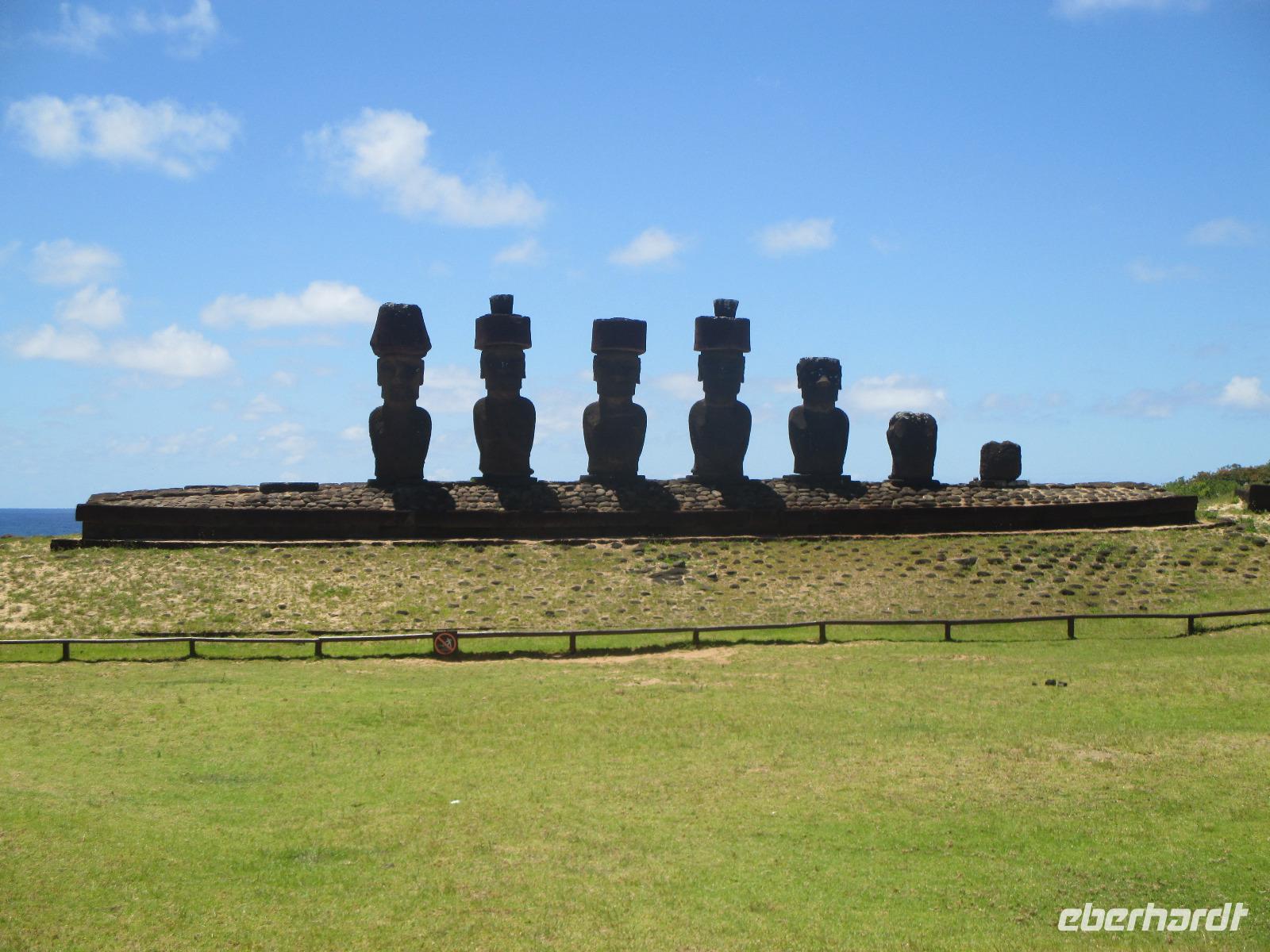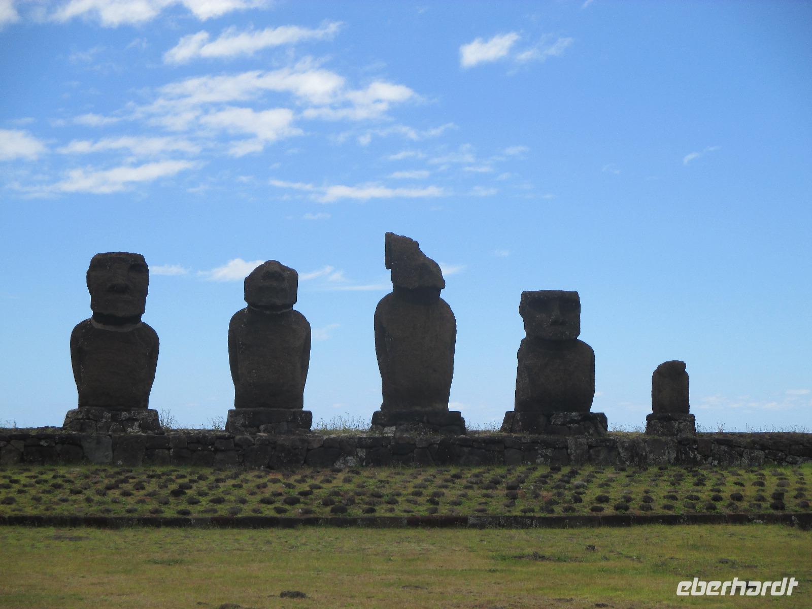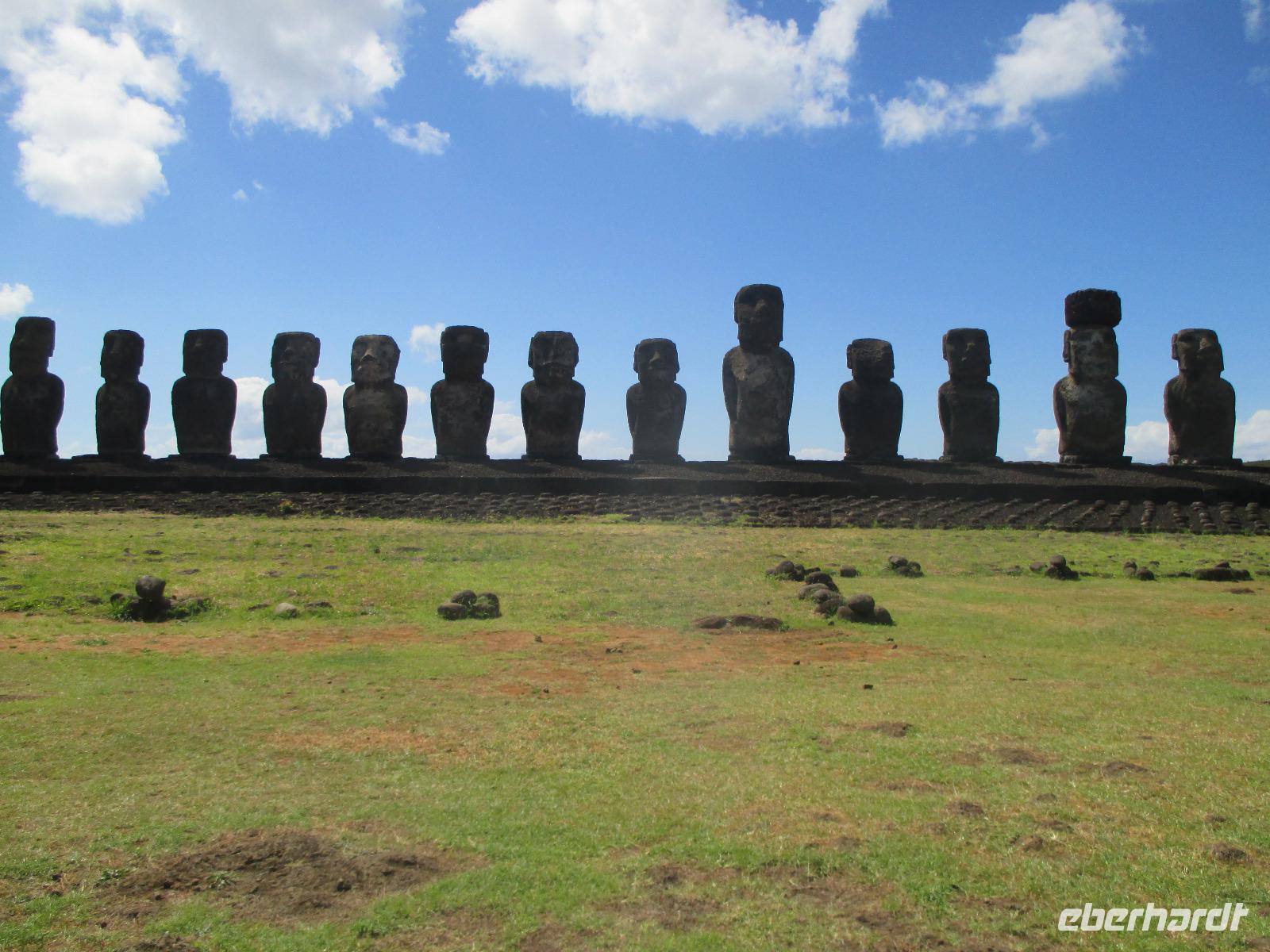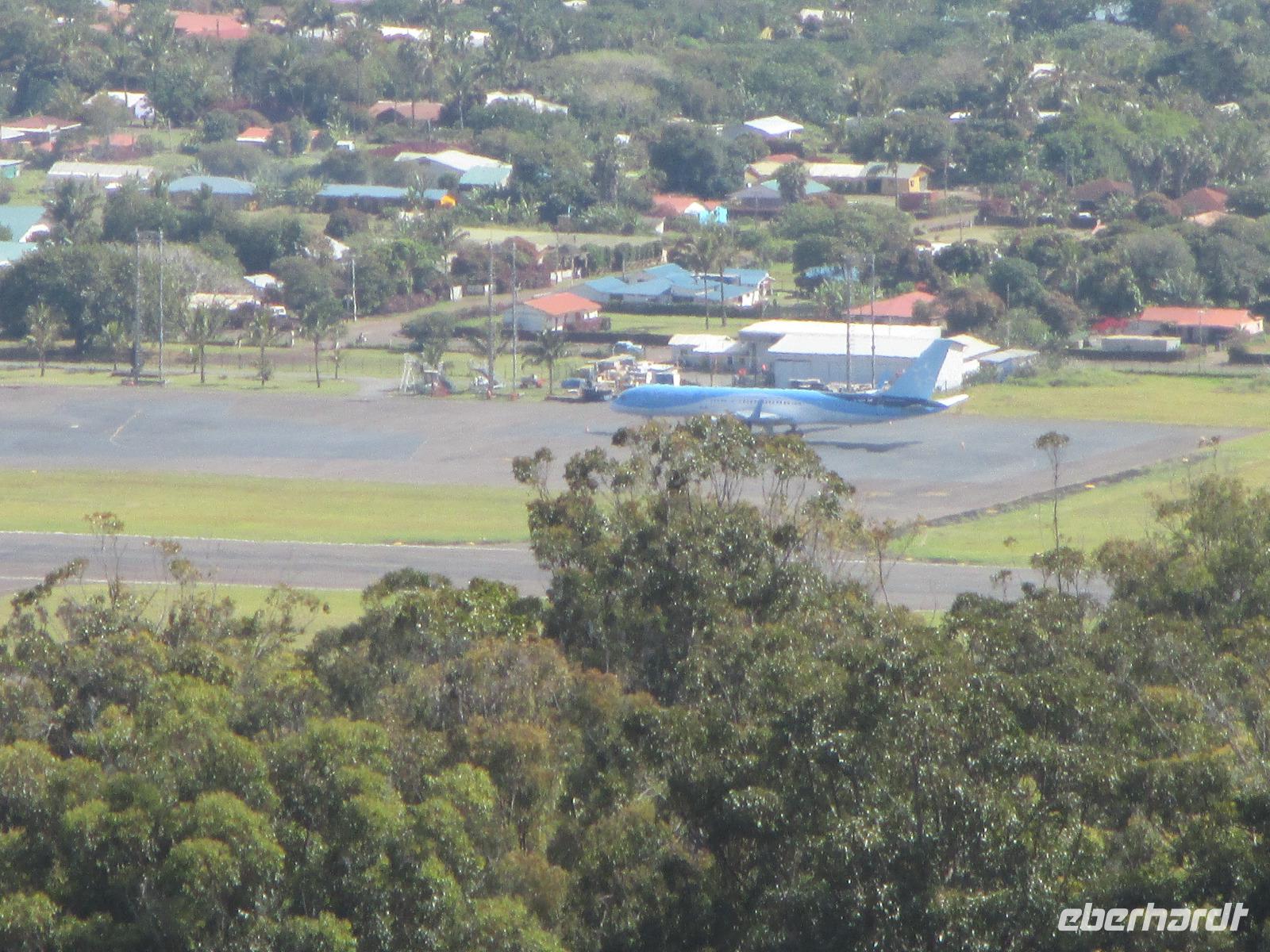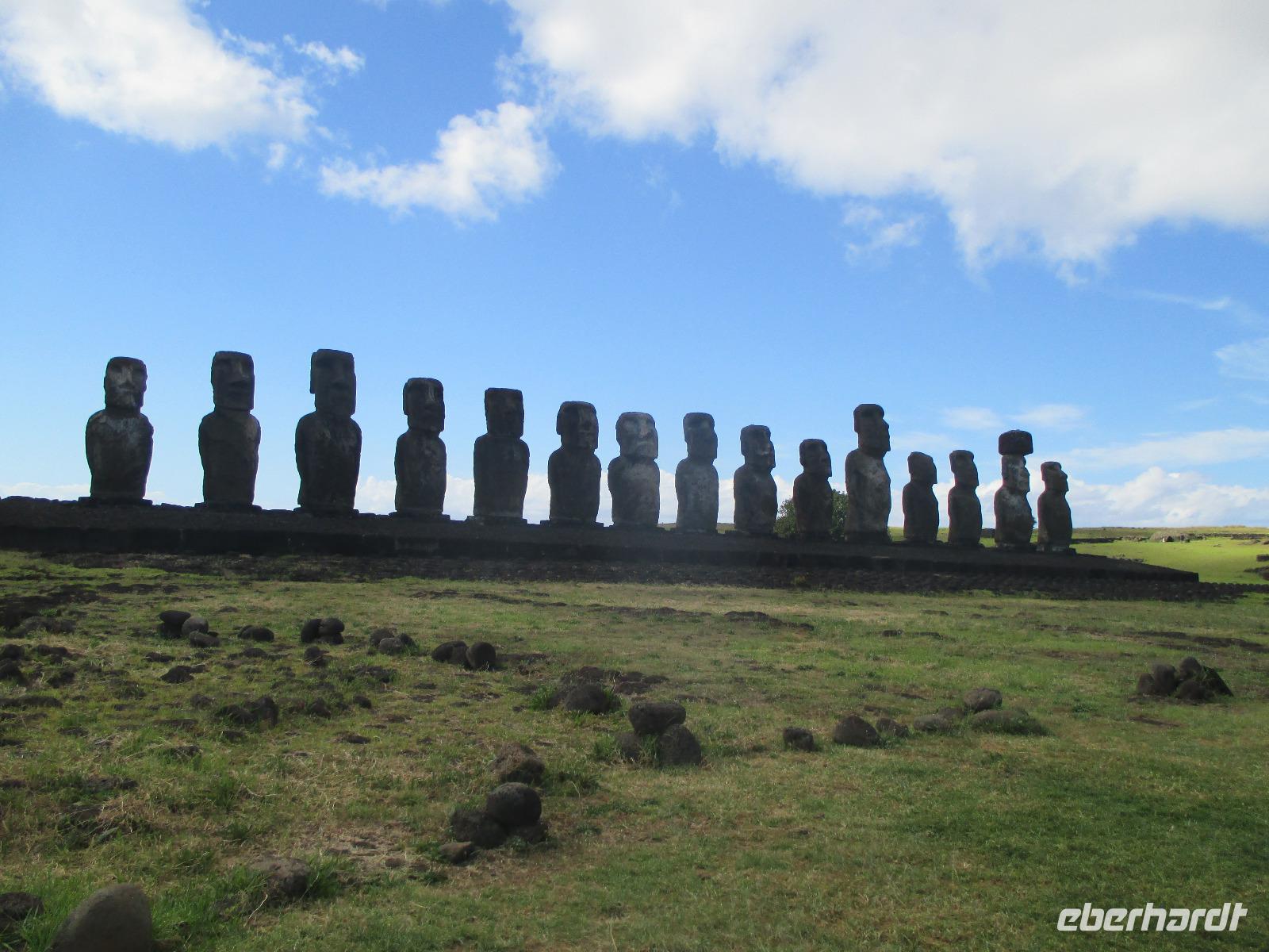 Nach dem Frühstück treffen wir uns an der Rezeption. Ich teile die Bordkarten aus und gemeinsam spazieren wir zum Flughafen hinüber, wo wir für unseren Flug auf die Osterinsel einchecken. Pünktlich halb zehn geht der Flieger in die Luft. Es wird uns ein Frühstück serviert und auch ein Unterhaltungsprogramm steht uns zur Verfügung. Nach mehr als 4,5 Stunden Flug erreichen wir die legendäre Osterinsel. Jetzt noch schnell die Uhr um zwei Stunden zurück gestellt und das Abenteuer kann beginnen. Am Ausgang warten bereits unser Fahrer Luis als auch unsere örtliche Reiseleiterin Malena auf uns. Gemeinsam fahren wir in das rund fünf Minuten entfernte Hotel O'Tai. Nach dem Checkin bleibt uns noch ein wenig Zeit für das Frischmachen und umziehen. Am Nachmittag schließlich holt uns Malena ab und wir fahren entlang der Küstenstraße zu unserer Besichtigungsstätte, nach Tahai. Es handelt sich hierbei um eine restaurierte Stätte und Malena führt uns in die Geschichte der Osterinsel und Moais ein. Zudem besuchen wir hier das Grab von William Mulloy, der maßgeblich an der Restaurierung mit beteiligt war. Ein weiterer besonderer Moai der hier in Tahai steht ist der einzige Moai mit Augen. Diese wurden den Steinfiguren erst zum Schluss eingesetzt und damit sehen wir auf der Insel keinen weiteren Moai mit Augen. Danach geht es zur Ausgrabungsstätte Aku a Kivi, eine ebenfalls restaurierte Stätte mit ca. 7 Moais auf einer Plattform. Durch die stetig scheinende Sonne erblühen auch die Pflanzen ringsumher und geben dieser Ortschaft einen besonderen Touch. Der nächste Punkt auf unserem Programm ist Puna Pau, wo wir uns als erstes die Feuerpflanze anschauen. Dann laufen wir einen Berg hinauf, von dem aus wir einen wunderschönen Blick auf das Dorf Hanga Roa haben. Zudem ist die Stelle hier bekannt für die Hüte der Moais. Überall liegen größeren rotfarbene Steine umher, aus denen die Hüte hergestellt wurden sind. Unser letzer Moai für den heutigen Tag ist ein einzelner, der fast vergessen wirkt. Hinter diesem Moai befindet sich eine kleine Feuerstelle, oder ist es ein Grill, oder was soll das sein? Die Bewohner der Insel sind sich noch nicht einig darüber und aus diesem Grund kann uns auch Malena nicht sagen, was dieses Gebilde darstellen soll. Zurück im Hotel speisen wir heute hier zu Abend. Gemeinsam mit einem Reisegast gehe ich am Abend noch in eines der zahlreichen Restaurants für einen gemeinsamen Drink.