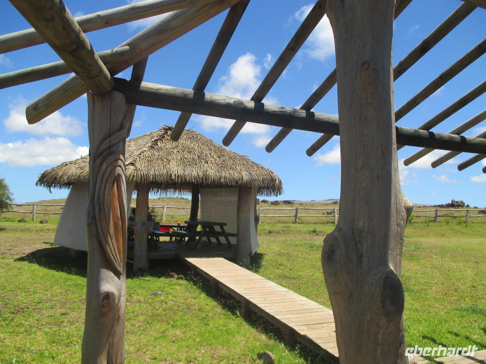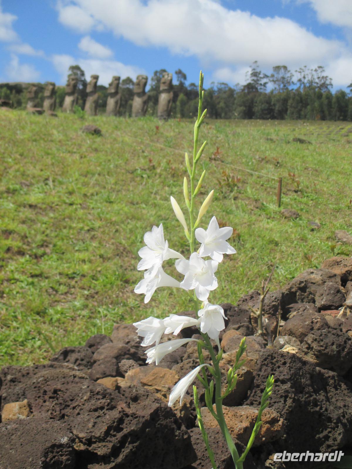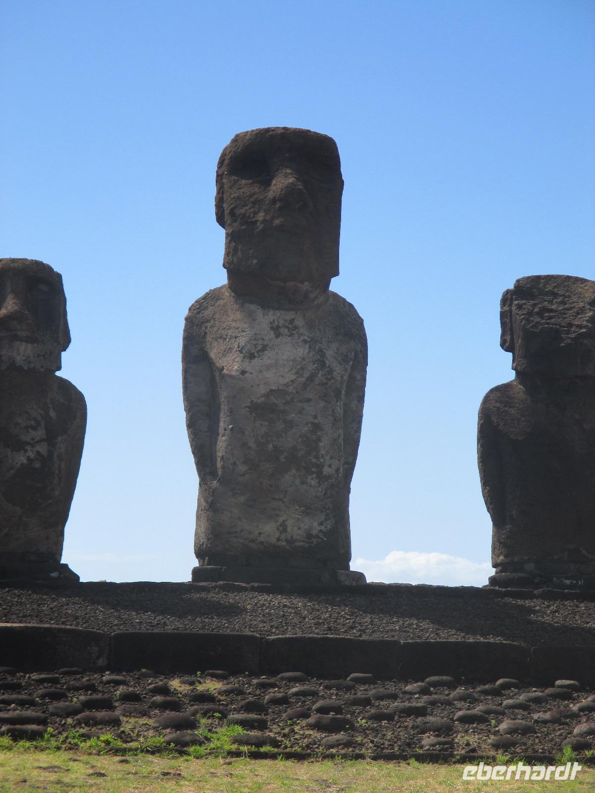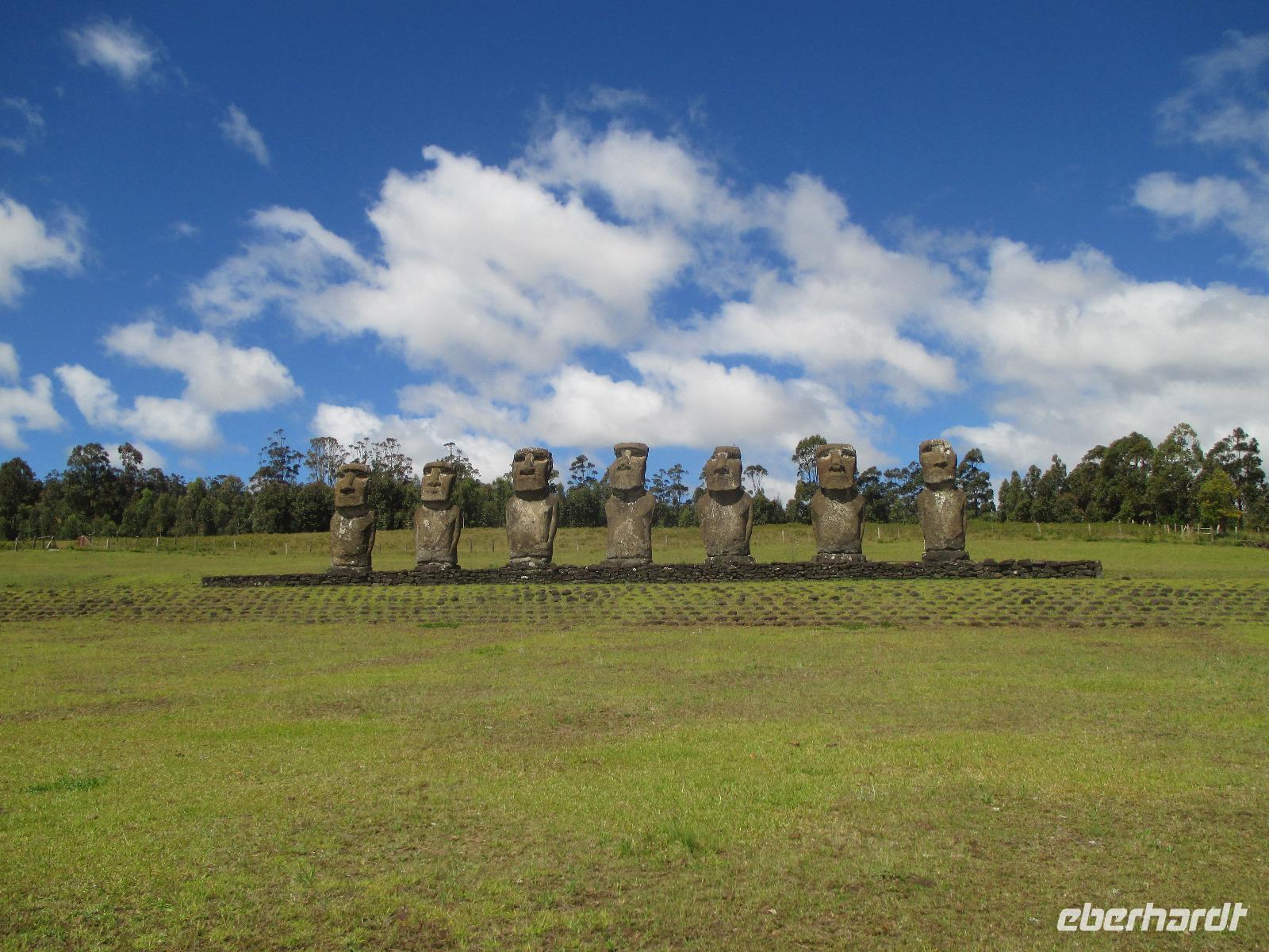 Nach dem Frühstück treffen wir uns an der Rezeption. Ich teile die Bordkarten aus und gemeinsam spazieren wir zum Flughafen hinüber, wo wir für unseren Flug auf die Osterinsel einchecken. Pünktlich halb zehn geht der Flieger in die Luft. Es wird uns ein Frühstück serviert und auch ein Unterhaltungsprogramm steht uns zur Verfügung. Nach mehr als 4,5 Stunden Flug erreichen wir die legendäre Osterinsel. Jetzt noch schnell die Uhr um zwei Stunden zurück gestellt und das Abenteuer kann beginnen. Am Ausgang warten bereits unser Fahrer Luis als auch unsere örtliche Reiseleiterin Malena auf uns. Gemeinsam fahren wir in das rund fünf Minuten entfernte Hotel O'Tai. Nach dem Checkin bleibt uns noch ein wenig Zeit für das Frischmachen und umziehen. Am Nachmittag schließlich holt uns Malena ab und wir fahren entlang der Küstenstraße zu unserer Besichtigungsstätte, nach Tahai. Es handelt sich hierbei um eine restaurierte Stätte und Malena führt uns in die Geschichte der Osterinsel und Moais ein. Zudem besuchen wir hier das Grab von William Mulloy, der maßgeblich an der Restaurierung mit beteiligt war. Ein weiterer besonderer Moai der hier in Tahai steht ist der einzige Moai mit Augen. Diese wurden den Steinfiguren erst zum Schluss eingesetzt und damit sehen wir auf der Insel keinen weiteren Moai mit Augen. Danach geht es zur Ausgrabungsstätte Aku a Kivi, eine ebenfalls restaurierte Stätte mit ca. 7 Moais auf einer Plattform. Durch die stetig scheinende Sonne erblühen auch die Pflanzen ringsumher und geben dieser Ortschaft einen besonderen Touch. Der nächste Punkt auf unserem Programm ist Puna Pau, wo wir uns als erstes die Feuerpflanze anschauen. Dann laufen wir einen Berg hinauf, von dem aus wir einen wunderschönen Blick auf das Dorf Hanga Roa haben. Zudem ist die Stelle hier bekannt für die Hüte der Moais. Überall liegen größeren rotfarbene Steine umher, aus denen die Hüte hergestellt wurden sind. Unser letzer Moai für den heutigen Tag ist ein einzelner, der fast vergessen wirkt. Hinter diesem Moai befindet sich eine kleine Feuerstelle, oder ist es ein Grill, oder was soll das sein? Die Bewohner der Insel sind sich noch nicht einig darüber und aus diesem Grund kann uns auch Malena nicht sagen, was dieses Gebilde darstellen soll. Zurück im Hotel speisen wir heute hier zu Abend. Gemeinsam mit einem Reisegast gehe ich am Abend noch in eines der zahlreichen Restaurants für einen gemeinsamen Drink.