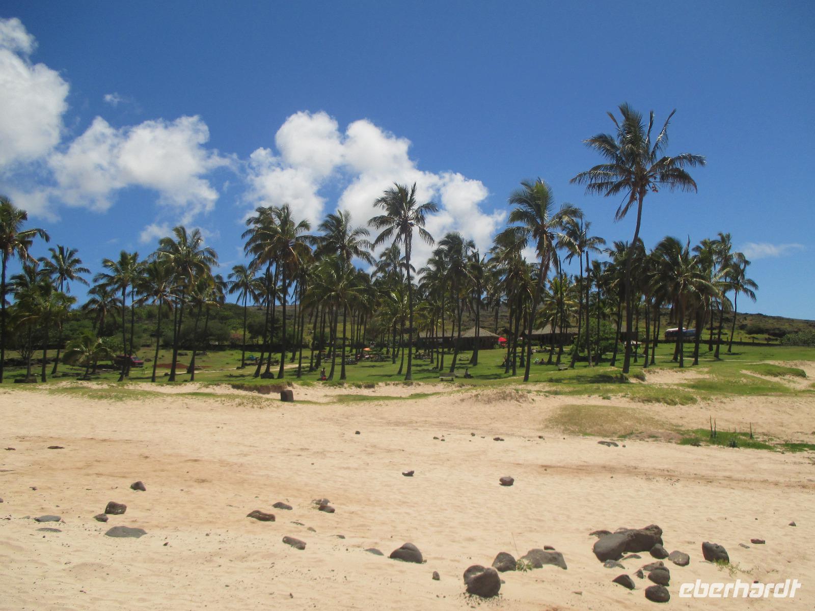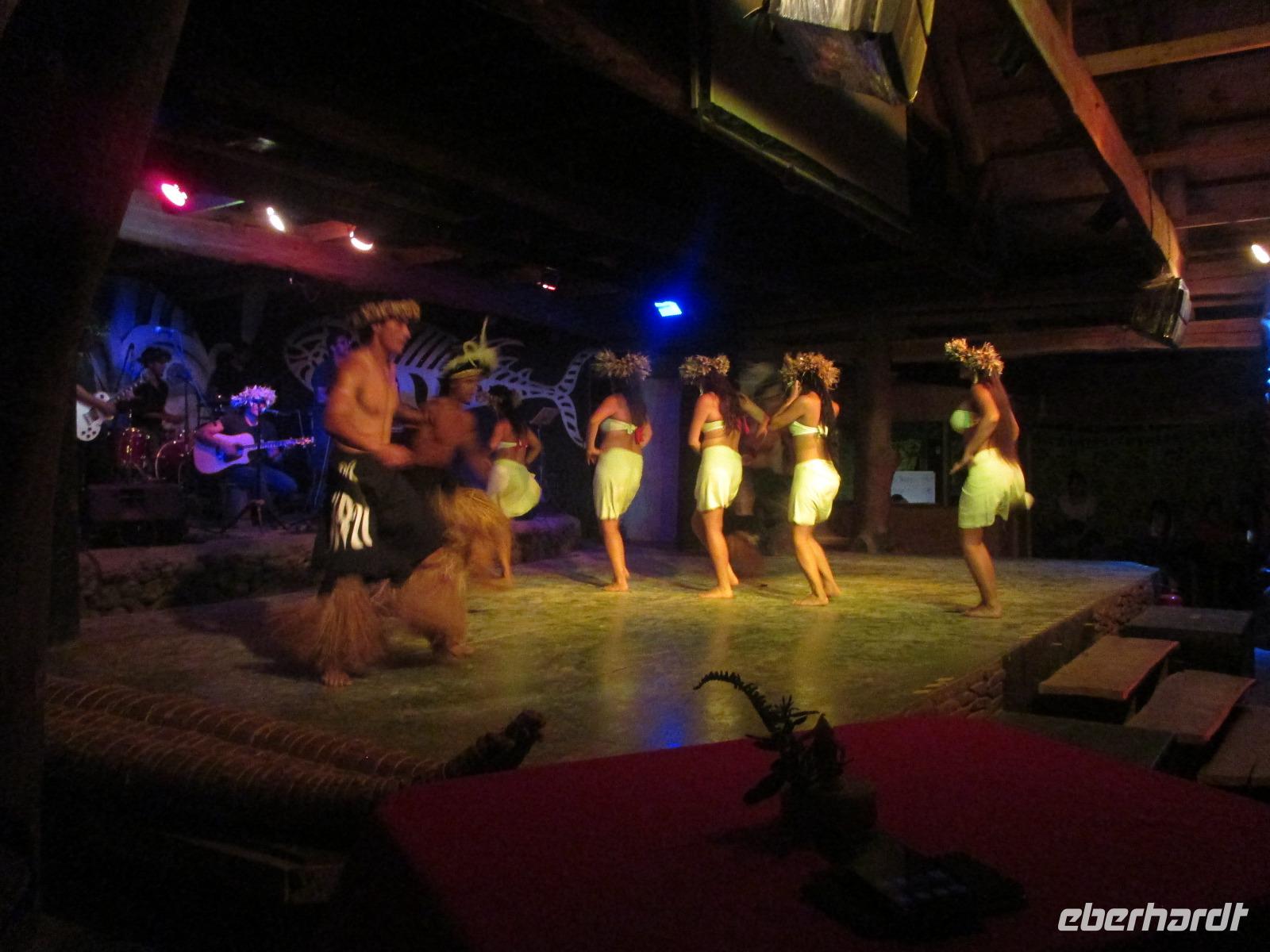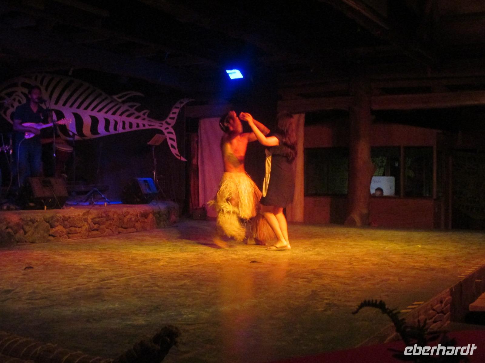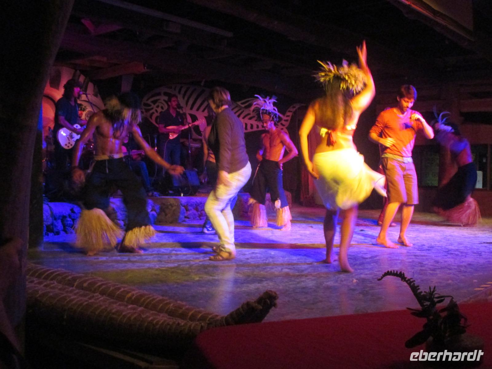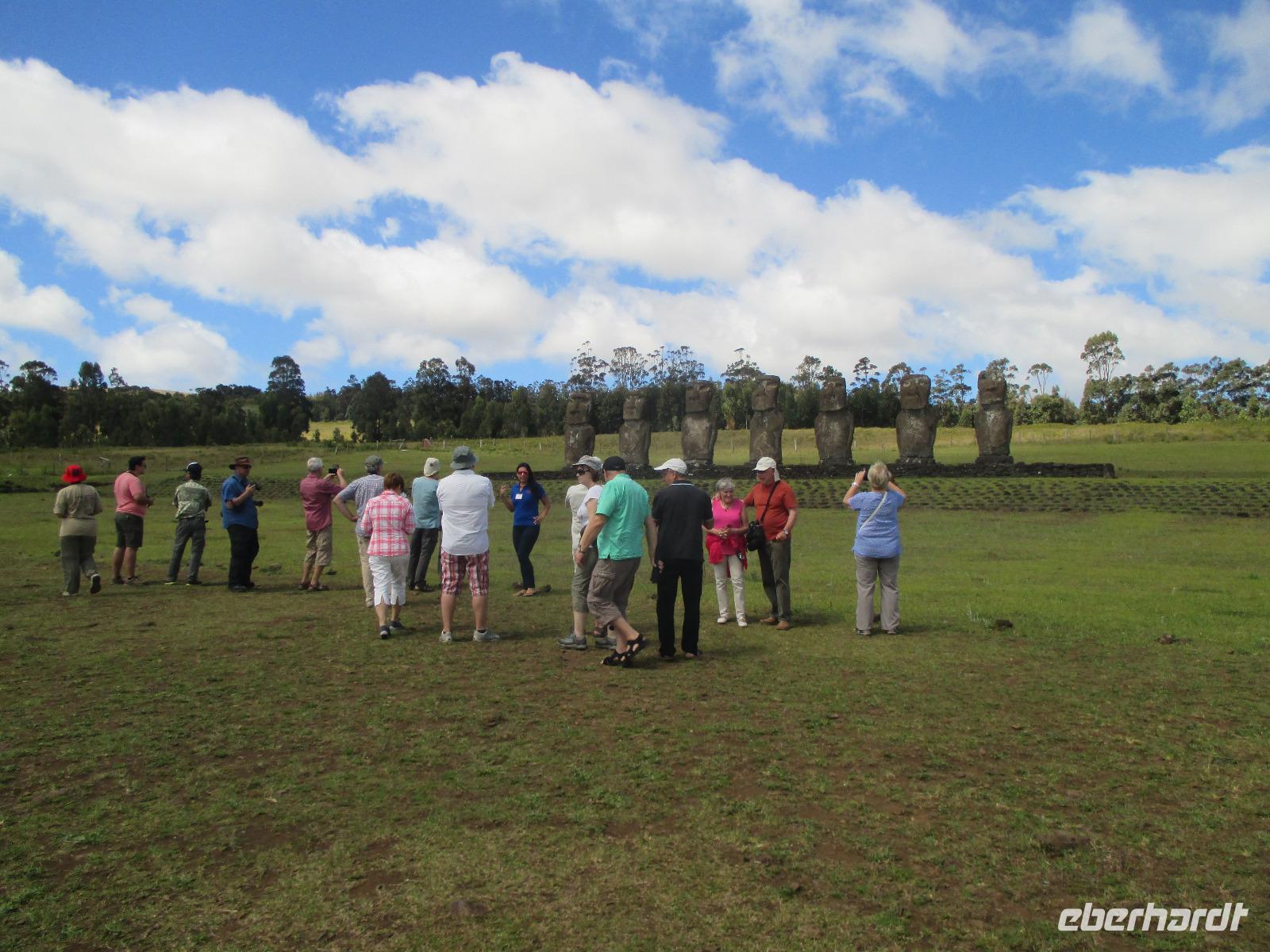 Heute steht ein langer Ausflugstag auf unserem Programm. Zunächst fahren wir zu der unrestaurierten Plattform Vaihu. Malena erzählt uns, warum es hier noch nicht zur Restaurierung gekommen ist. Danach geht es weiter zur Plattform Akahanja, ebenfalls unrestauriert. Hier sehen wir untern anderem eine Feuerstelle und gehen in eine Höhe hinab, in der die Urwohner der Osterinsel einst gelebt haben. Charakteristisch für diese Stätte ist ebenfalls ein liegender Moai, den wir zu Ende unseres Rundganges noch bestaunen. Einen weiteren Höhenpunkt erleben wir ein weiteres Highlight der Osterinsel: die 15 stehenden Moais, die es auf fast jedem Bild der Osterinsel zu sehen ist. Der 16, fehlende Moai, liegt weiter hinten, unentdeckt von Touristen. Hier muss natürlich erst einmal ein Fotoshooting abgehalten werden, bevor wir uns aufmachen zur Fabrik. In der Fabrik, einem Steinbruch, erleben wir über 250 Moais, die in verschiedesten Bearbeitungszuständen hier zu sehen sind. Die Arbeiter haben die Stätte wohl plötzlich verlassen und die Moais einfach so hinterlassen. Rana+Raraku ist die einzigste Fabrik auf der Insel gewesen, so dass alle Moais der Insel aus diesem Felsen hier gemeiselt wurden. Was wir von Malena auch erfahren ist, dass nur rund 1/3 der Körper zu sehen sind. Der restliche Körper ist in der Erde vergraben. Der Moai, der mir hier am besten gefällt, ist der knieende Moai. Zurück am Ausgang haben wir dann unter einem Baum unser wohlverdientes Mittagspicknick. Bereits am Vortag konnten wir zwischen vegetarisch, Rind, Huhn und Fisch auswählen. Dazu noch ein kleines Getränk und wir sind nach den vielen Moais am Vormittag wieder gestärkt für unser Nachmittagsprogramm. Dieses sieht als nächstes den Besuch des magischen Steins bei Te Pito Kura vor und danach geht es dann endlich nach Anakena. Auch hier gibt es eine Plattform mit Moais. Im Hintergrund dazu Palmen, weißer Sandstrand und blaues Meer. Die Erholung ist zum Greifen nah. Nachdem uns Malena noch Ihr Wissen bezüglich dieser Plattform kundgetan hat, spazieren wir zum Strand. Meine Gäste erholen sich im kühlenden Nass und mir ist es eine Freude, ihnen dabei zuzusehen. Bevor wir zurück zum Bus gehen, kehren wir noch in einer Art Pavillon ein und genießen eine frische Pina Colada. Zum Abendessen werden wir heute im Restaurant "Au Boute du Monde" erwartet, wo die Chefin noch selber kocht. Und das schmecken wir auch heraus. Zum Abschluss eines wunderschönen Tages besuchen wir noch eine polynesische Tanzshow in der uns die verschiedensten Tänze in hübschen Kostümen vorgeführt werden. Und unsere Gabi darf heute sogar ein wenig mittanzen. Ich hoffe, es hat Dir Spaß gemacht?