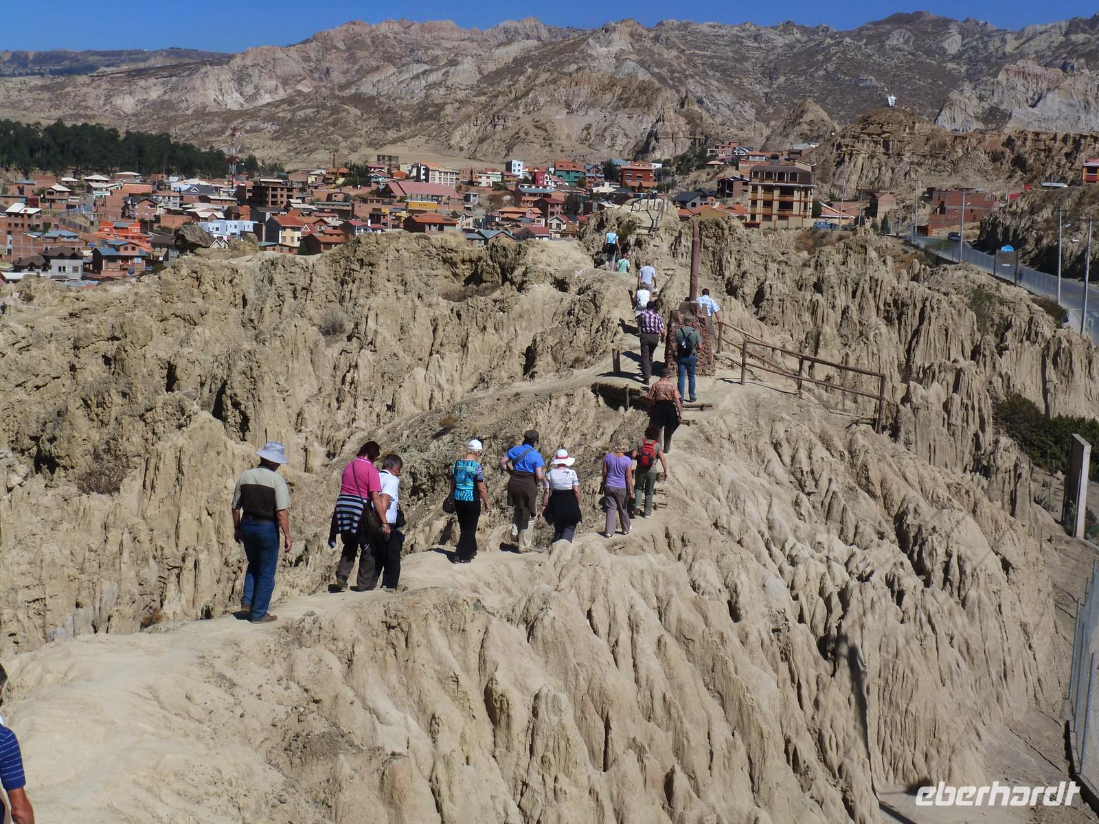 Am Morgen schauten wir uns diese Stadt genauer an: Wir begannen mit dem Mondtal, das ist eine unwirkliche Landschaft unterhalb der Stadt gelegen, wo wir einen schönen Spaziergang durch bizarre Sandformationen machten - es war toll! Und dann fuhren wir in die Innenstadt, sahen das geschichtsträchtige Präsidentenhaus und genossen vom Killi-Killi Aussichtspunkt eine tolle Sicht über diese Megastadt inmitten der grandiosen Berge. Nachdem wir uns einen guten Überblick über die Stadt verschafft haben fuhren wir raus aus der Stadt nach Tiwanaku, einer prähistorischen Stadt der Menschen, die noch lange vor Christus in dieser Region Boliviens gelebt haben. Es wurden vor nicht allzu langer Zeit die alten Tempelanlagen unter der Erde gefunden. Es war total beeindruckend zu sehen, wie die Menschen vor so vielen tausend Jahren solche Bauwerke mit wahrscheinlich primitivsten Mitteln erbaut haben. Wir spazierten durch die Anlage und unsere Reiseleiterin Tanja hat uns nachher sehr gute Sandwichs besorgt, die wir auf der Rückfahrt na La Paz genossen haben. Wir fuhren wieder durch El Alta, wo wir erneut die Pupen an Laternenmasten sahen, welche