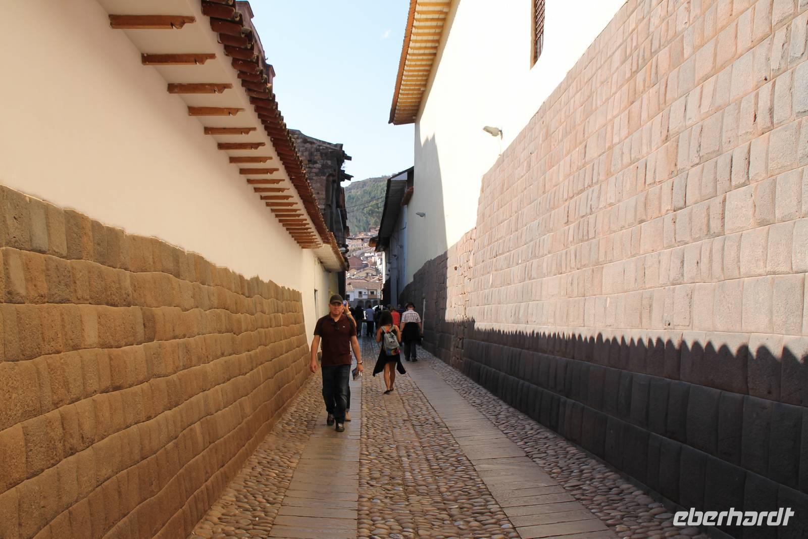 Zuerst ging es zum Kloster „Convento de Santo Domingo Del Cusco". Leider überstand es nicht den Zerstörungen der Konquistadoren. Somit konnten wir zum größten Teil nur die Ruinen bestaunen, die vom Kloster überbaut wurden. Weiter ging es zum Plaza de Armas, um die schöne Kathedrale zu besichtigen. Beeindruckend waren der gewaltige silberne Altar und das Bild des letzten Abendmahles, mit einem gebratenen Meerschweinchen auf dem Esstisch. Anschließende führte uns der Weg entlang der „Avenida Hatunrumiyoc", auf der die am besten erhaltenen Mauern aus der Inka-Zeit zu sehen sind.