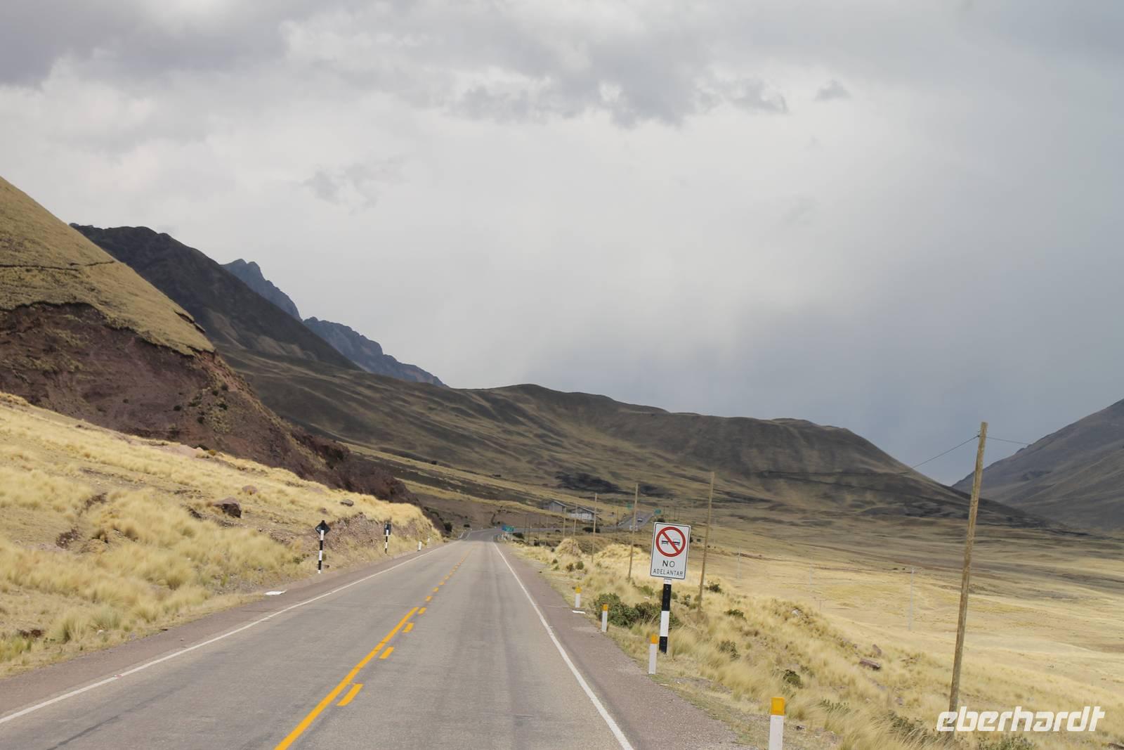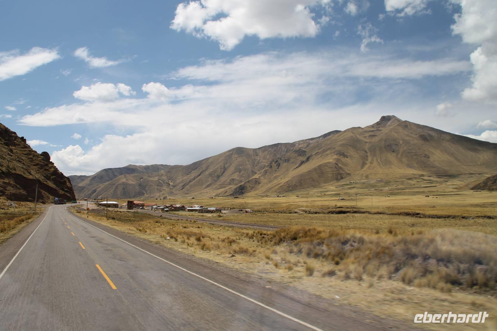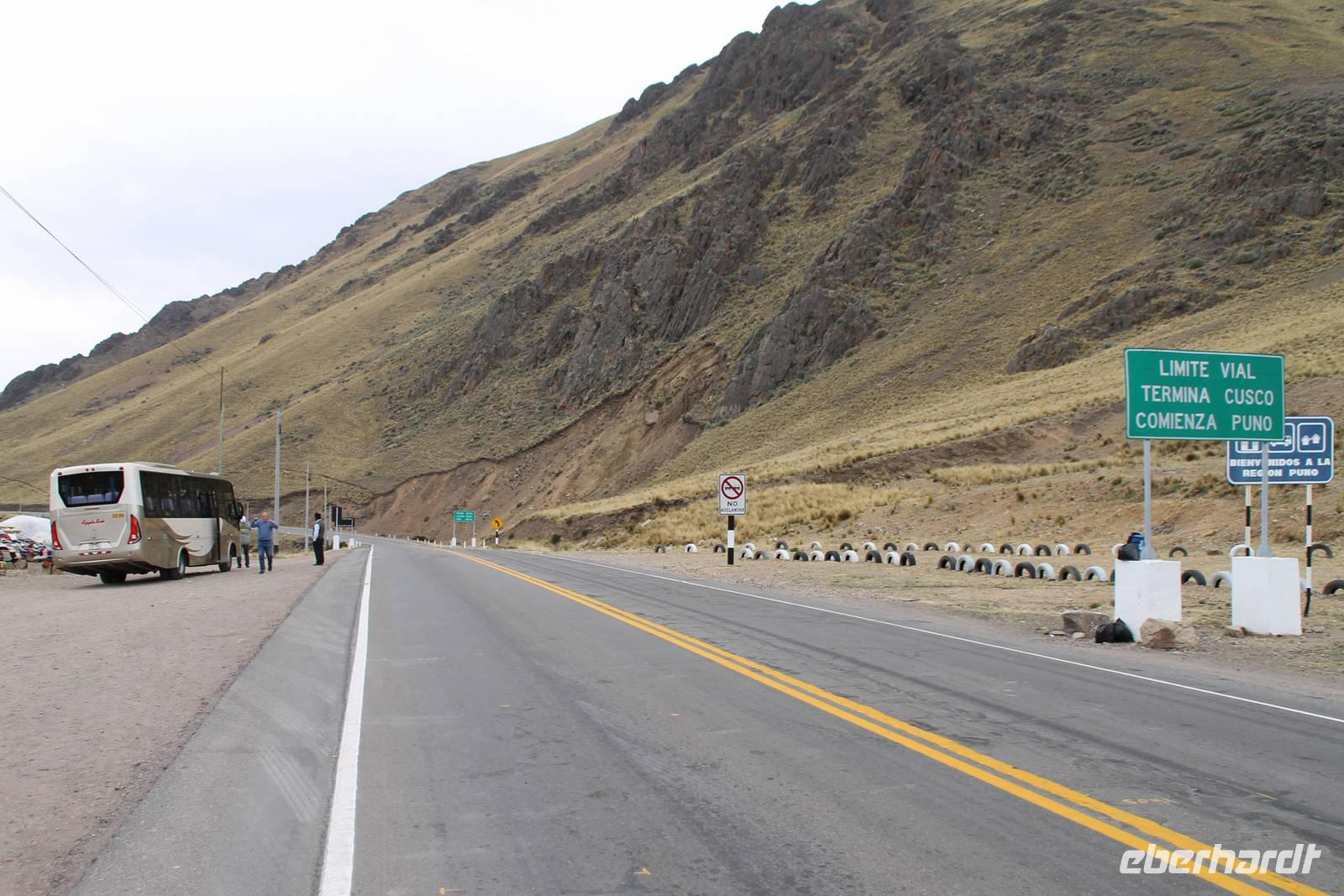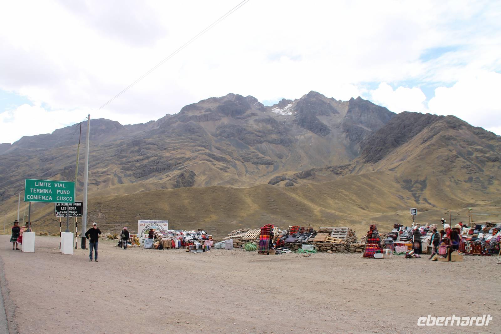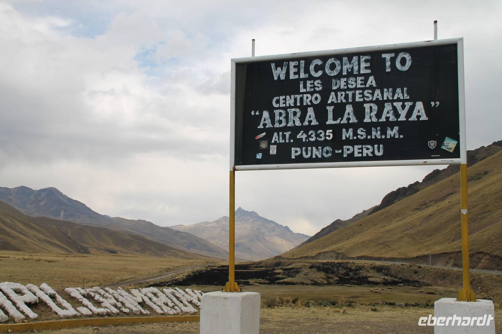 Nach einer wieder recht kurzen Nacht, fuhren wir nach dem Frühstück von Cuzco weiter in Richtung Puno. In Andahuaylillas, einem kleinen Ort entlang unserer Fahrtroute, besuchten wir eine Kirche, welche aufgrund ihrer Fresken und farbigen Deckenbemalung, auch die „Sixtinische Kapelle" bzw. „Sixtiner-Kirche" Perus genannt wird. Von dort aus fuhren wir etwa 2 Stunden zum Viracocha-Tempel in Raqui. Unsere Reiseleiterin Yuenna erklärte uns alles über die historischen Gebäude und die Zeit der Tiahuanaco-Kultur. Danach fuhren wir zum Mittagessen zum „Feliphon" und von dort hinauf zum La Raya-Pass auf 4335 m Höhe. Hier machten wir eine kleine Fotopause und sahen uns an den Verkaufsständen nach einem Souvenir um. Man merkte die Höhe deutlich und bewegte sich dementsprechend langsamer.