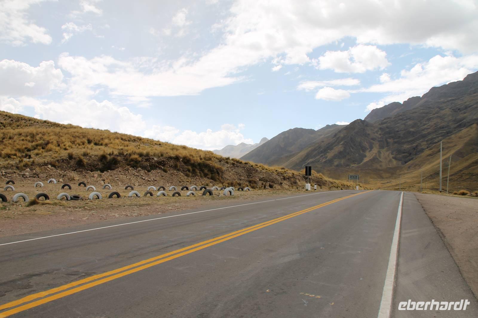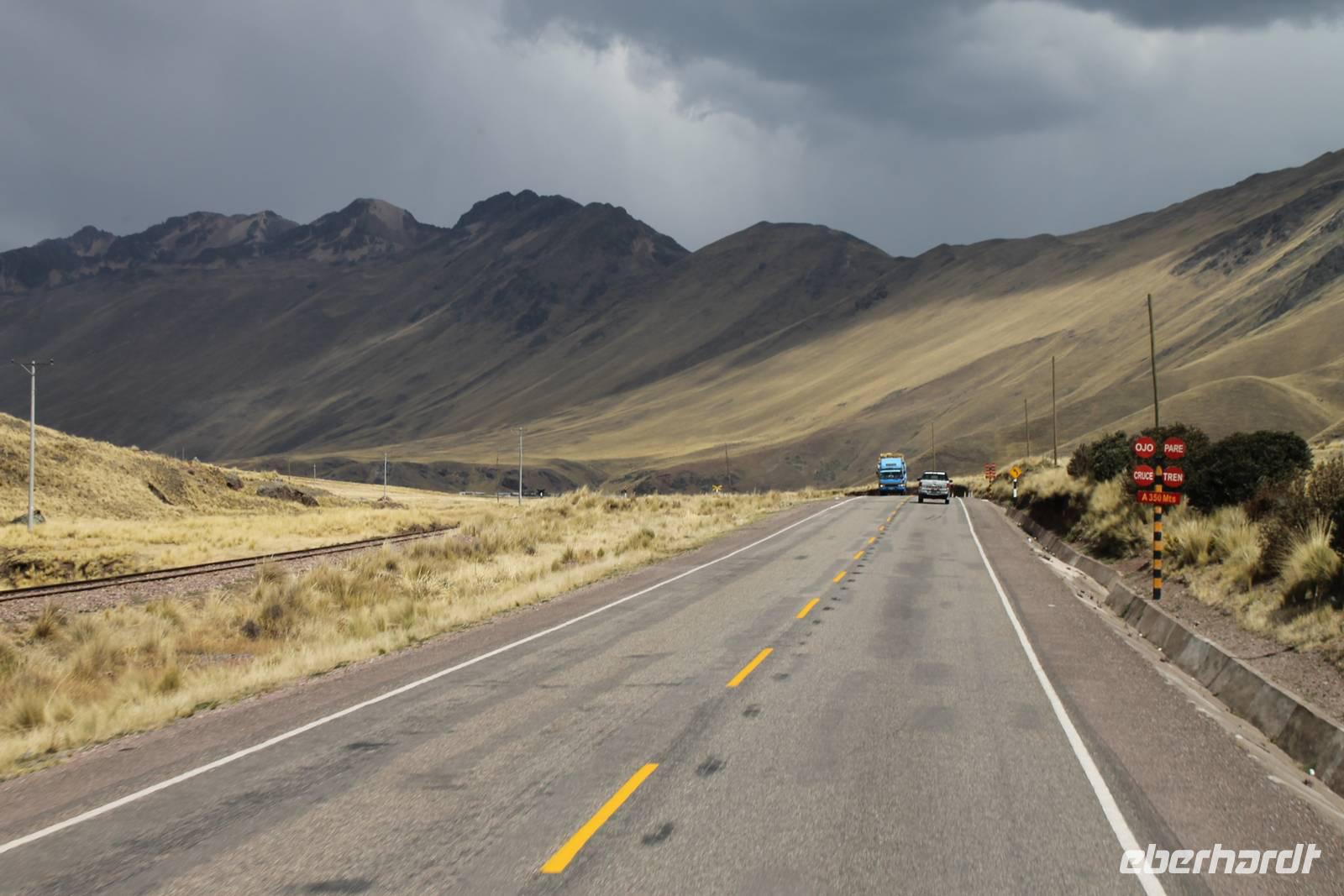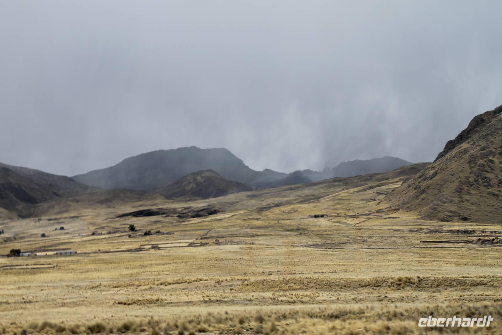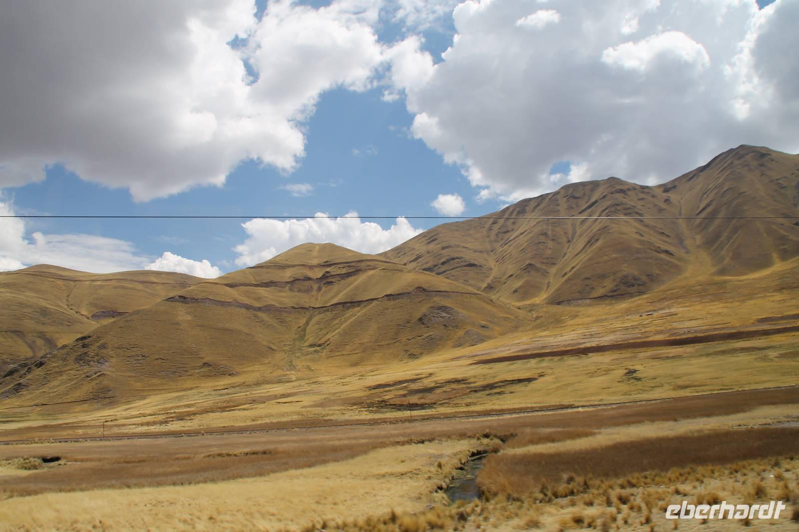 Nach einer wieder recht kurzen Nacht, fuhren wir nach dem Frühstück von Cuzco weiter in Richtung Puno. In Andahuaylillas, einem kleinen Ort entlang unserer Fahrtroute, besuchten wir eine Kirche, welche aufgrund ihrer Fresken und farbigen Deckenbemalung, auch die „Sixtinische Kapelle" bzw. „Sixtiner-Kirche" Perus genannt wird. Von dort aus fuhren wir etwa 2 Stunden zum Viracocha-Tempel in Raqui. Unsere Reiseleiterin Yuenna erklärte uns alles über die historischen Gebäude und die Zeit der Tiahuanaco-Kultur. Danach fuhren wir zum Mittagessen zum „Feliphon" und von dort hinauf zum La Raya-Pass auf 4335 m Höhe. Hier machten wir eine kleine Fotopause und sahen uns an den Verkaufsständen nach einem Souvenir um. Man merkte die Höhe deutlich und bewegte sich dementsprechend langsamer.