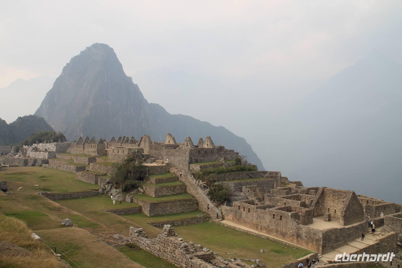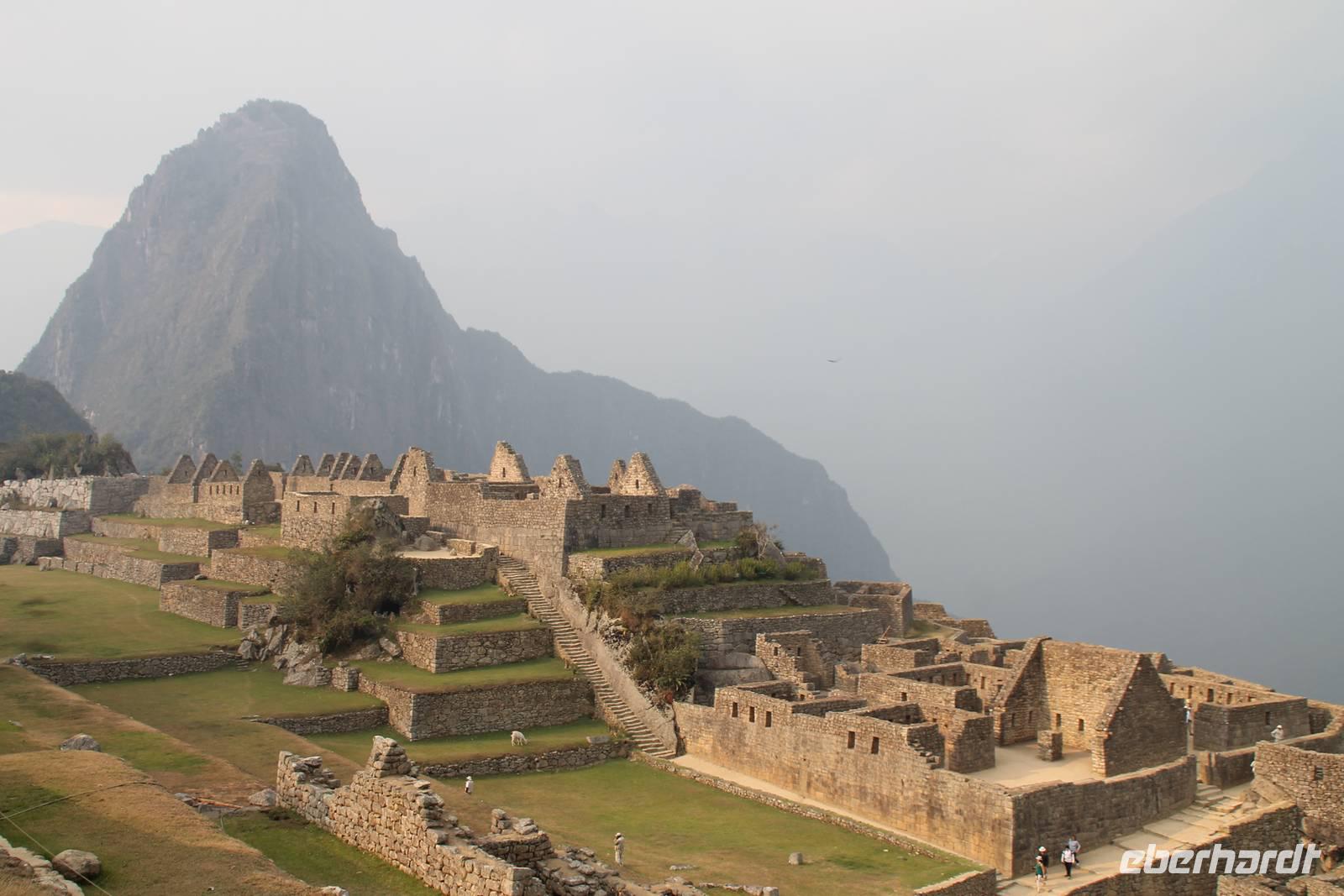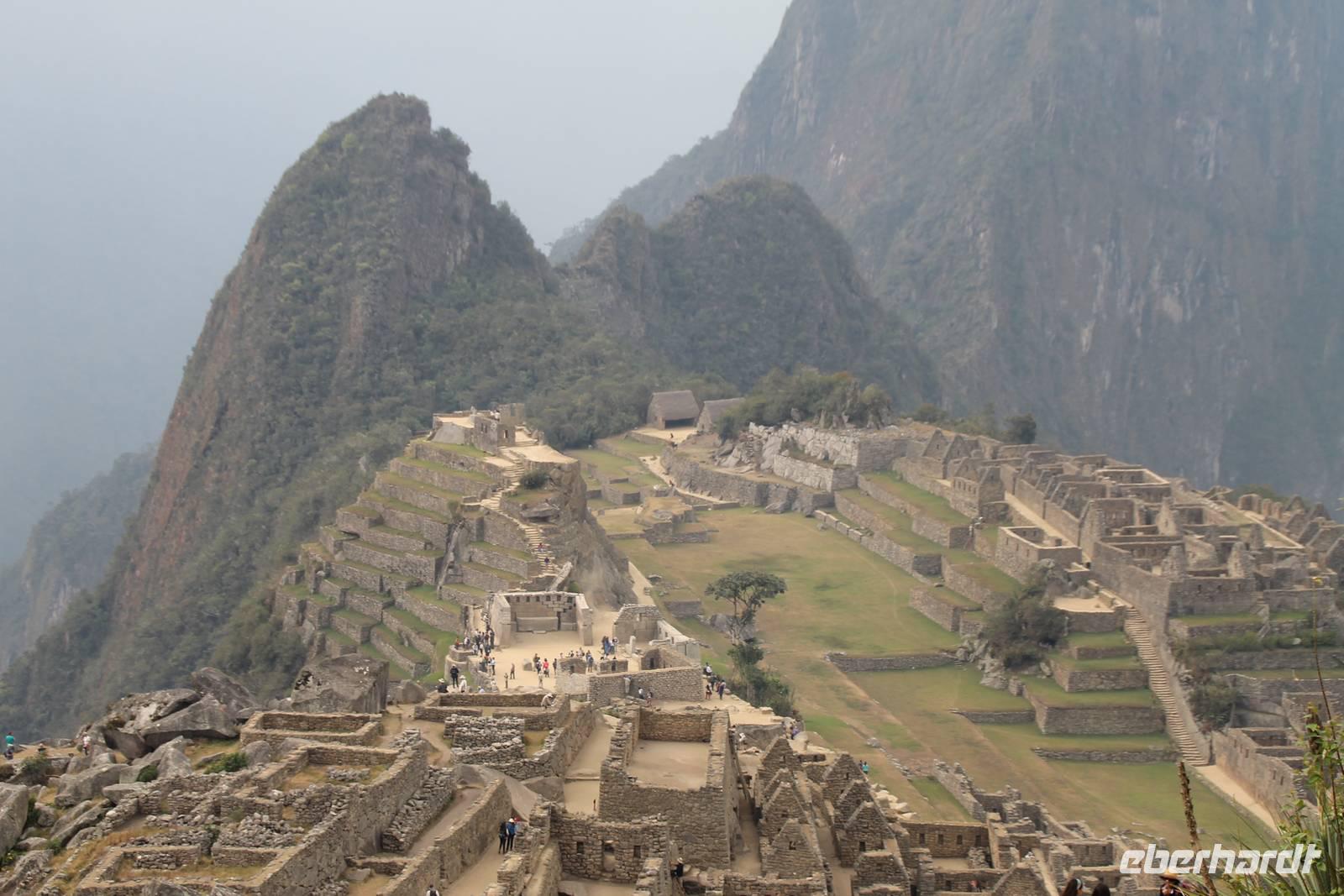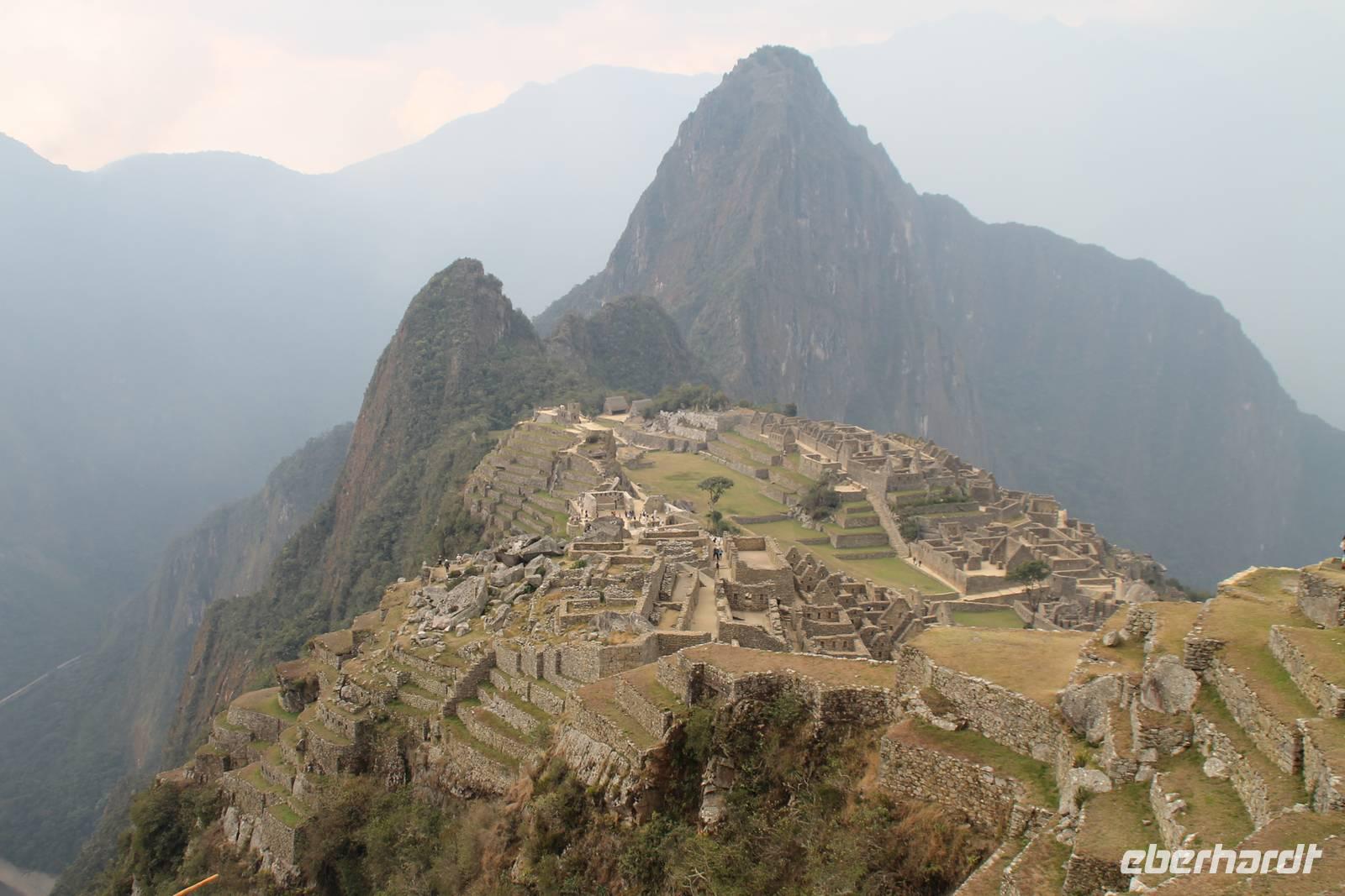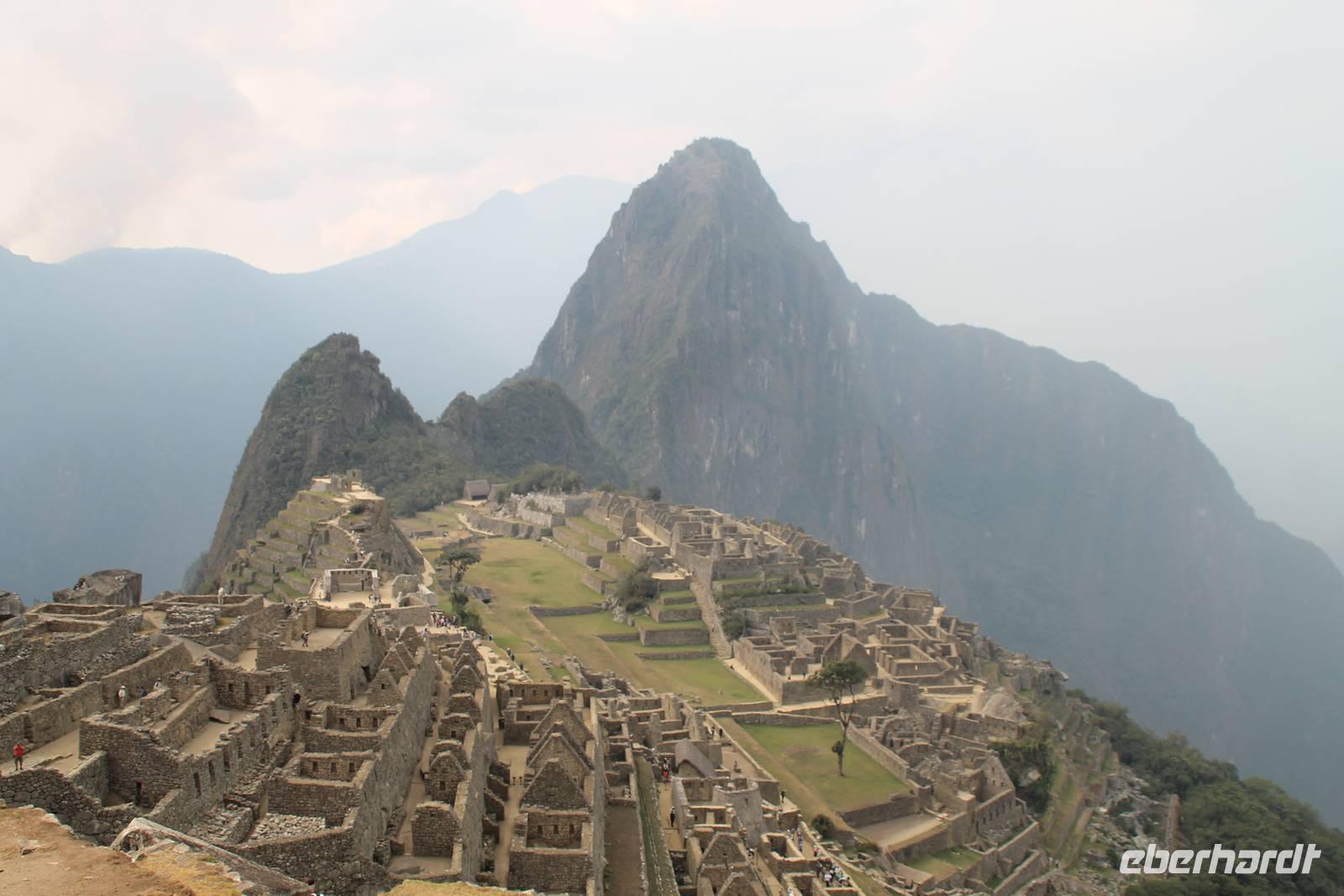 Nach einer kleinen Toilettenpause und dem Check-in, spazierten wir etwa 5min. zu den Pendelbussen und fuhren hoch zum „alten Berg" - „Machu Pichu". Die in den Bergen gelegene Inkastadt war eines der eindrucksvollsten Erlebnisse unserer Reise. Oben angekommen gingen wir erst einmal ins Restaurant und genossen unser leckeres Mittagessen, welches im Ticketpreis für Machu Pichu mit inkludiert war. Danach spazierten wir für ca. 3 Stunden gemütlich durch die 1911 entdeckte Inkaanlage. Yuenna beeindruckte uns wieder einmal mit ihrem unglaublichen Wissen über die Inkas und die späteren Forschungsarbeiten.