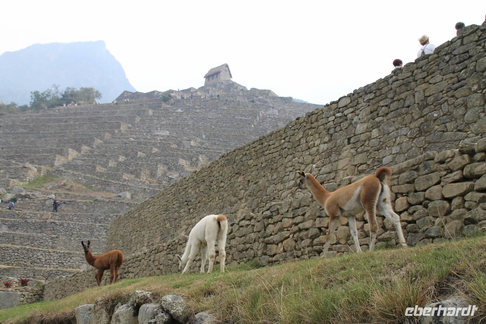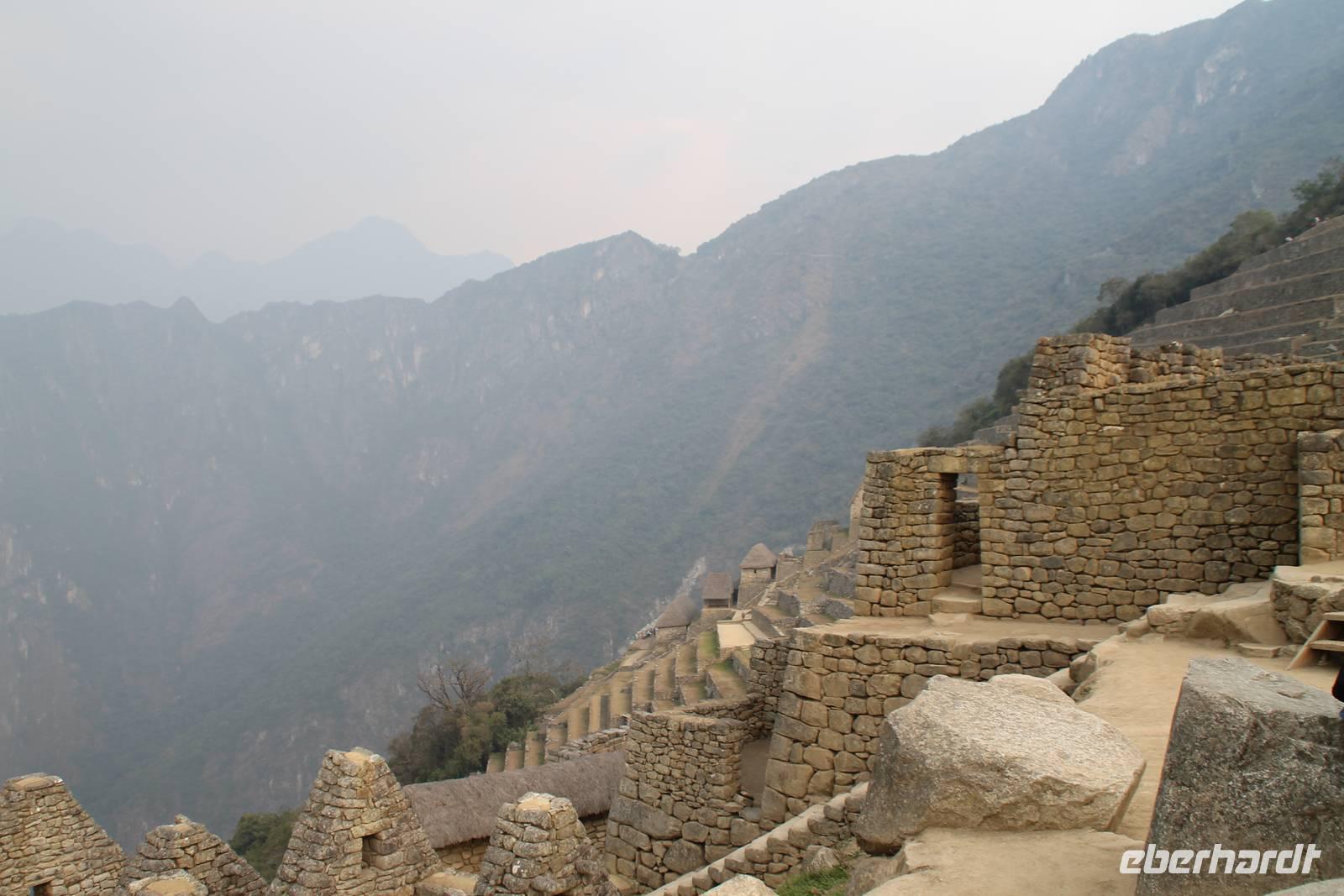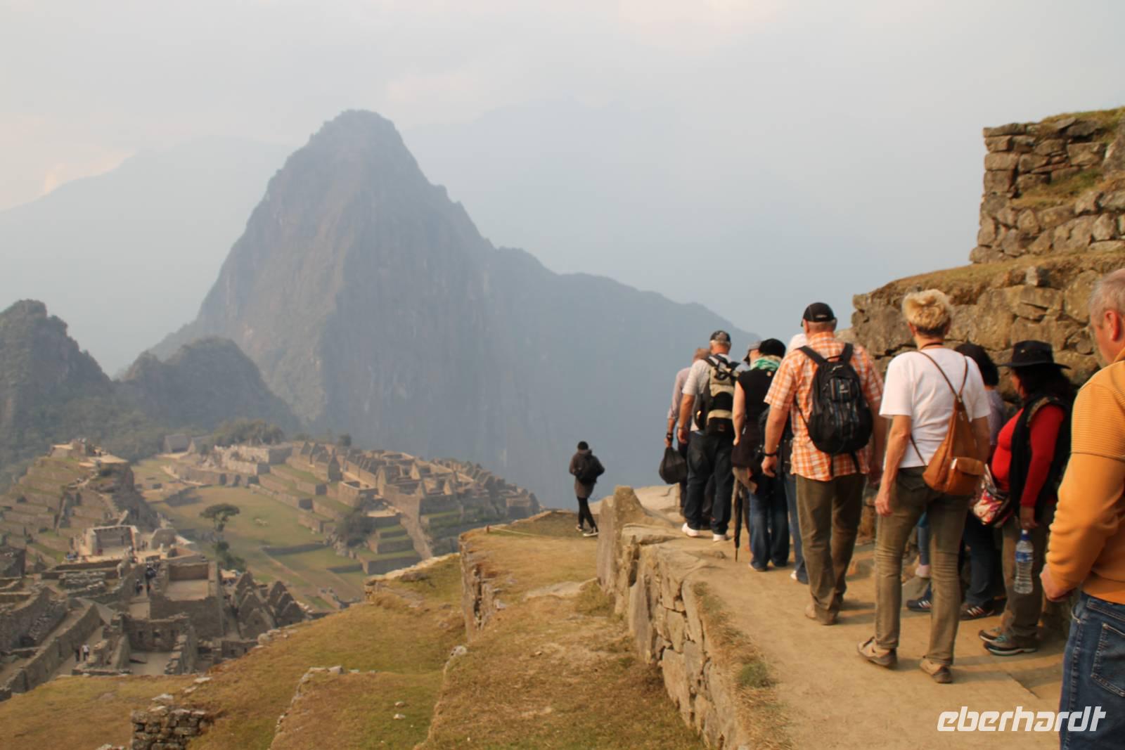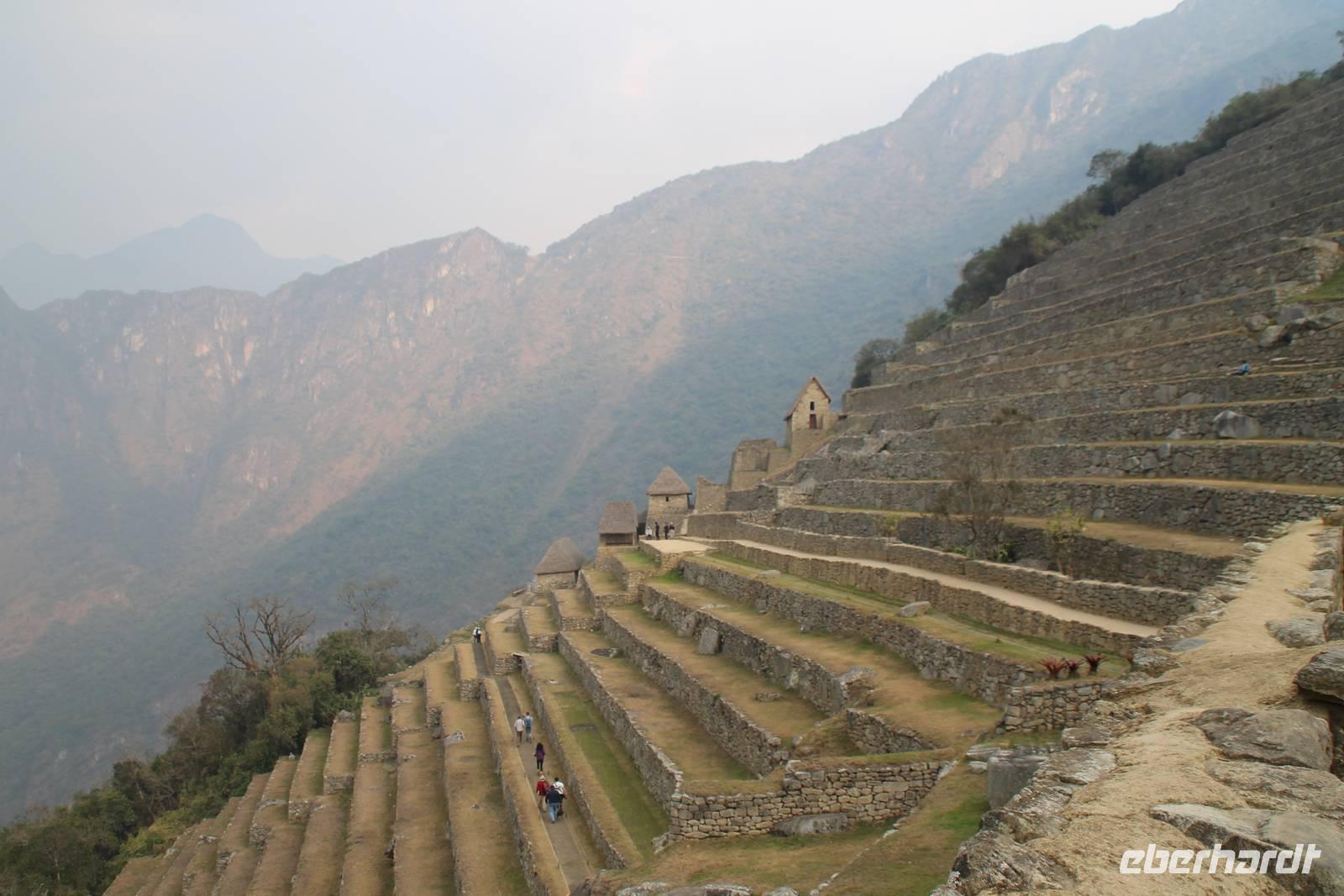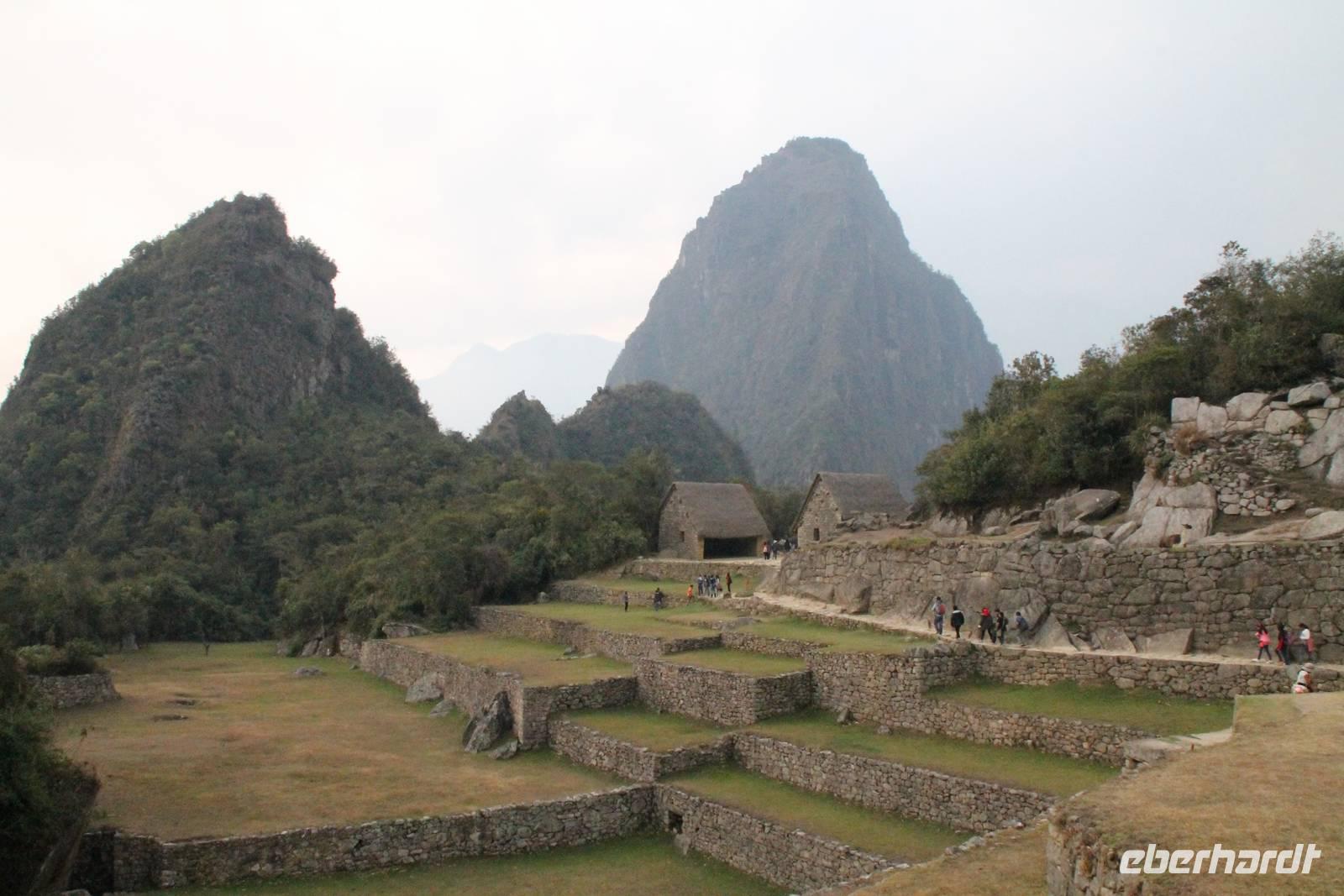Nach einer kleinen Toilettenpause und dem Check-in, spazierten wir etwa 5min. zu den Pendelbussen und fuhren hoch zum „alten Berg" - „Machu Pichu". Die in den Bergen gelegene Inkastadt war eines der eindrucksvollsten Erlebnisse unserer Reise. Oben angekommen gingen wir erst einmal ins Restaurant und genossen unser leckeres Mittagessen, welches im Ticketpreis für Machu Pichu mit inkludiert war. Danach spazierten wir für ca. 3 Stunden gemütlich durch die 1911 entdeckte Inkaanlage. Yuenna beeindruckte uns wieder einmal mit ihrem unglaublichen Wissen über die Inkas und die späteren Forschungsarbeiten.