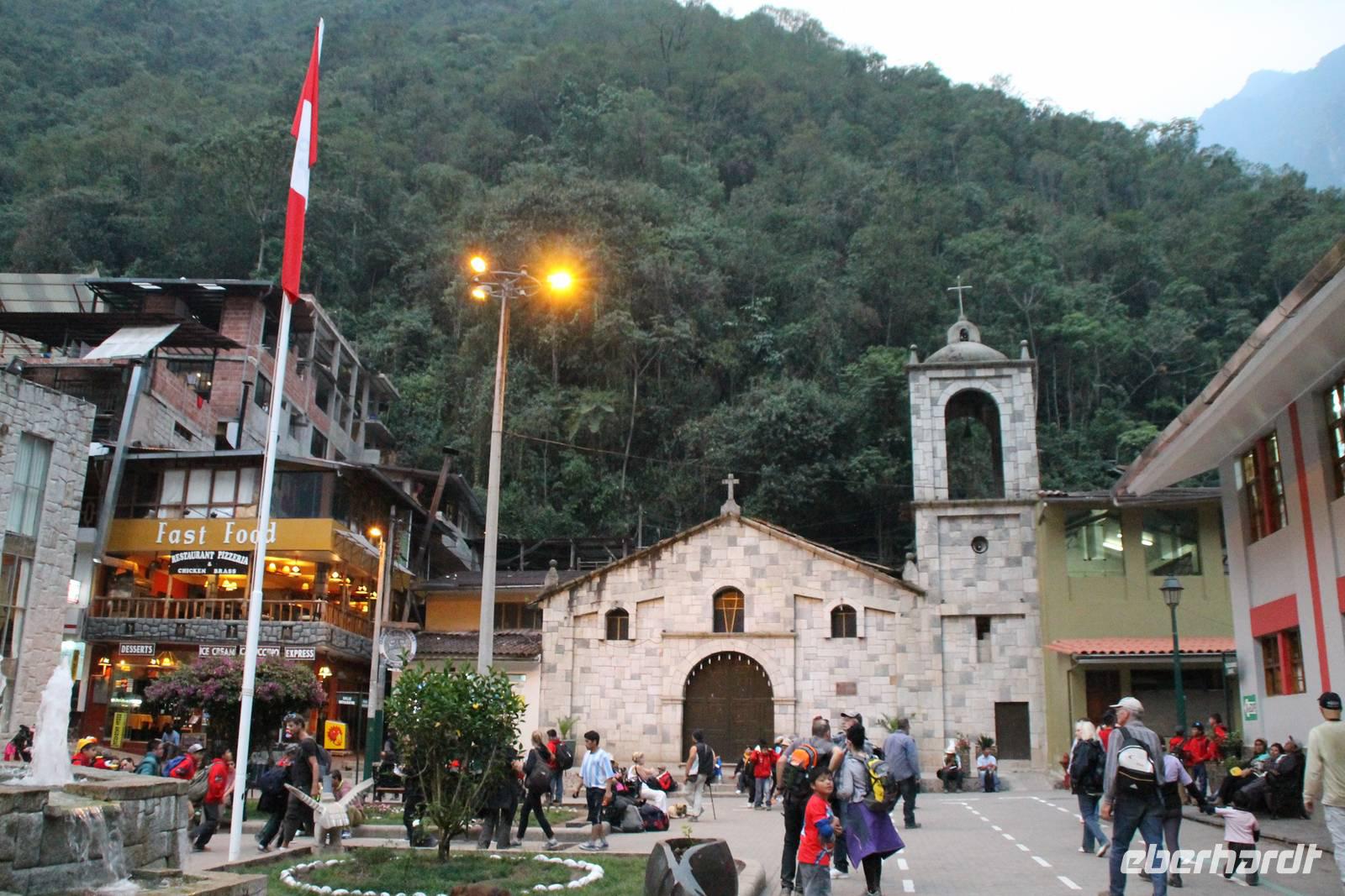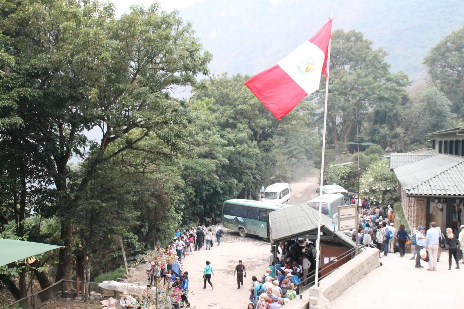 Unterwegs erklärte unsere Reiseleiterin Yuenna viel über Land & Leute und das Leben in den Bergen. Eine halbe Stunde vor Aguas Calientes machte sich die Vegetation des Regenwaldes bemerkbar, indem über den Panoramafenstern des Zugdaches die Baumkronen zu einem natürlichen Tunnel zusammenwuchsen. In Aguas Calientes angekommen, brachten wir unser Handgepäck erst einmal zur Hotel „El Mapi" und füllten unsere Hotelanmeldungen aus.