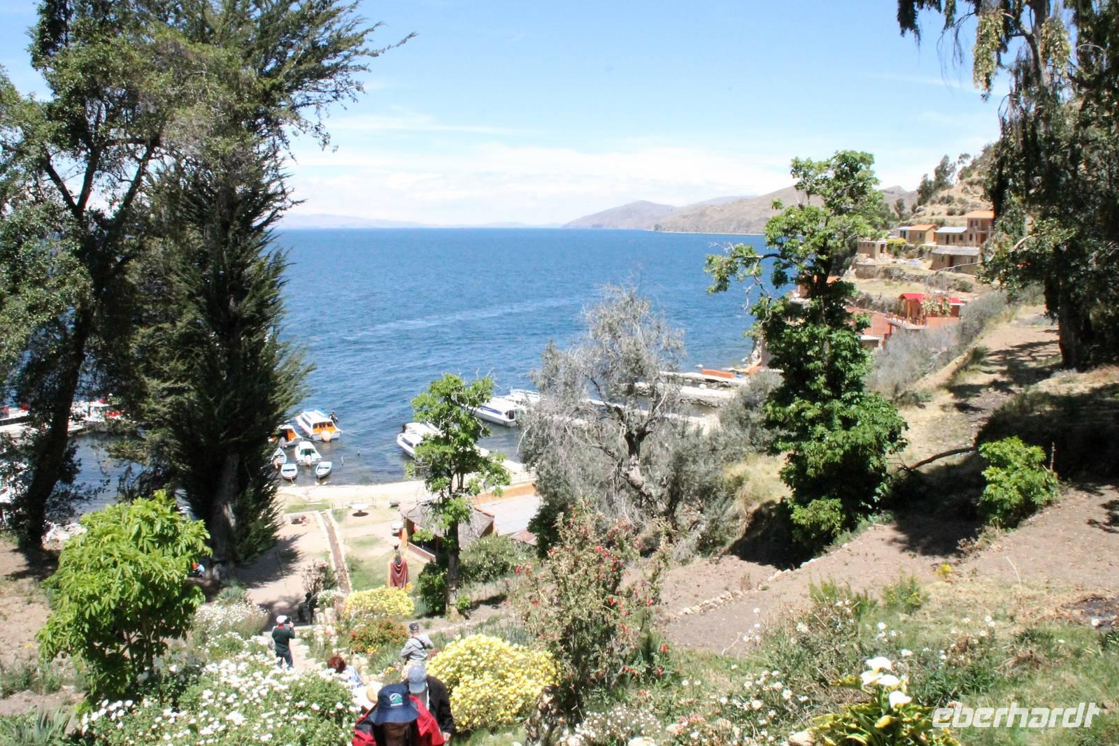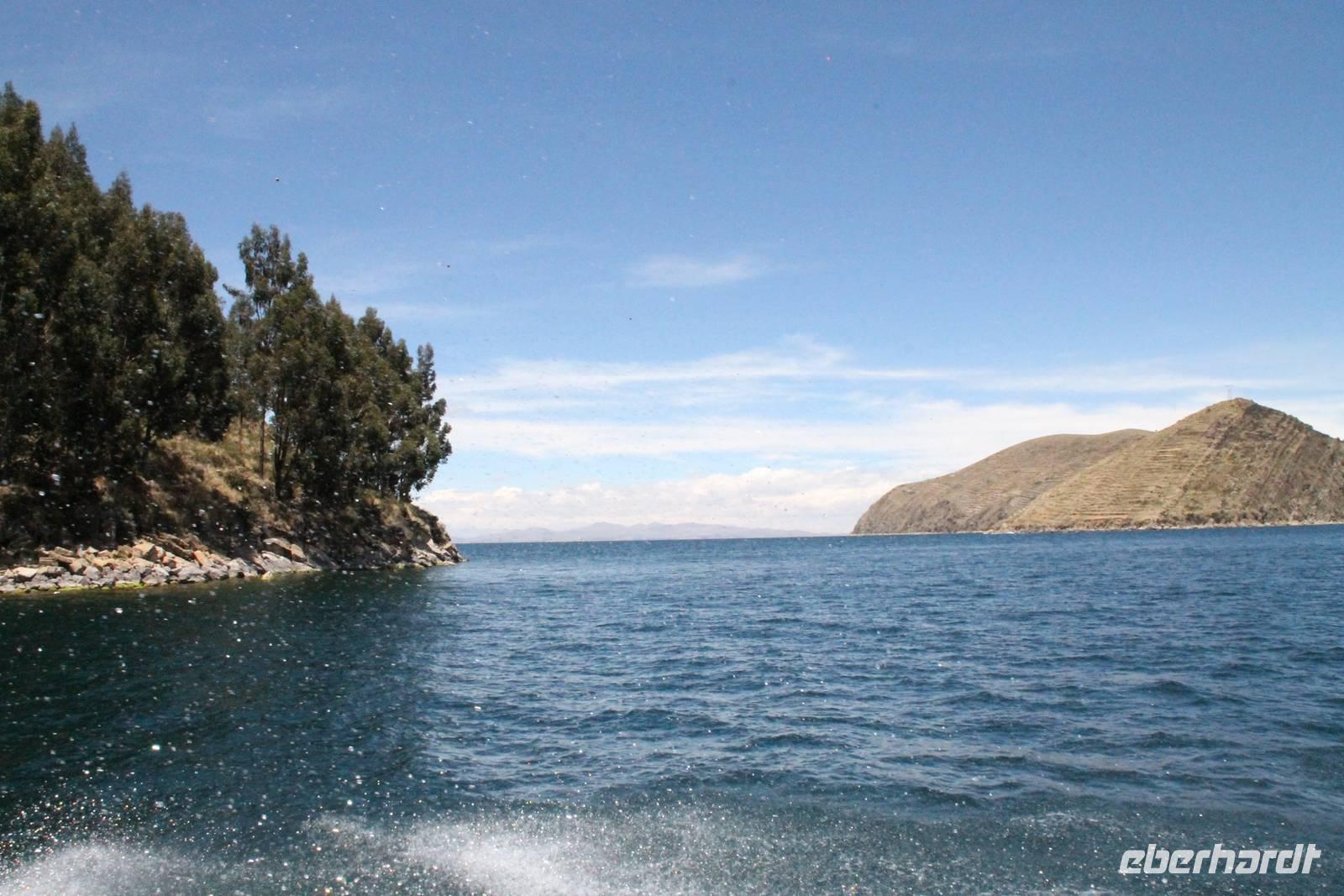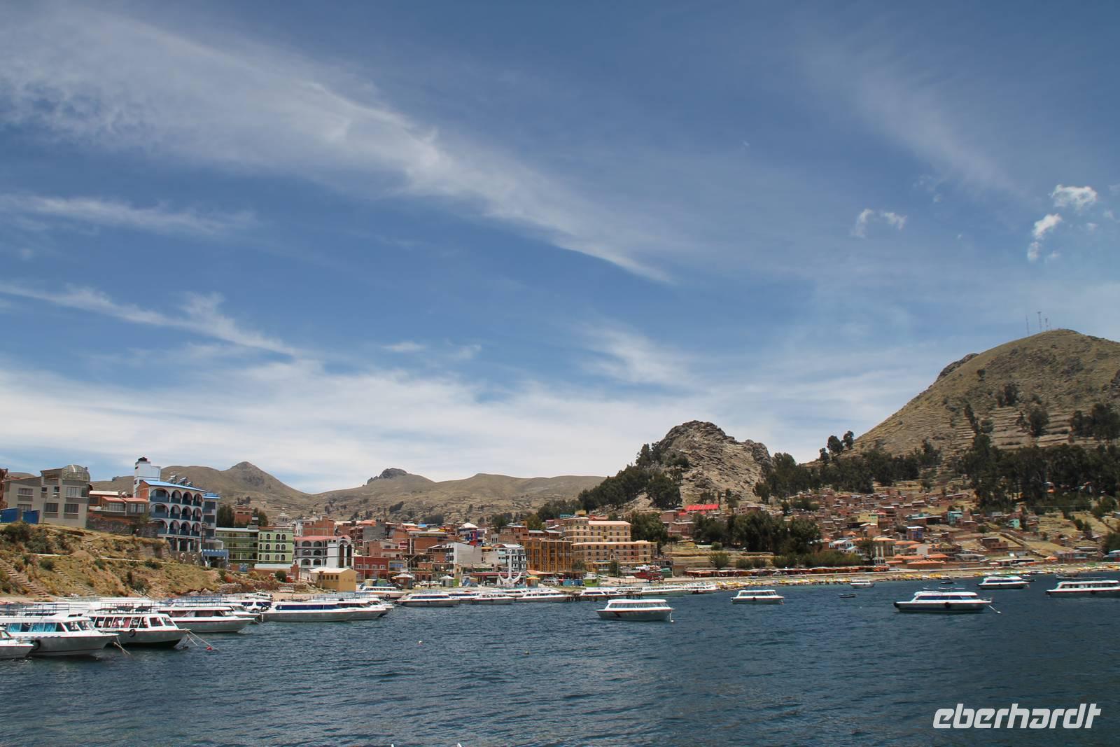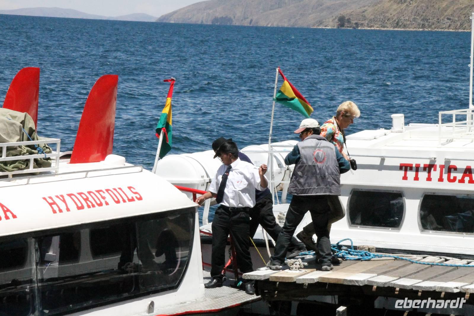 Unser erstes Ziel in Bolivien war die Stadt Copacabana, in der wir die „Basilica de La Virgen de la Candelaria" besichtigten. Im Inneren befindet sich eine aus dunklem Holz geschnitzte Madonna, welche Francisco Yupanqui, der Enkel des letzten Inkas, geschaffen hat. Der Figur werden unzählige Wunder zugeschrieben. Nach der Besichtigung fuhren wir zum Hafen und von dort mit Kapitän Freddy und Bootsmann Eddy in einem „Hydrofoil"- Boot zur Sonneninsel. Auf der Insel stiegen wir zur Quelle der Jugend empor, tranken von dem Jugend versprechenden Wasser (wer wollte) und fanden uns anschließend im Restaurant „Uma Kollu" ein. Von dort hatten wir einen tollen Blick auf den Titicacasee und die im See liegenden Inseln. Mit dem Boot ging es anschließend zur Mondinsel, um die Überreste vergangener Tempelanlagen anzusehen, leider war davon nicht mehr viel übrig.