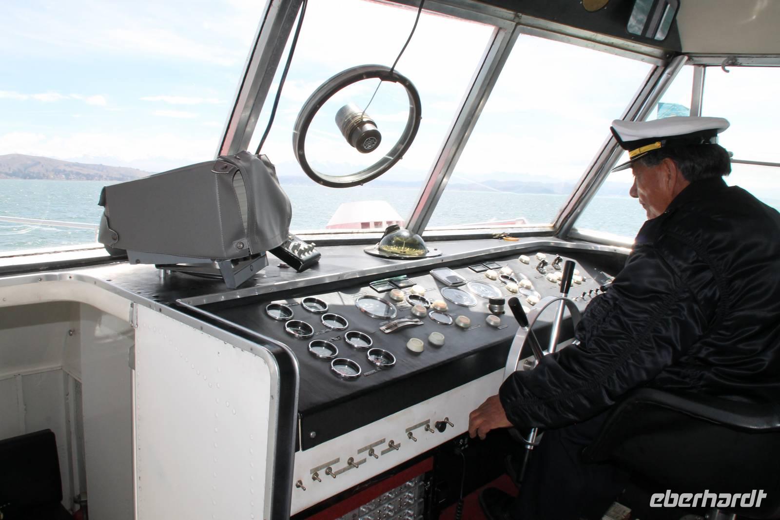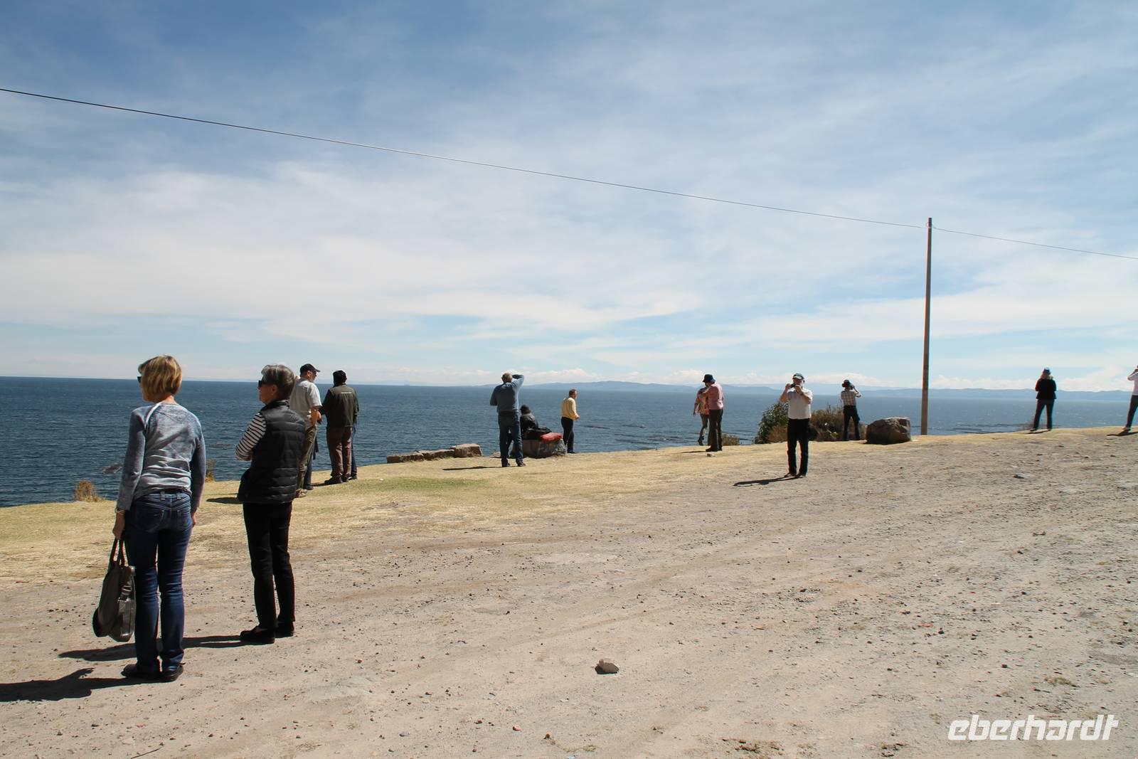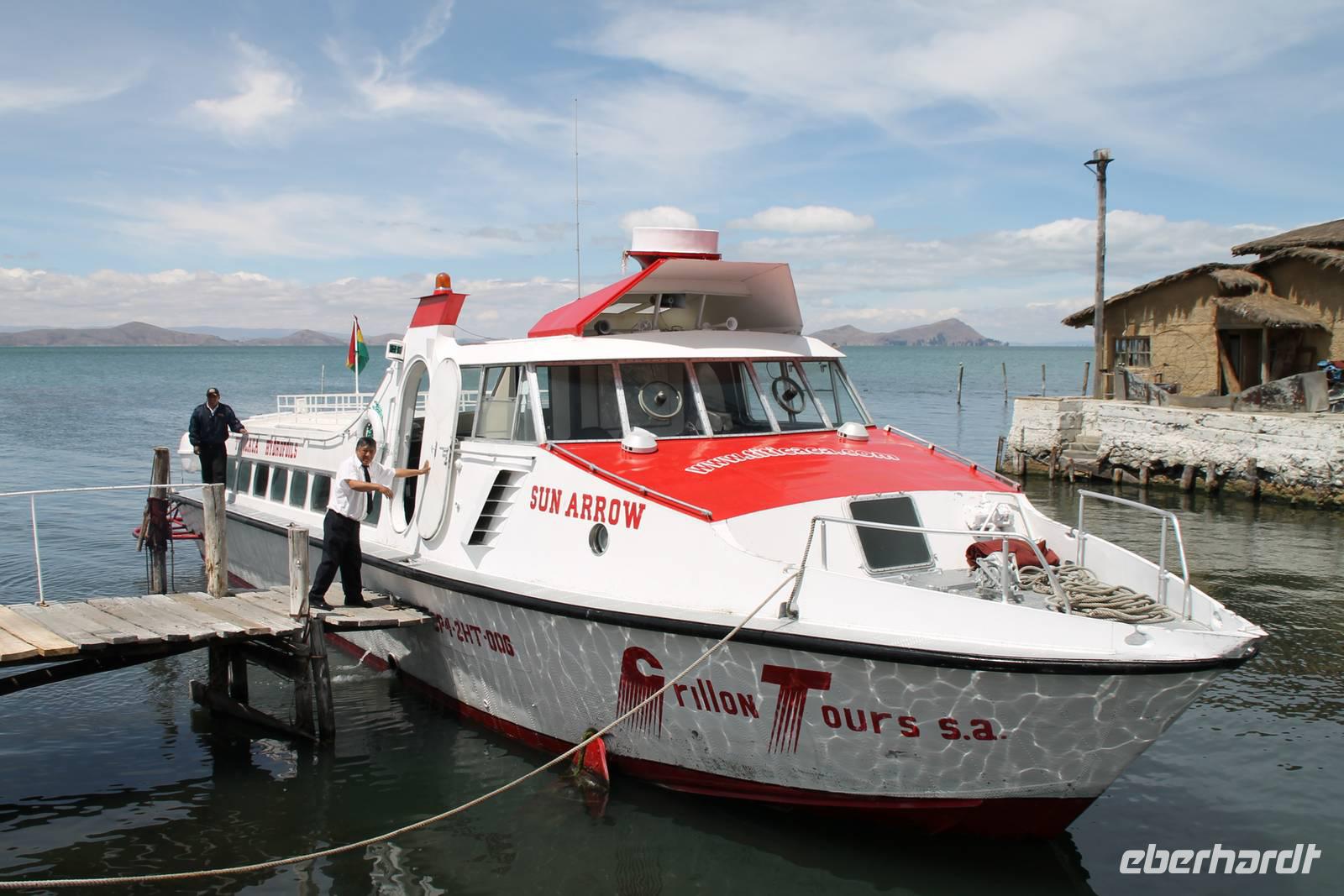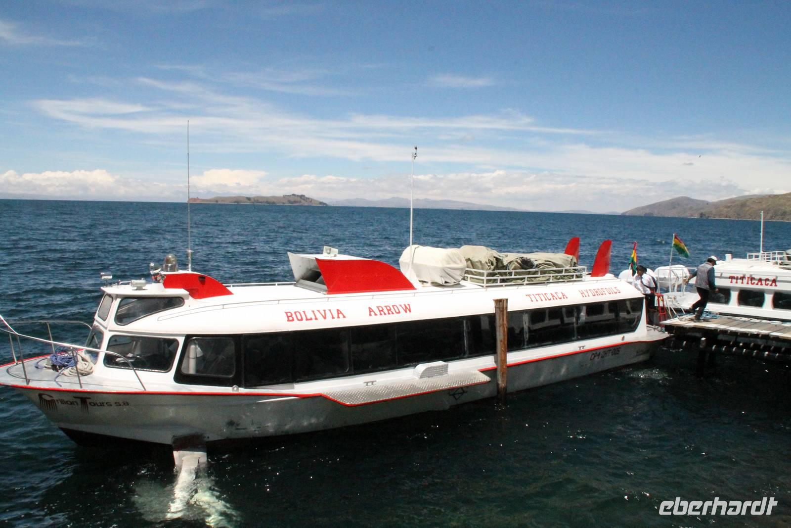 Unser erstes Ziel in Bolivien war die Stadt Copacabana, in der wir die „Basilica de La Virgen de la Candelaria" besichtigten. Im Inneren befindet sich eine aus dunklem Holz geschnitzte Madonna, welche Francisco Yupanqui, der Enkel des letzten Inkas, geschaffen hat. Der Figur werden unzählige Wunder zugeschrieben. Nach der Besichtigung fuhren wir zum Hafen und von dort mit Kapitän Freddy und Bootsmann Eddy in einem „Hydrofoil"- Boot zur Sonneninsel. Auf der Insel stiegen wir zur Quelle der Jugend empor, tranken von dem Jugend versprechenden Wasser (wer wollte) und fanden uns anschließend im Restaurant „Uma Kollu" ein. Von dort hatten wir einen tollen Blick auf den Titicacasee und die im See liegenden Inseln. Mit dem Boot ging es anschließend zur Mondinsel, um die Überreste vergangener Tempelanlagen anzusehen, leider war davon nicht mehr viel übrig.