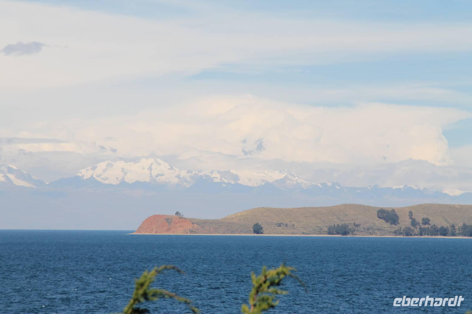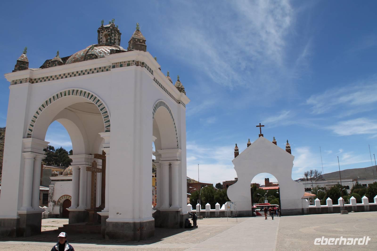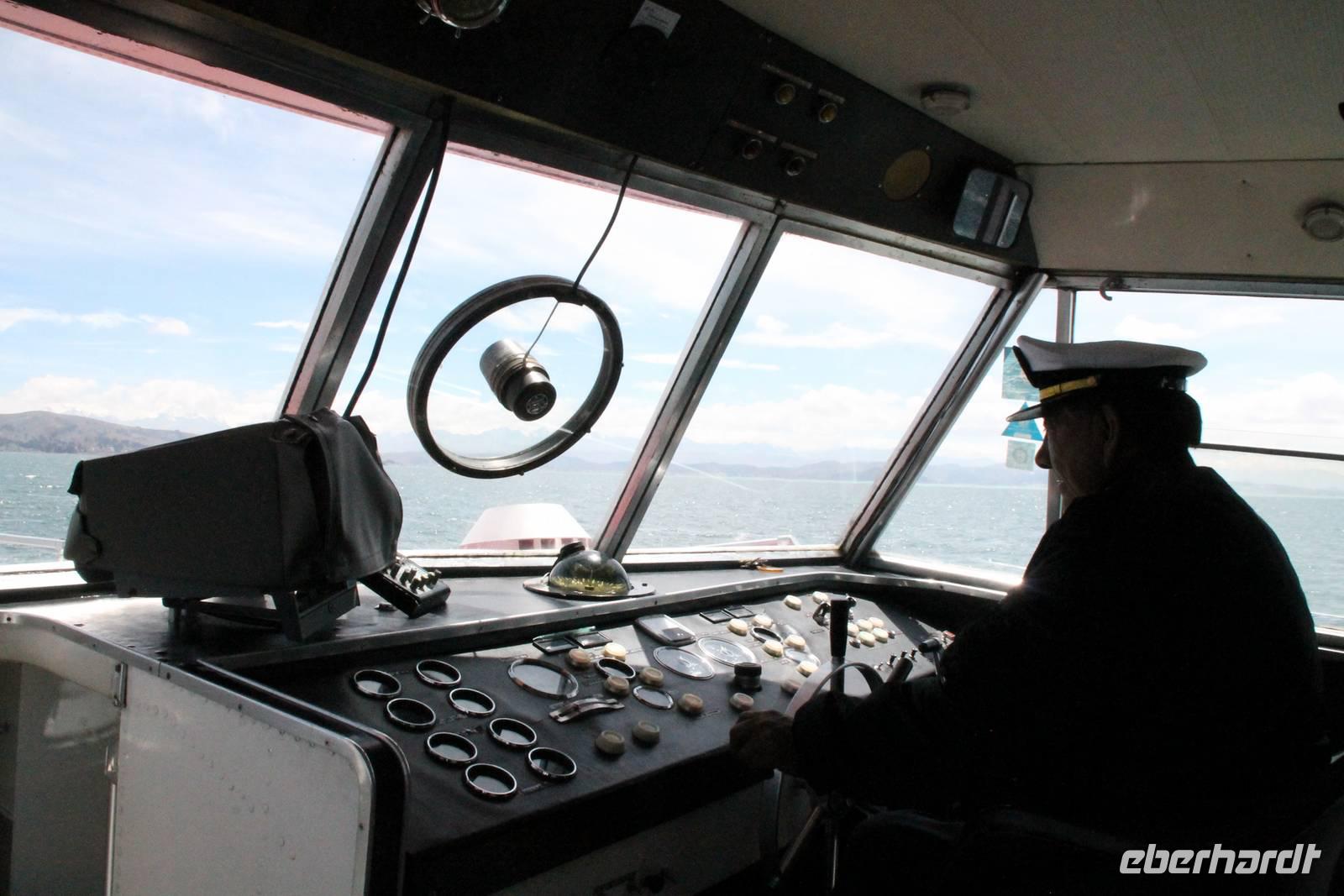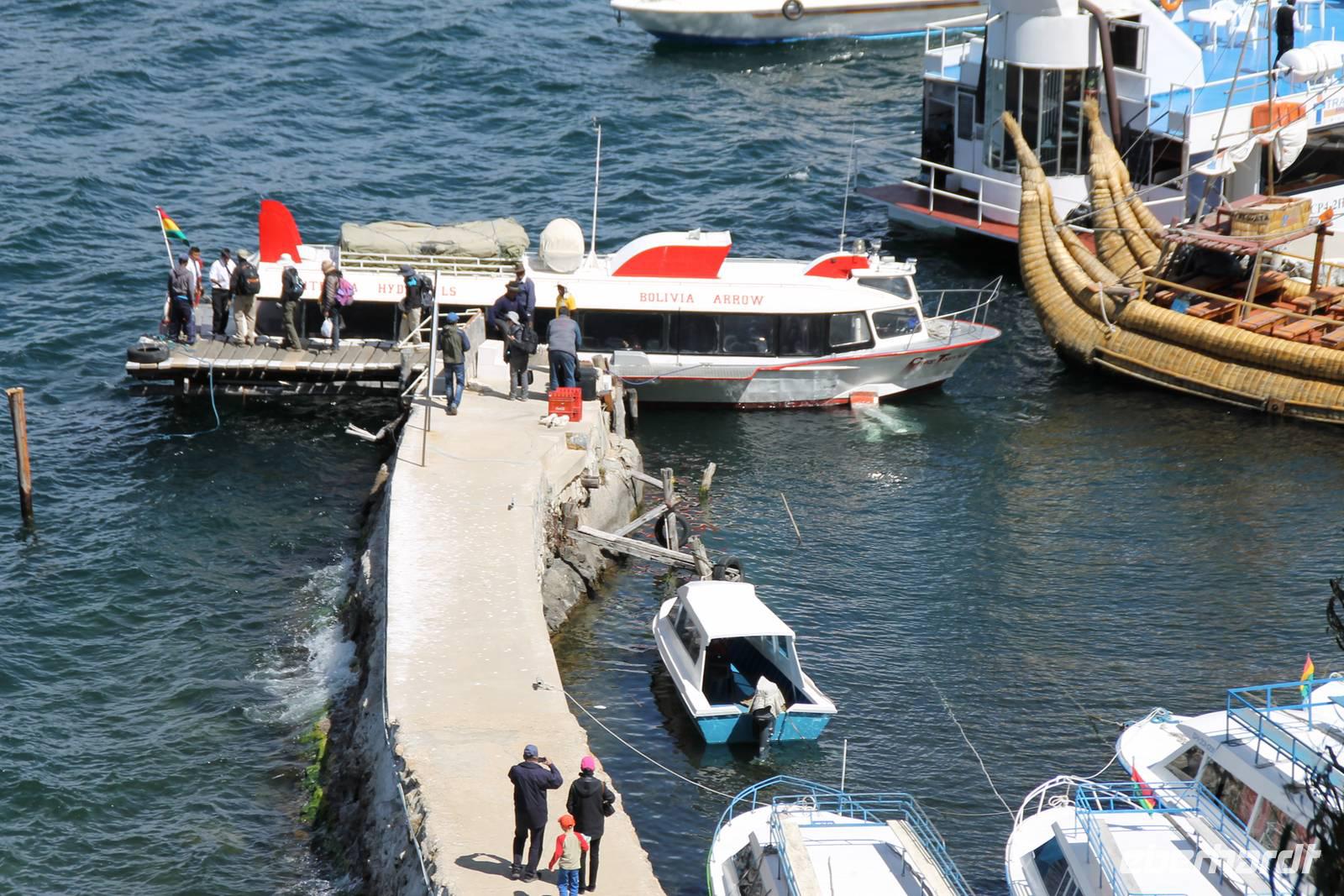 Unser erstes Ziel in Bolivien war die Stadt Copacabana, in der wir die „Basilica de La Virgen de la Candelaria" besichtigten. Im Inneren befindet sich eine aus dunklem Holz geschnitzte Madonna, welche Francisco Yupanqui, der Enkel des letzten Inkas, geschaffen hat. Der Figur werden unzählige Wunder zugeschrieben. Nach der Besichtigung fuhren wir zum Hafen und von dort mit Kapitän Freddy und Bootsmann Eddy in einem „Hydrofoil"- Boot zur Sonneninsel. Auf der Insel stiegen wir zur Quelle der Jugend empor, tranken von dem Jugend versprechenden Wasser (wer wollte) und fanden uns anschließend im Restaurant „Uma Kollu" ein. Von dort hatten wir einen tollen Blick auf den Titicacasee und die im See liegenden Inseln. Mit dem Boot ging es anschließend zur Mondinsel, um die Überreste vergangener Tempelanlagen anzusehen, leider war davon nicht mehr viel übrig.