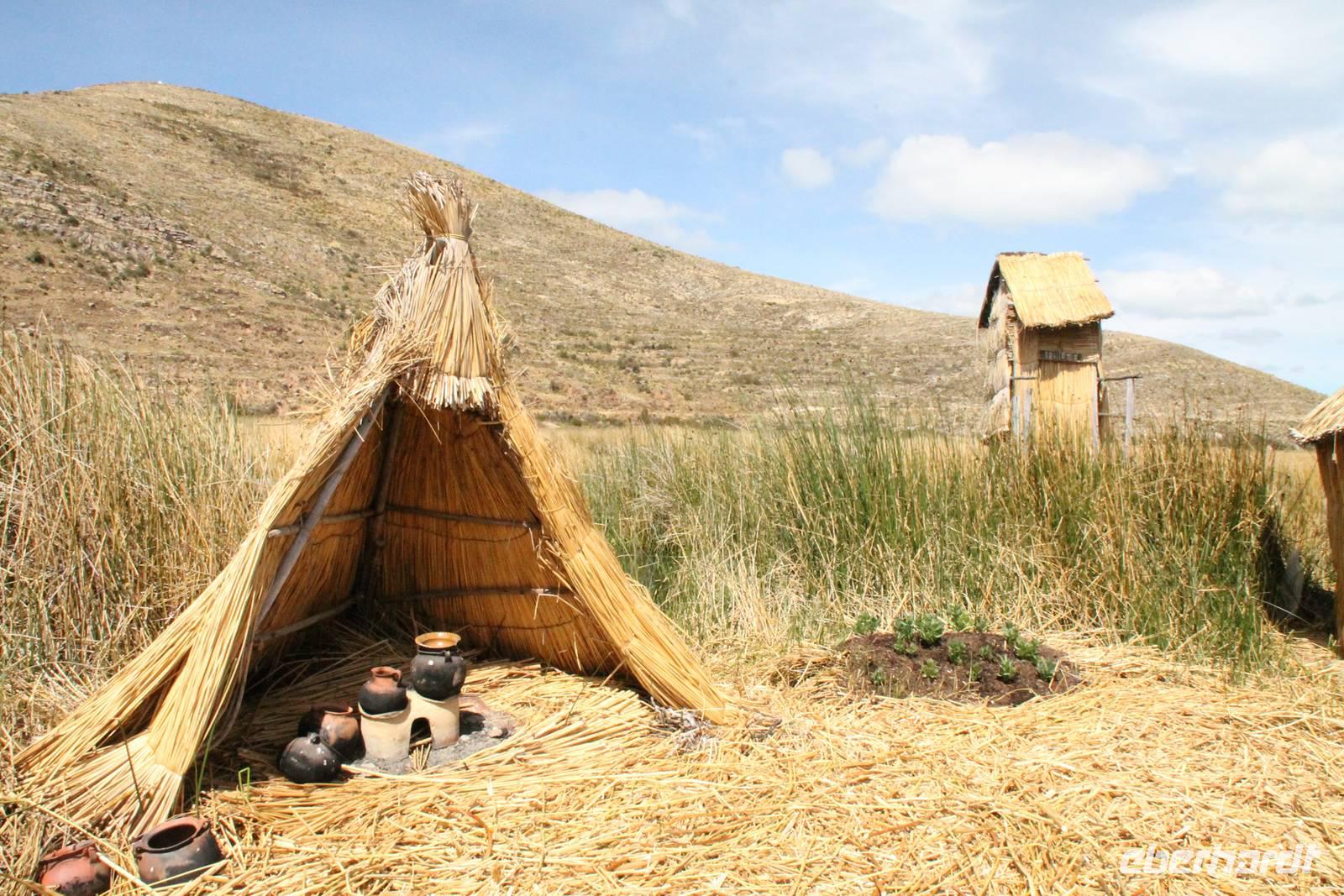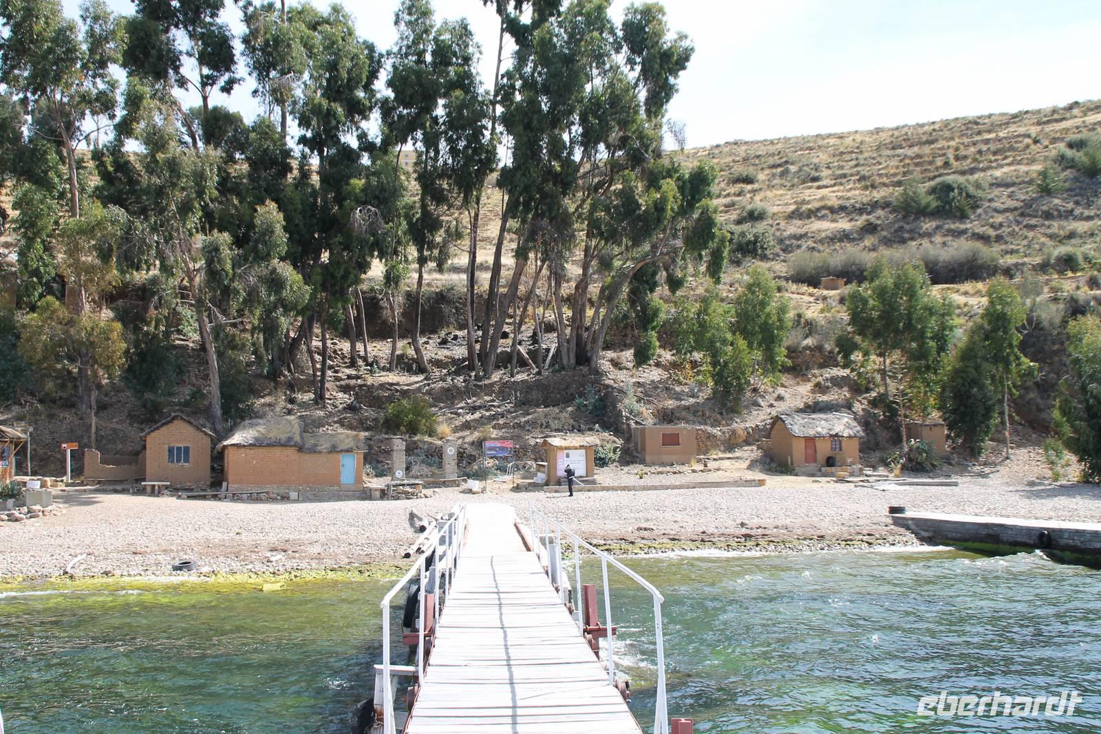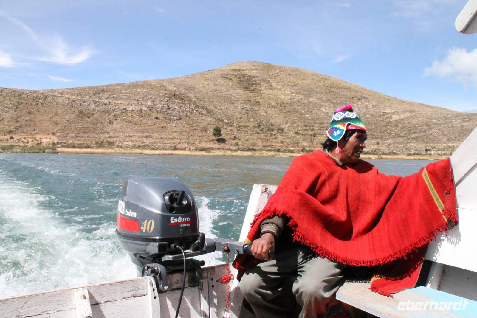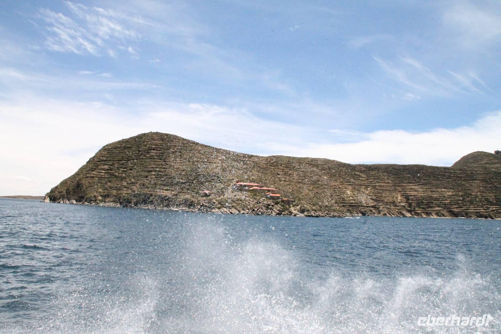 Danach ging es weiter mit dem Boot zum Hotel. Auf der Fahrt dorthin probierten wir einen Rujero-Tresterschnaps und wurden mit dem Aymara-Spruch: " Sei kein Lügner, sei nicht faul und sei kein Dieb" gesegnet. Die wichtigste Sehenswürdigkeit der Mondinsel ist der „Tempel der Sonnenjungfrauen", der Legende nach der Ort, an dem Wiracocha dem Mond befahl, in den Himmel aufzusteigen. Am späten Nachmittag kamen wir am Bootssteg unseres Utama Hotel in Huatajata an. Aufgrund meiner Fuß-Infektion bestellten wir erst einmal einen Arzt, der mir Antibiotika verschrieb und ebenso einem anderen Reisegast Medikamente mitbrachte.