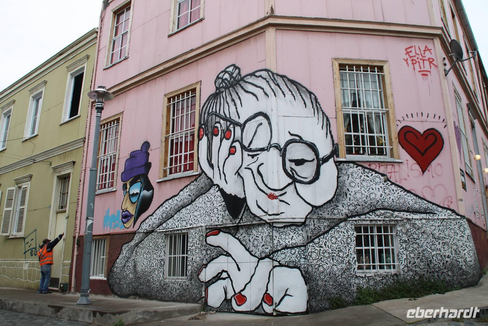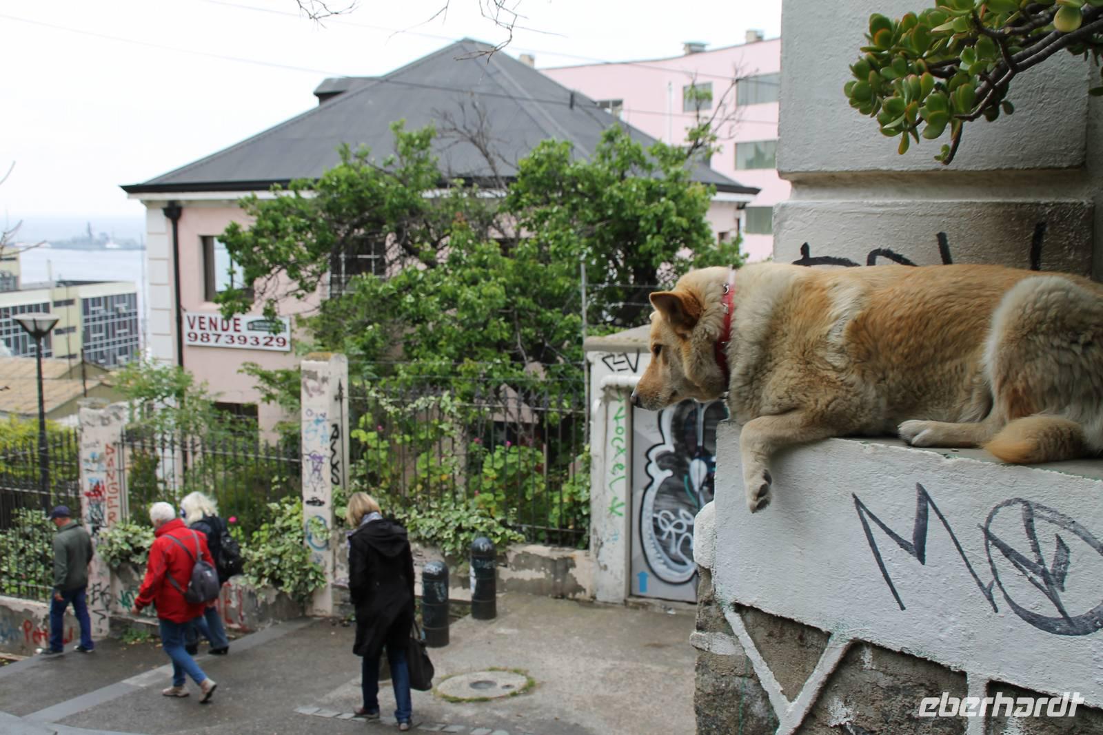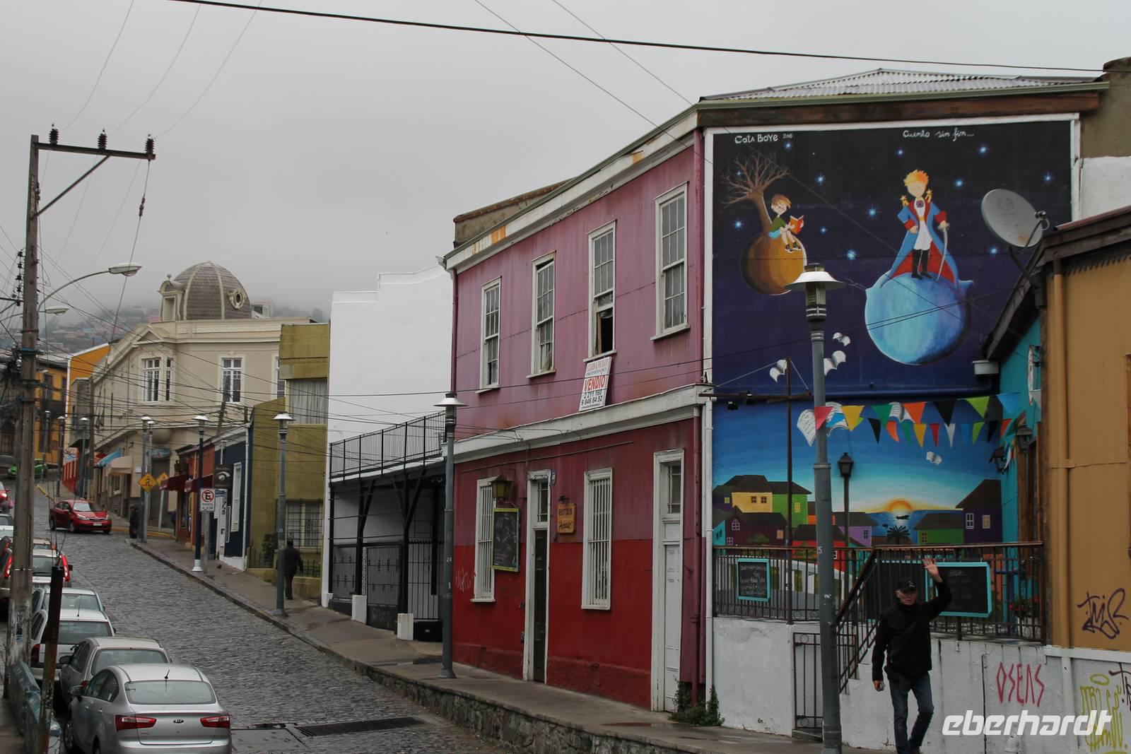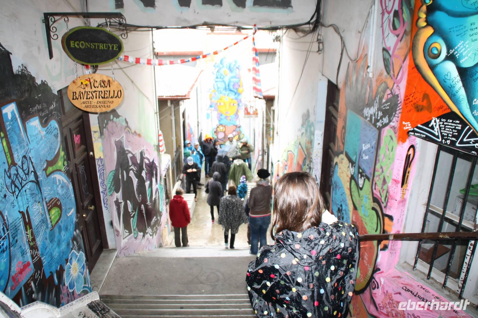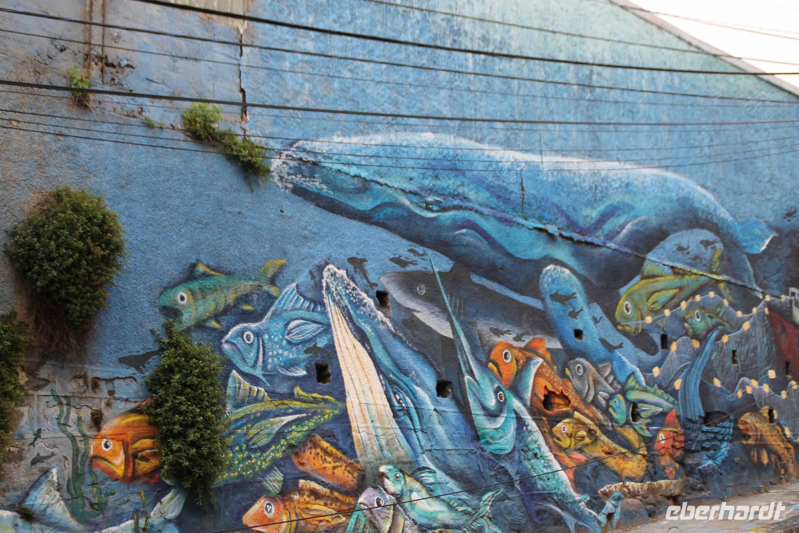 Wir spazierten gemeinsam durch die kunstvollen alten Gassen, die uns mit großen Wandmalereien, an jeder Ecke neu begeisterten. Zum Mittagessen gingen wir zum Hotel-Restaurant Brighton. Von der Terrasse des Restaurants hatten wir einen schönen Blick über den Küstenabschnitt und das Häusermeer Valparaisos. Es gab wieder ein leckeres Wahlmenü, wo man sich zwischen Fisch und Fleisch entscheiden konnte. Nach unserer Mittagspause spazierten wir noch ein wenig durch die schönen engen Gassen bis hinunter ins Stadtzentrum.