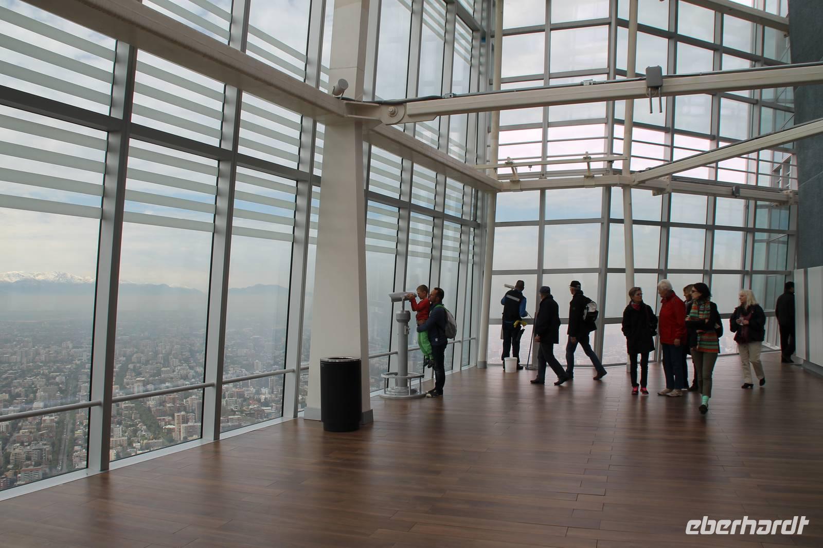 Als erstes verkündeten wir eine tolle Überraschung und liefen gemeinsam zum „Sky Costanera", dem höchsten Hochhaus von Südamerika. Wir fuhren auf über 300m hinauf und genossen die Aussicht über Santiago de Chile. Wir konnten sogar die Schneebedeckten Anden und die Skigebiete sehen. Nach diesem beeindruckendem Erlebnis begannen wir mit unserem eigentlichen Programm. Zuerst fuhren wir zum Regierungspalast „La Moneda" und liefen zum Platz der Verfassung (Plaza de la Constitucion), auf dem auch das Denkmal Salvador Allendes steht. Er kam bei der Bombardierung des Regierungspalastes durch Augusto Pinochet im September 1973 ums Leben. Anschließend spazierten wir die Calle Moneda entlang, welche zu den Straßen des Bankenviertels zählt, danach zum Hauptplatz „Plaza de Armas", an dem die Kathedrale Santiagos steht. Der Plaza de Armas ist vielleicht der lebendigste Platz Santiagos. Anschließend verbrachten wir unsere Mittagspause im Restaurant "El Galeon" im Mercado Central. Während des wirklich vorzüglichen Fisch-Essens unterhielt uns und ein Gitarrenspieler mit bekannten und unbekannten südamerikanischen Musikstücken. Gut gestärkt fuhren wir mit dem Reisebus weiter zum Museum „La Chascona" vom berühmten chilenischen Dichter Pablo Neruda. Dort hatten wir ca. eine Stunde Zeit für einen einstündigen individuellen Rundgang mit Audioguides.