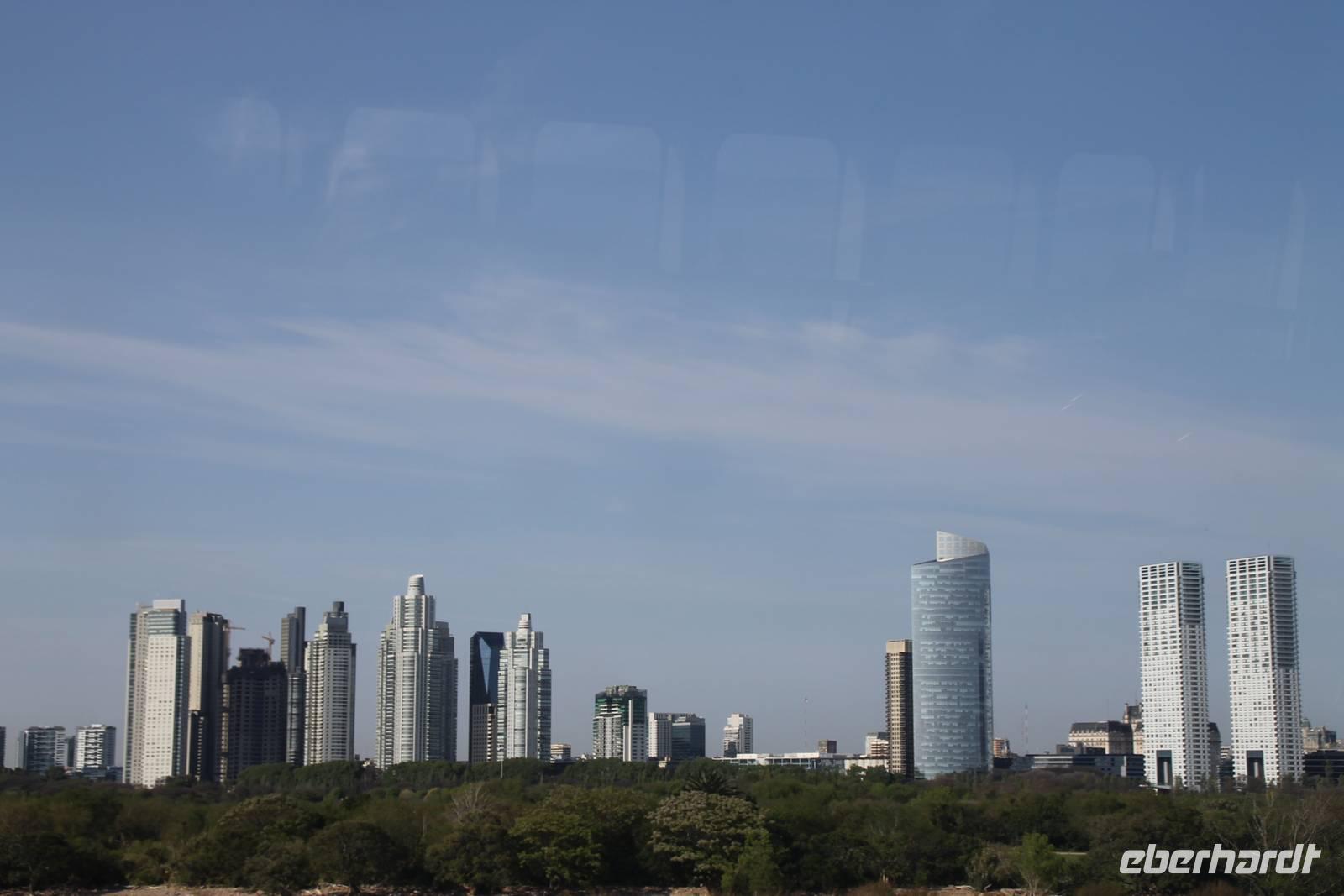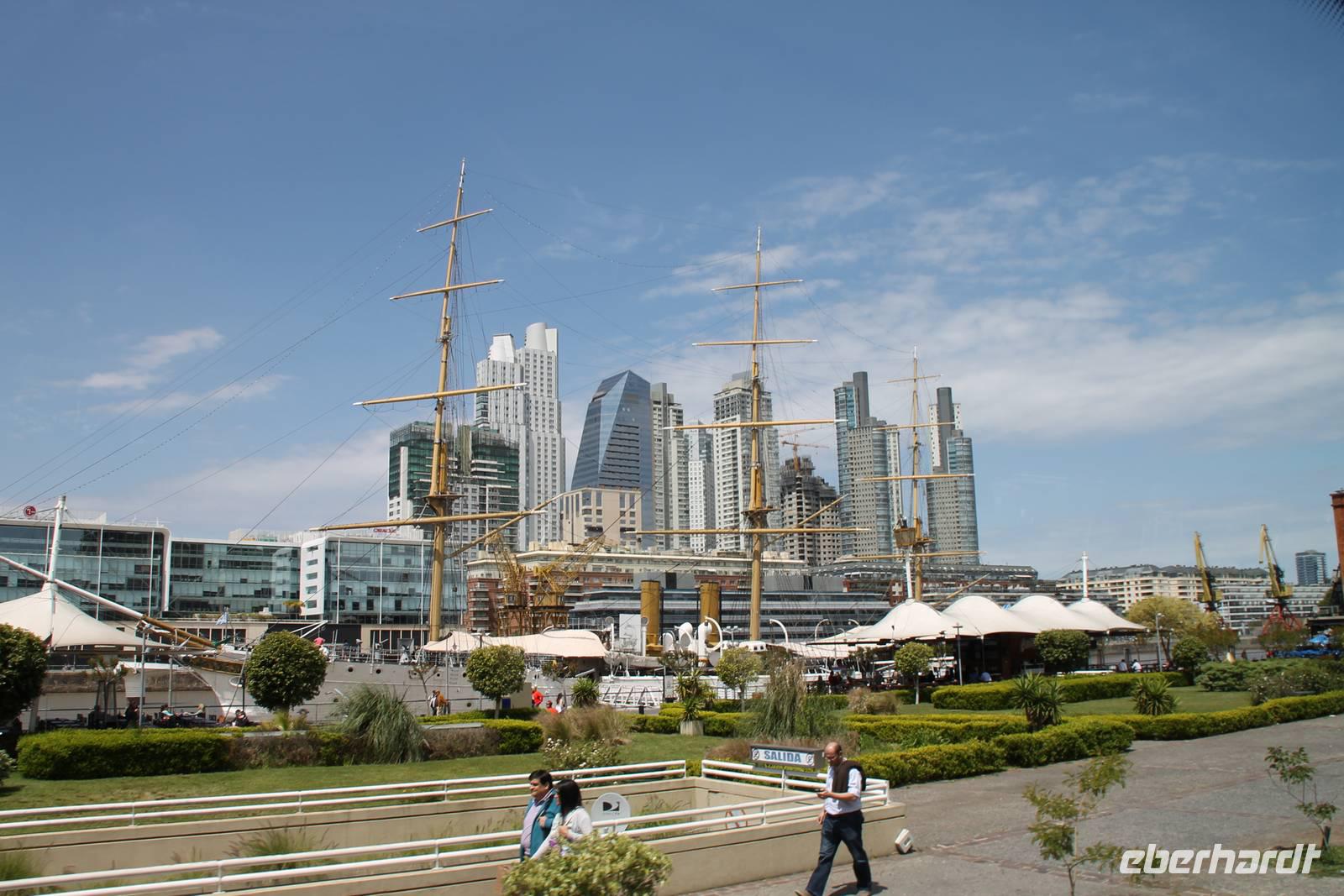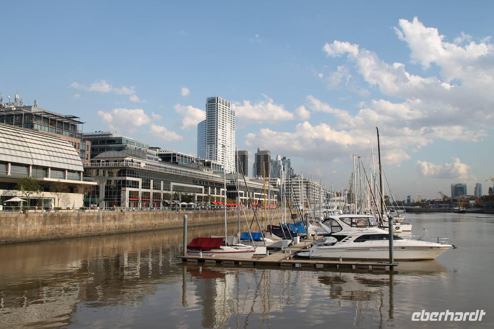 Sehr zeitig fuhren wir zum Flughafen von Santiago de Chile, um nach Buenos Aires zu fliegen. Dort wurden wir von unserer Reiseleitung Eliana abgeholt und zu unserem Hotel gefahren. Am Nachmittag trafen wir uns für einen ersten gemütlichen Stadtspaziergang in der Hotellobby. Gemeinsam gingen wir erst einmal Geld tauschen. Unsere örtliche Reiseleiterin hat uns ein Geschäft empfohlen, wo wir zu einem überdurchschnittlich guten Kurs tauschen konnten. Von dort aus gingen wir in Richtung Hafen. Moderne Wolkenkratzer und schicke Yachten bestimmen dort das Stadtbild. Direkt am Yachthafen ließen wir uns in einer Bar nieder und genossen die letzten Sonnenstrahlen des Tages.