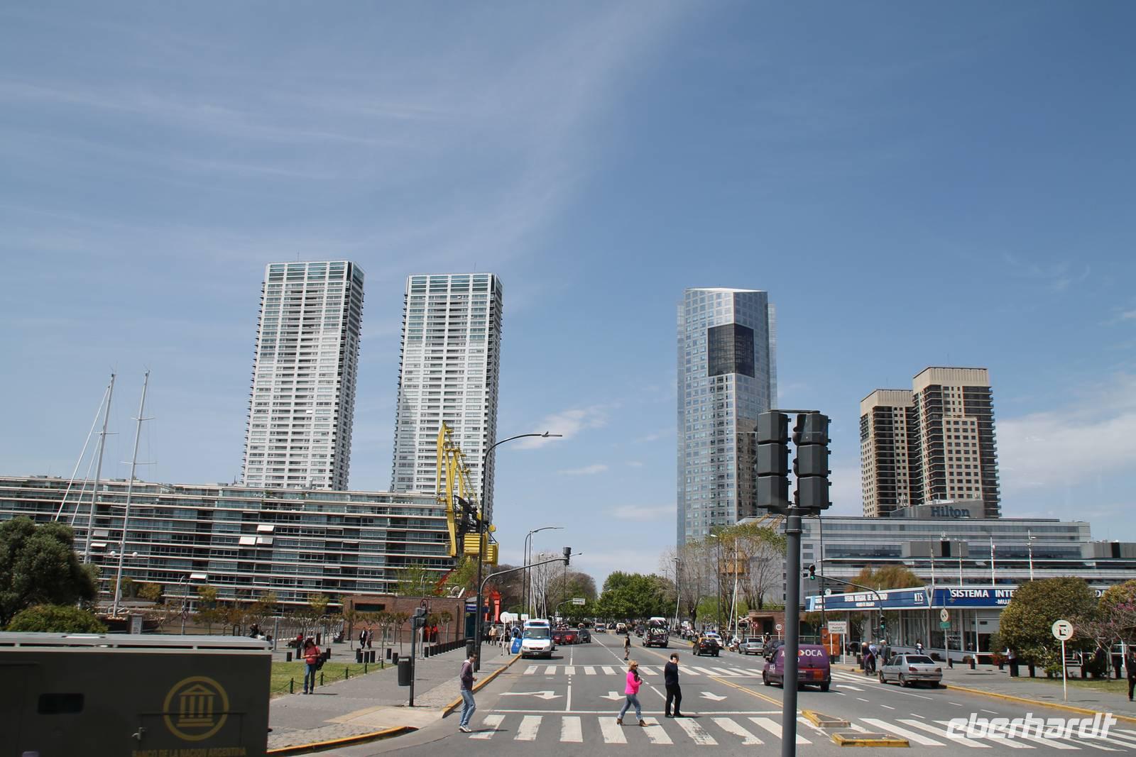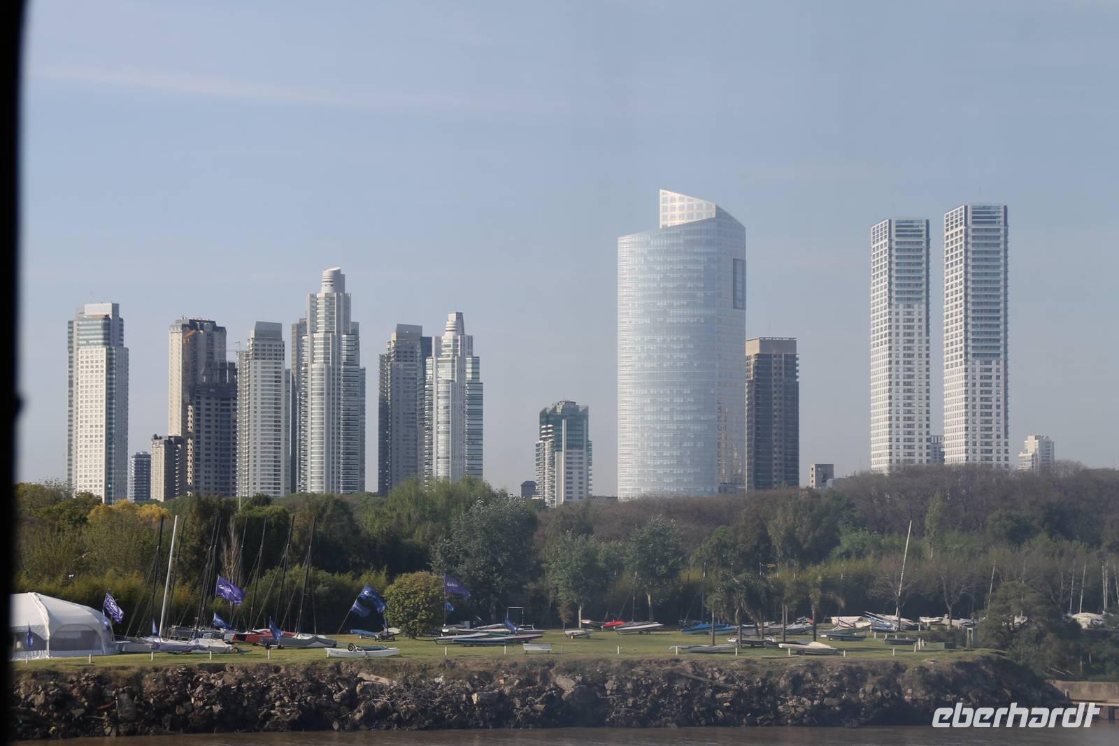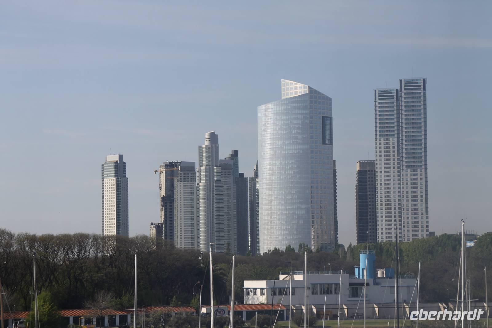 Sehr zeitig fuhren wir zum Flughafen von Santiago de Chile, um nach Buenos Aires zu fliegen. Dort wurden wir von unserer Reiseleitung Eliana abgeholt und zu unserem Hotel gefahren. Am Nachmittag trafen wir uns für einen ersten gemütlichen Stadtspaziergang in der Hotellobby. Gemeinsam gingen wir erst einmal Geld tauschen. Unsere örtliche Reiseleiterin hat uns ein Geschäft empfohlen, wo wir zu einem überdurchschnittlich guten Kurs tauschen konnten. Von dort aus gingen wir in Richtung Hafen. Moderne Wolkenkratzer und schicke Yachten bestimmen dort das Stadtbild. Direkt am Yachthafen ließen wir uns in einer Bar nieder und genossen die letzten Sonnenstrahlen des Tages.
