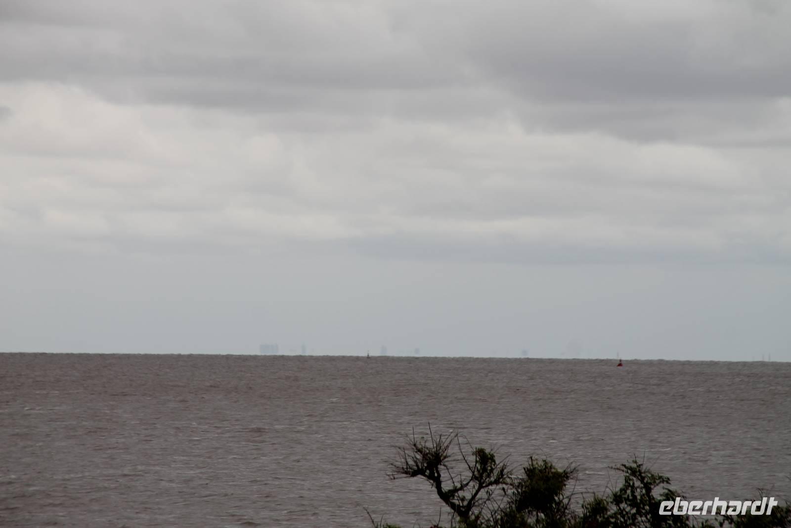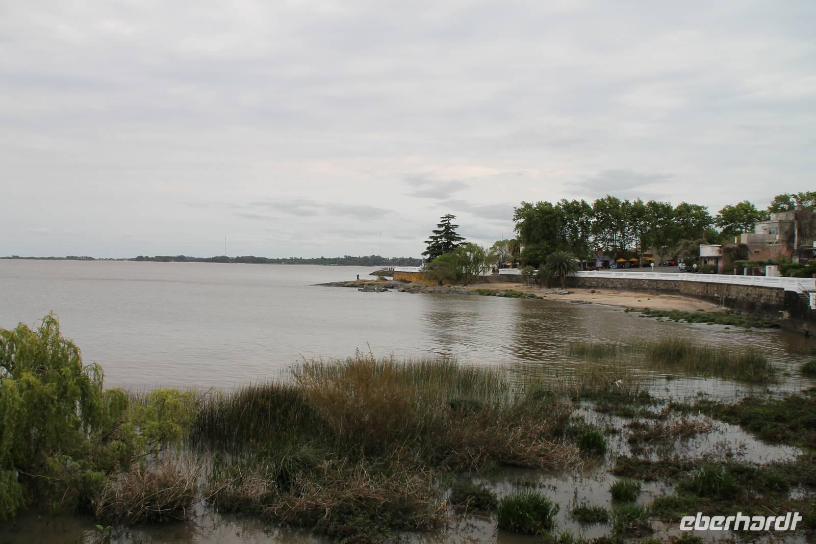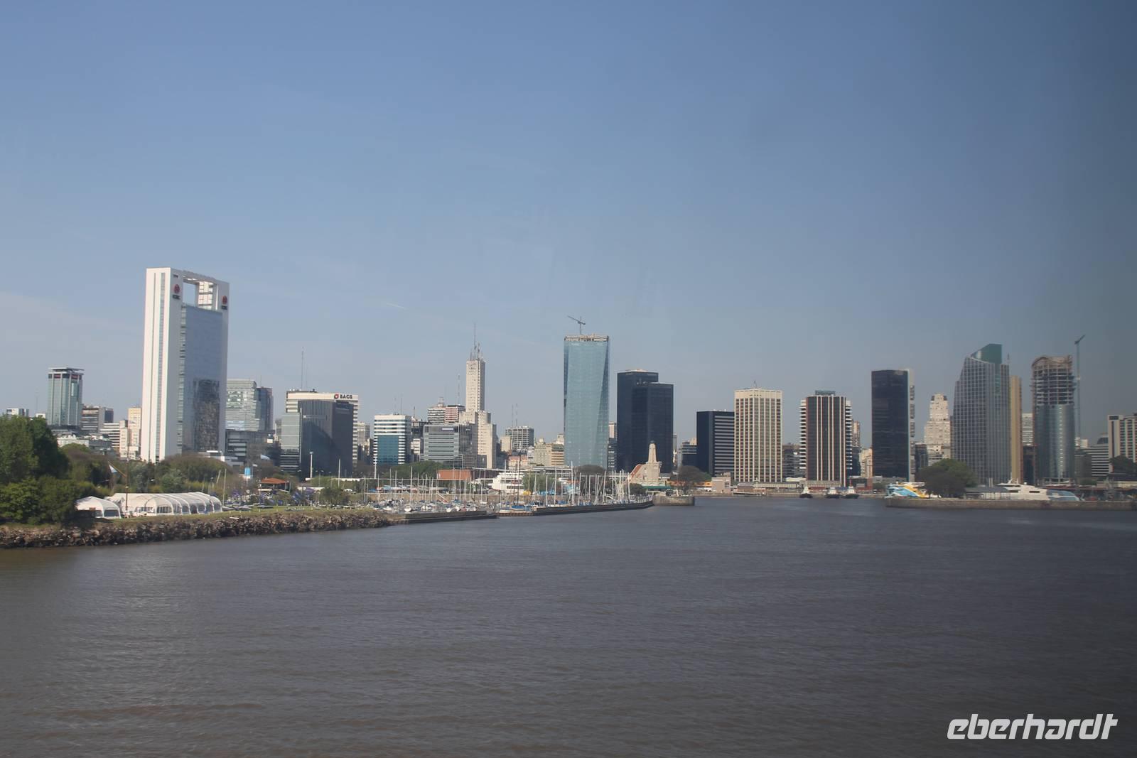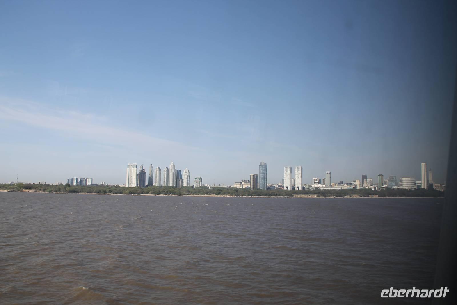 Nach dem vorgezogenen Frühstück fuhren wir mit dem Bus zum Hafenterminal. Vor dem Betreten des Schiffes wurde unser Handgepäck kontrolliert und es gab eine Passkontrolle mit Foto und Fingerabdruck. Erst danach konnten wir an Bord. Wir überquerten den unglaublich breiten Fluss „Rio de la Plata". Die genaue Bezeichnung des Schiffes ist „High-Speed-Craft"-Katamaran, es fuhr mit 52 Knoten, was 94 km/h entsprach.