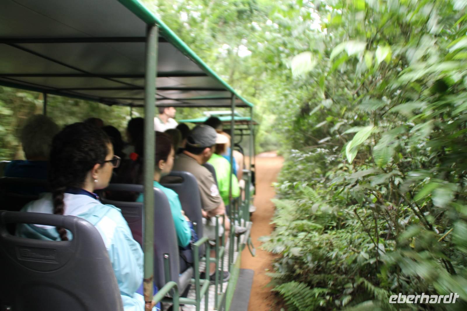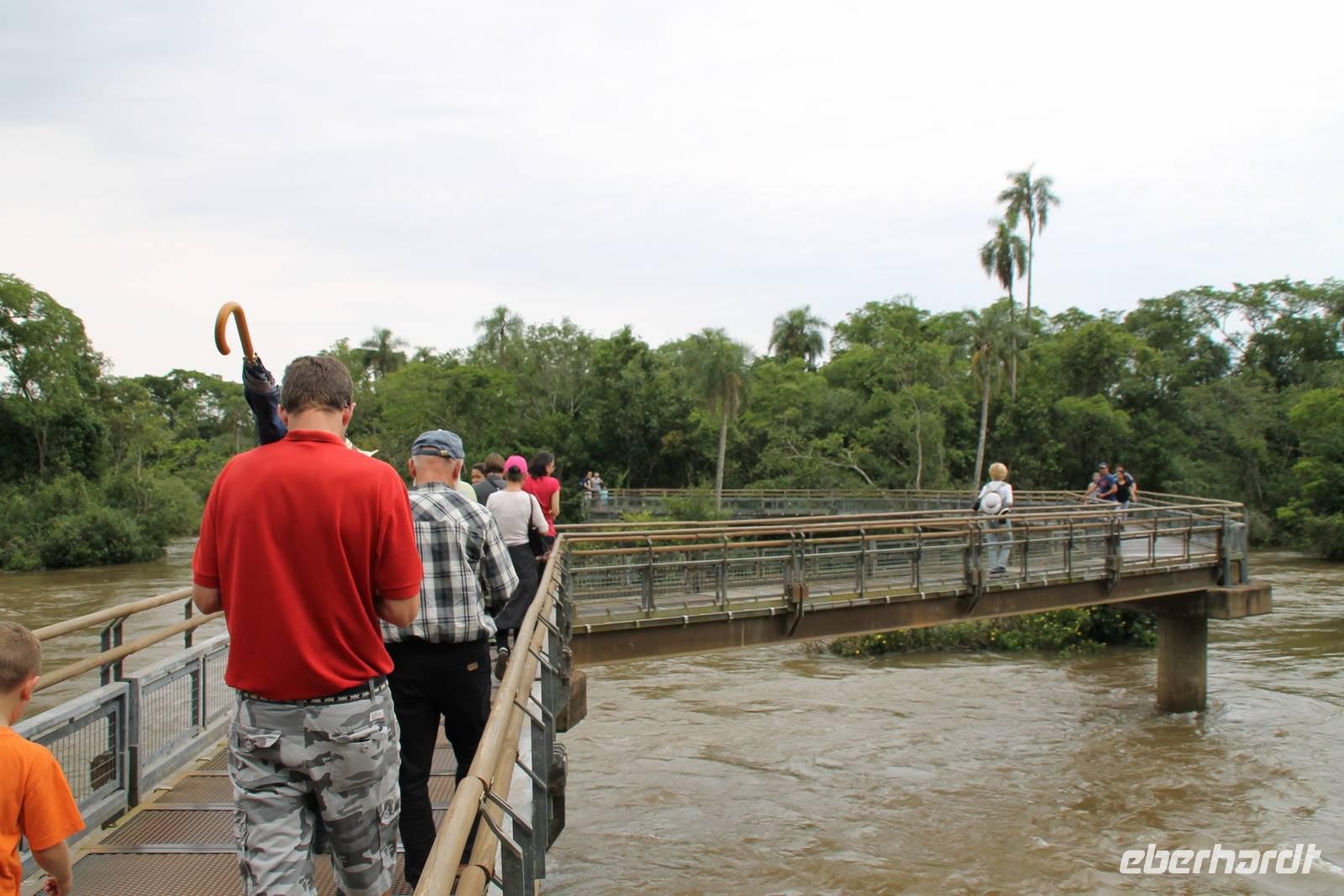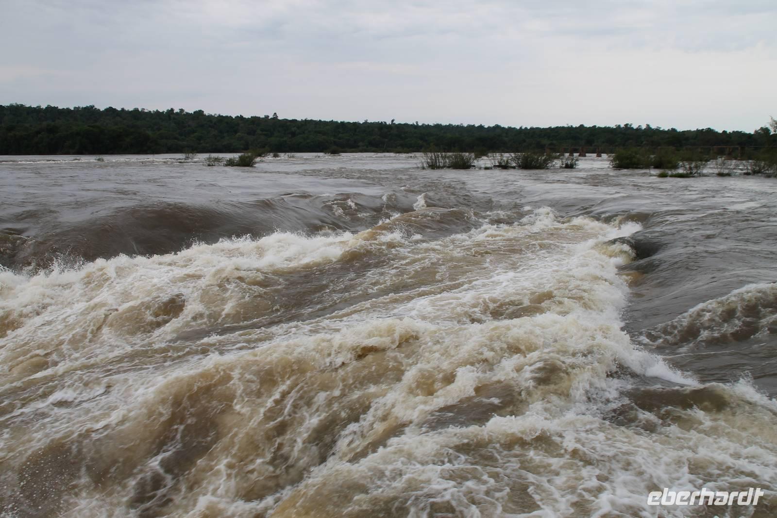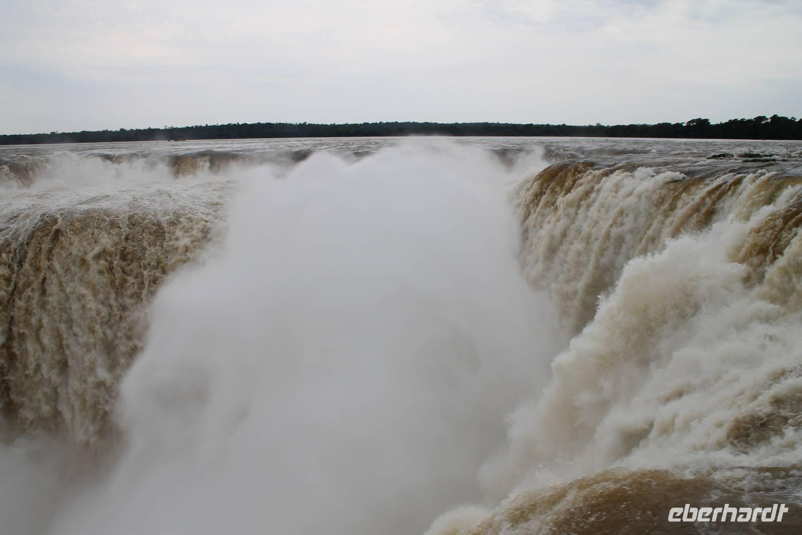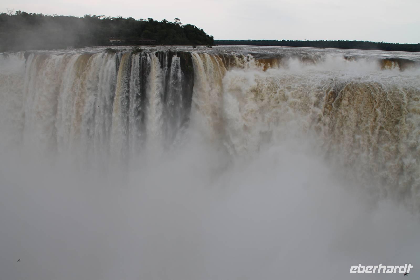 Gemeinsam starteten wir mit unserem Reisebus zum Grenzübergang von Argentinien und Brasilien. Nach den üblichen (jedoch unkomplizierten) Grenzformalitäten, fuhren wir zum brasilianischen Iguazu-Nationalpark, bis dicht an die Wasserfälle heran. Der Weg, oberhalb des Iguazu-Flusses, bot uns immer wieder eine herrliche Sicht auf die argentinischen Wasserfälle. Ausschließlich nur von brasilianischer Seite aus zu sehen, sind die Wasserfälle der „drei Musketiere", da sie sich auf einer Insel im Iguazu-Fluss, Argentinien abgewandt befinden. Wer wollte konnte mit mir eine Bootstour bis an die Wasserfälle unternehmen. Man fährt dabei genau unter die Wassermaßen und wird komplett nass. Ein echtes Erlebnis für Abenteurer!