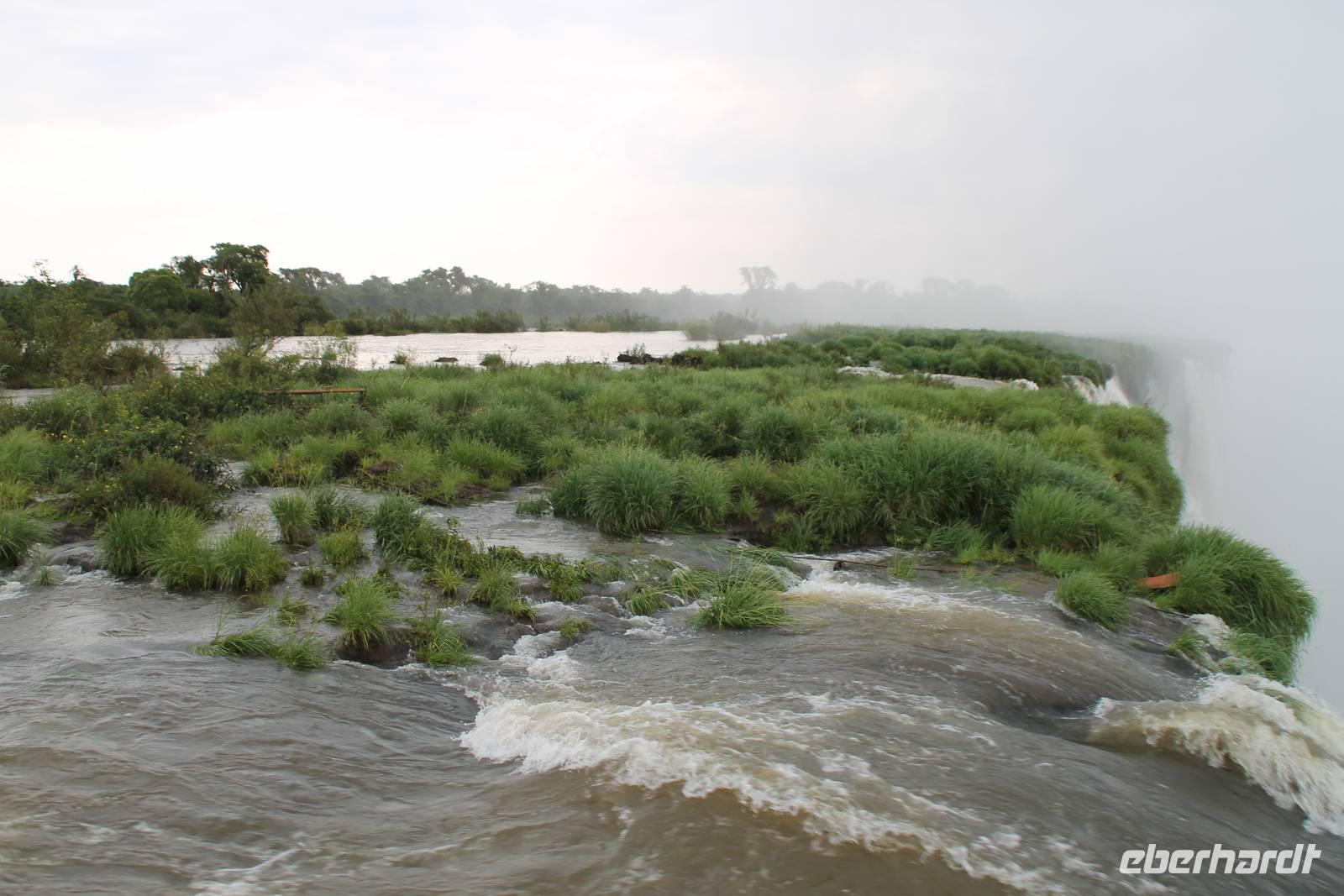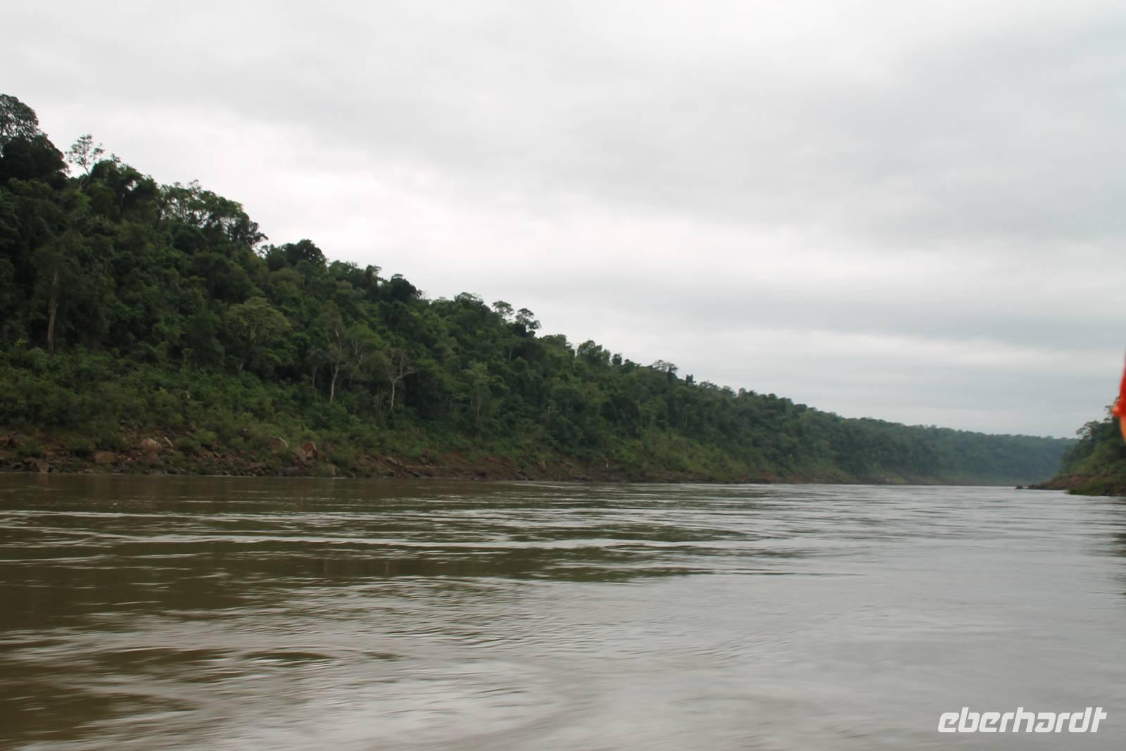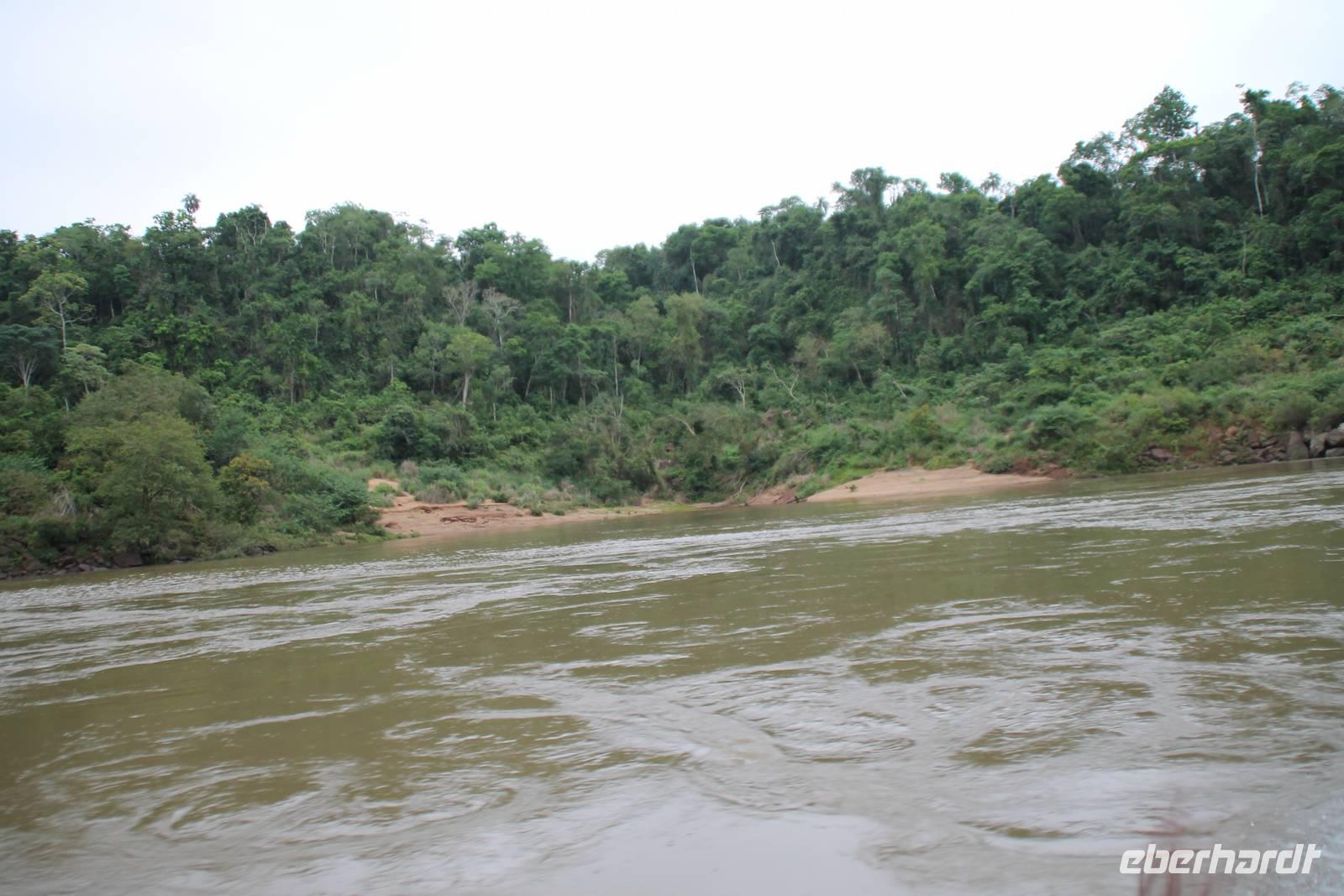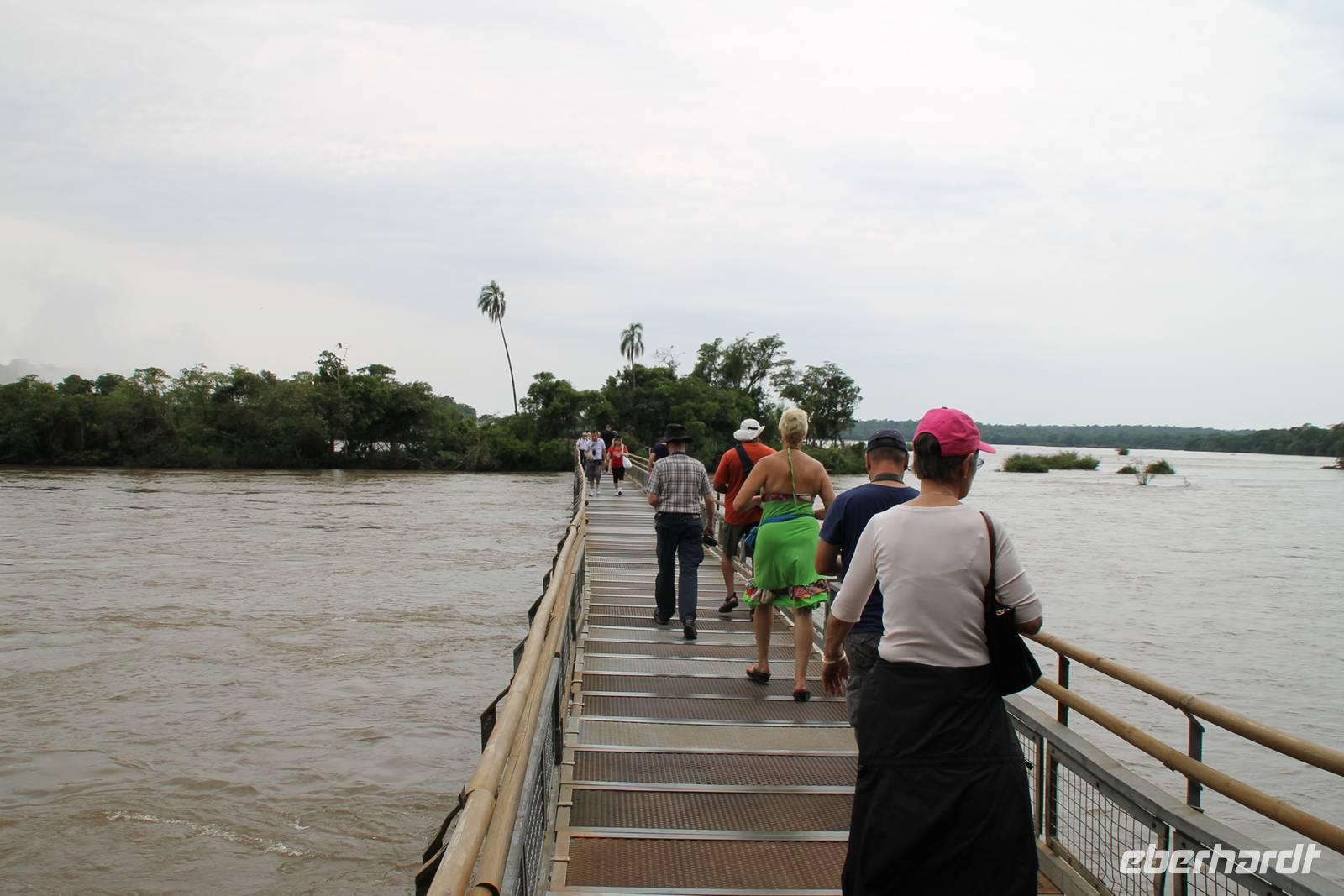 Gemeinsam starteten wir mit unserem Reisebus zum Grenzübergang von Argentinien und Brasilien. Nach den üblichen (jedoch unkomplizierten) Grenzformalitäten, fuhren wir zum brasilianischen Iguazu-Nationalpark, bis dicht an die Wasserfälle heran. Der Weg, oberhalb des Iguazu-Flusses, bot uns immer wieder eine herrliche Sicht auf die argentinischen Wasserfälle. Ausschließlich nur von brasilianischer Seite aus zu sehen, sind die Wasserfälle der „drei Musketiere", da sie sich auf einer Insel im Iguazu-Fluss, Argentinien abgewandt befinden. Wer wollte konnte mit mir eine Bootstour bis an die Wasserfälle unternehmen. Man fährt dabei genau unter die Wassermaßen und wird komplett nass. Ein echtes Erlebnis für Abenteurer!