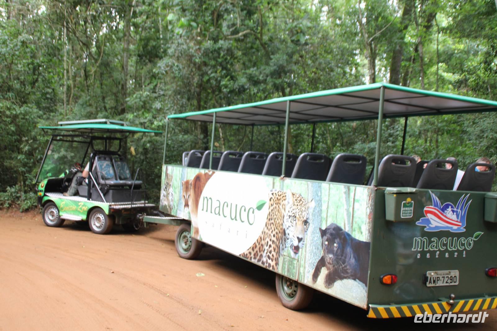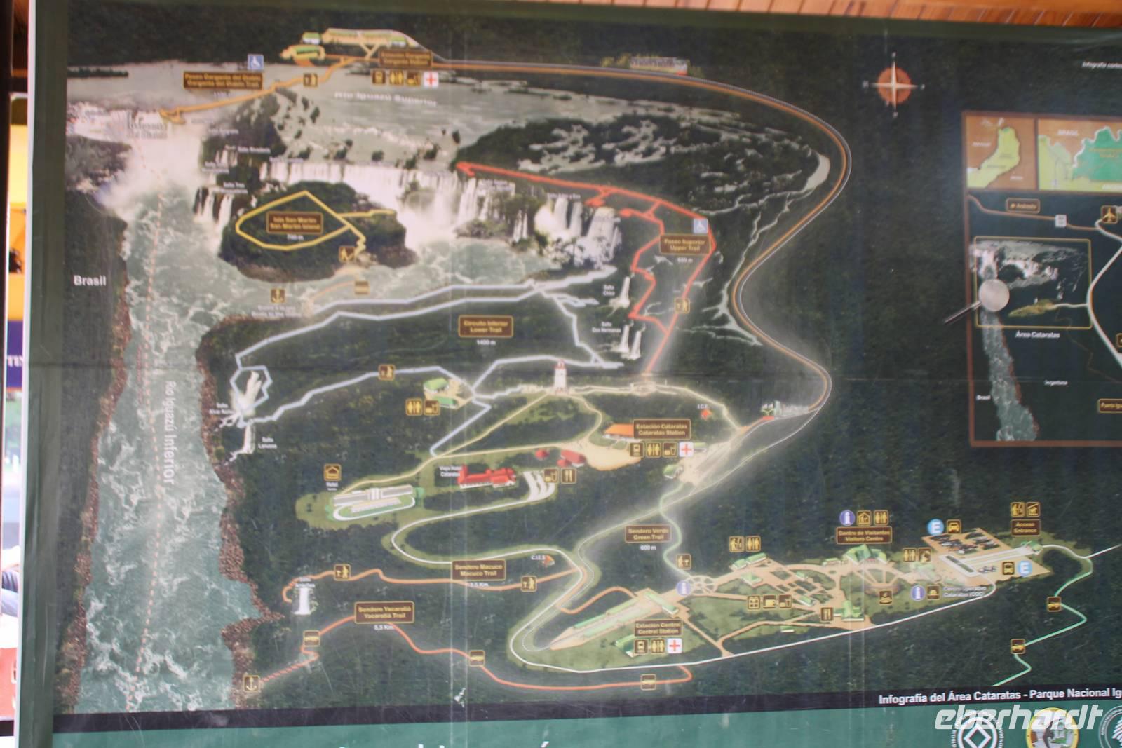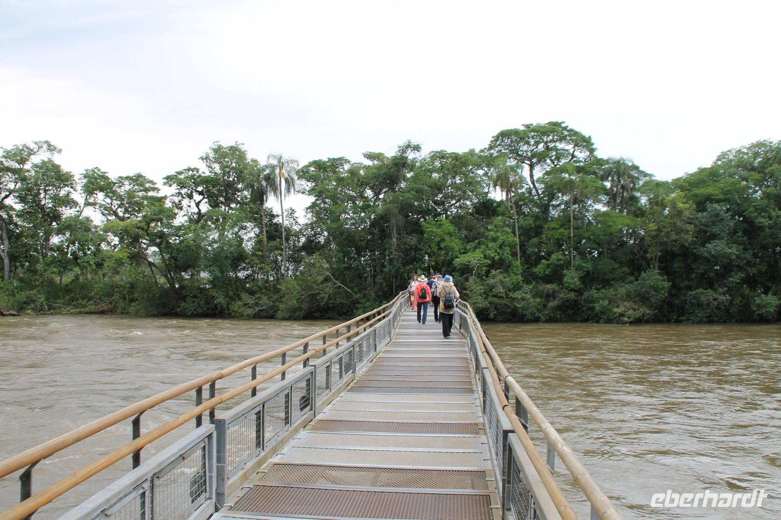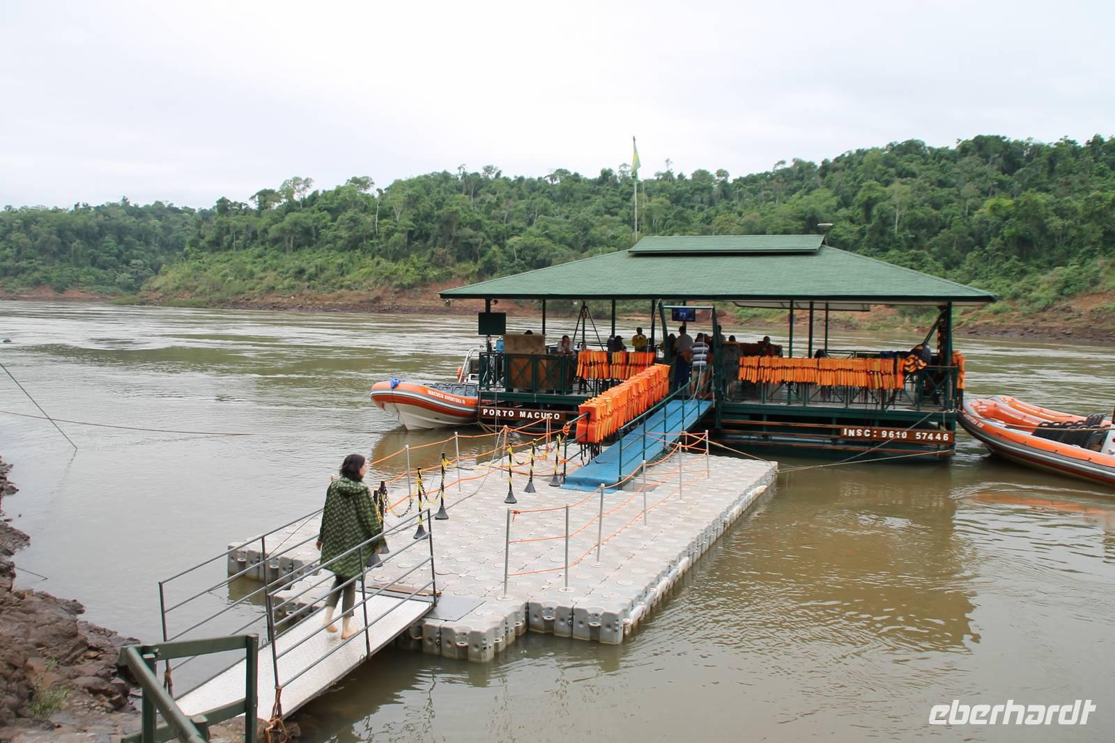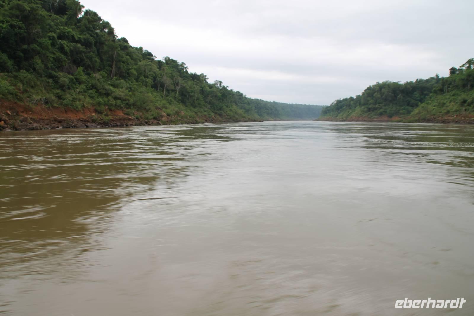 Gemeinsam starteten wir mit unserem Reisebus zum Grenzübergang von Argentinien und Brasilien. Nach den üblichen (jedoch unkomplizierten) Grenzformalitäten, fuhren wir zum brasilianischen Iguazu-Nationalpark, bis dicht an die Wasserfälle heran. Der Weg, oberhalb des Iguazu-Flusses, bot uns immer wieder eine herrliche Sicht auf die argentinischen Wasserfälle. Ausschließlich nur von brasilianischer Seite aus zu sehen, sind die Wasserfälle der „drei Musketiere", da sie sich auf einer Insel im Iguazu-Fluss, Argentinien abgewandt befinden. Wer wollte konnte mit mir eine Bootstour bis an die Wasserfälle unternehmen. Man fährt dabei genau unter die Wassermaßen und wird komplett nass. Ein echtes Erlebnis für Abenteurer!