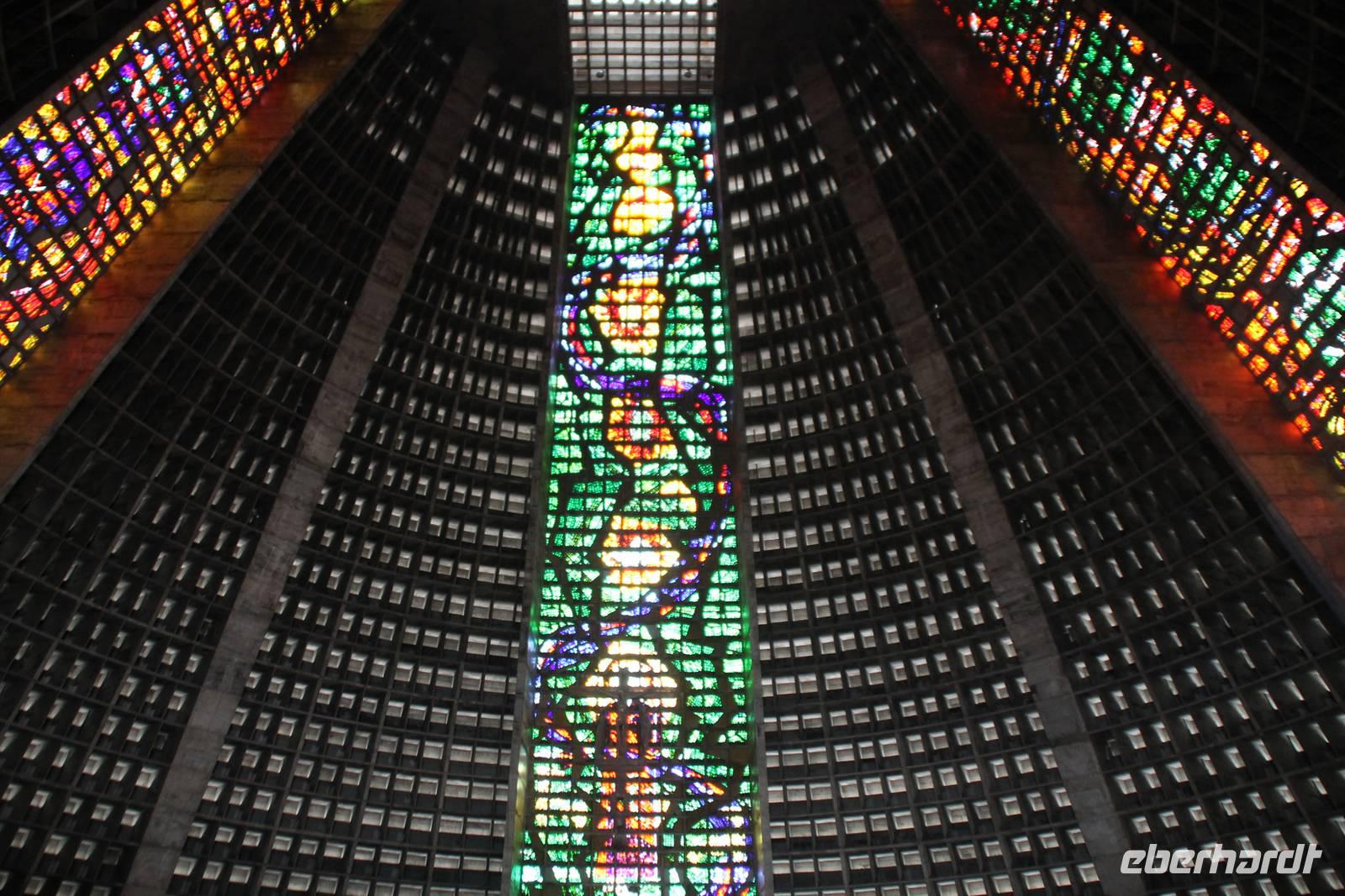 An unserem ersten Ausflugstag in Rio fuhren wir hinauf zum Zuckerhut. Leider nebelten sich die Hügel und Berge in Rio nach und nach immer mehr ein, somit waren wir mit der Aussicht etwas enttäuscht. Als nächstes fuhren wir mit unserem Reisebus und unserem örtlichen Guide in Richtung Altstadt und zum Sambodrom, einer Tribünenstrecke, welche ausschließlich für den Karneval in Rio errichtet wurde. In einem Souvenir- und Andenken-Laden konnten wir uns Kostüme ausleihen und uns fotografieren lassen. Unsere anschließende Mittagspause verbrachten wir im Restaurant „Confeteria Colombo". Es war zwar ziemlich laut, dafür gab es wieder einmal ein reichhaltiges und leckeres Buffet. Gut gestärkt spazierten wir in die Innenstadt zur Kathedrale „Sao Sebastian". Dieses trapezförmige Kirchengebäude wurde zwischen 1964-1976 erbaut, ist ca. 96 m hoch und besitzt in der Außenwand vier gewaltige, über die gesamte Höhe reichende Mosaikfenster, die das innere der Kathedrale mit farbigem Licht ausfüllen. Der Nachmittag stand zur freien Verfügung, wer wollte konnte Baden gehen oder entlang der Copacabana spazieren. Abends aßen wir in einem netten Restaurant direkt an der Copa, ca. 10min. zu Fuß von unserem Hotel.