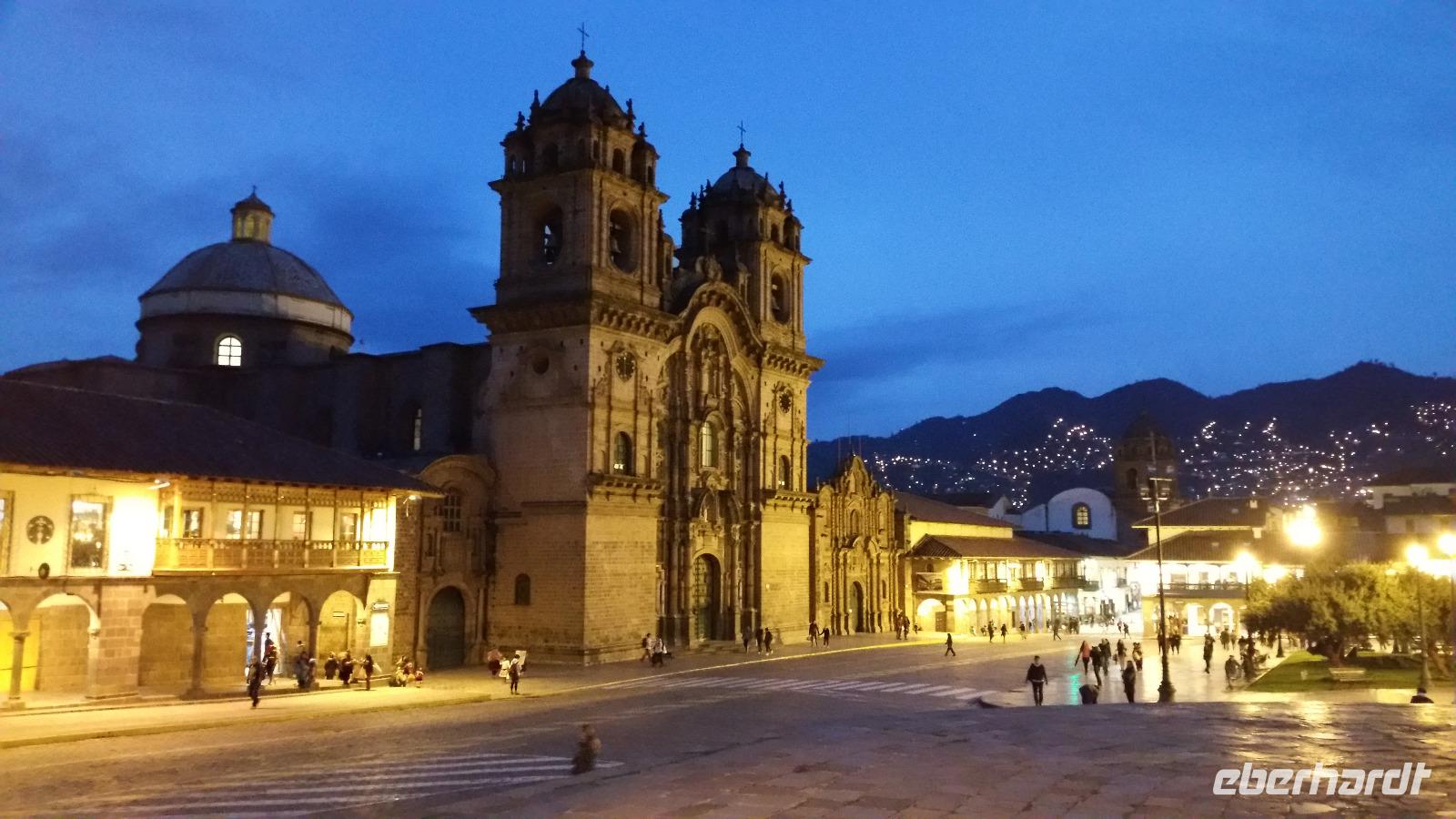 Spät am Abend erreichten wir wieder Cuzco und das Novotel Hotel und genaßen ein Abendessen in Casa Qorikancha und hier gab es eine Suppe als Vorspeise, die uns alle so wie die Rindfleisch Hauptspeiße geschmeckt hat. Die Mosoq Pacha Gruppe hat mit peruanische Musik unser Abend amusiert und Benjamin hat gemeinsam mit Ihnen „Cielito Lindo" gesungen. Wir hatten Spaß aber wir wollten nur ins Bett uns hinlegen da morgen geht es früh los nach Puno. Ich machte noch heute kurz mit Günter einen kurzen Spaziergang durch Cuzco und in die Nacht alles beleuchtet war herrlich.