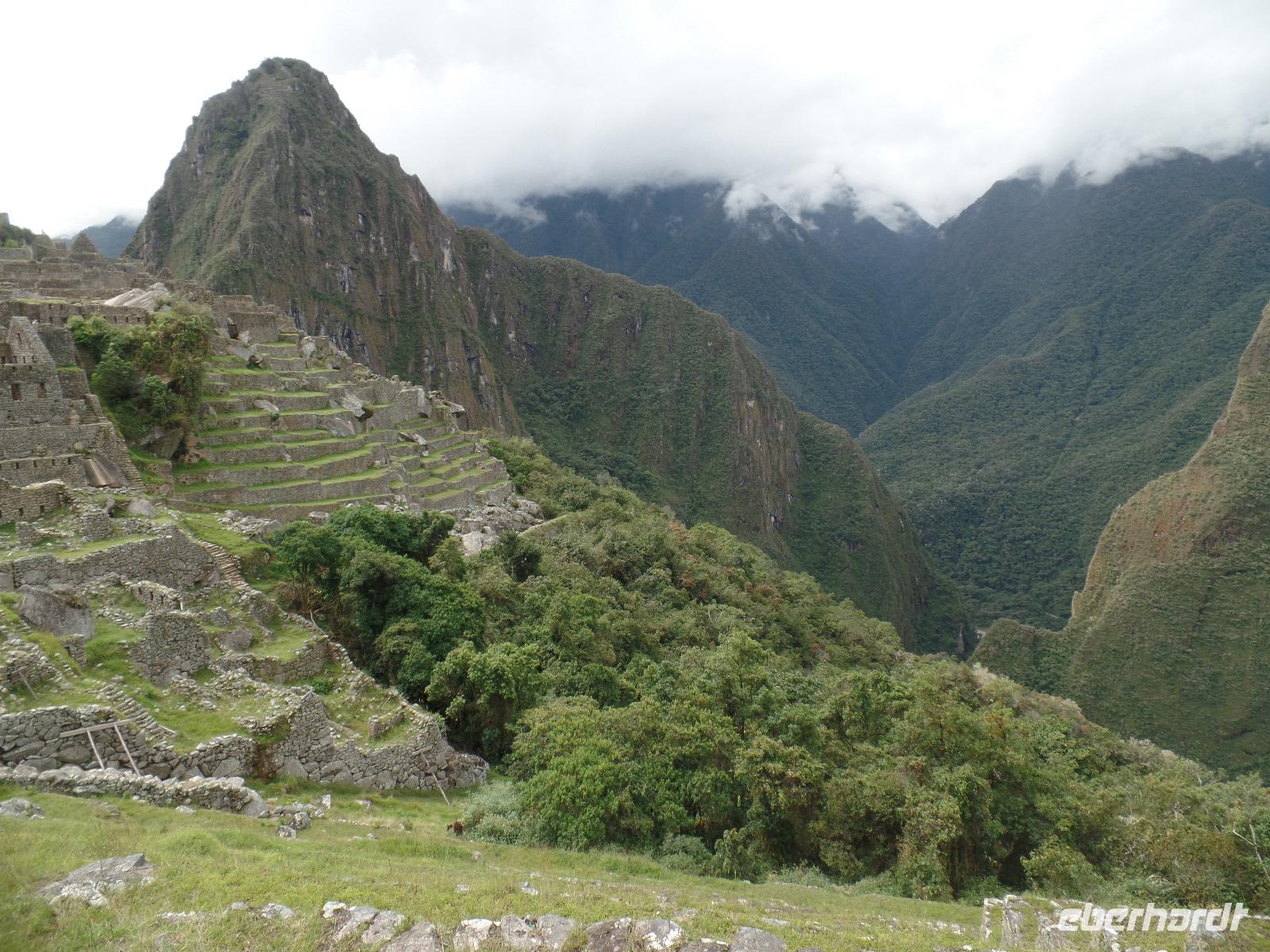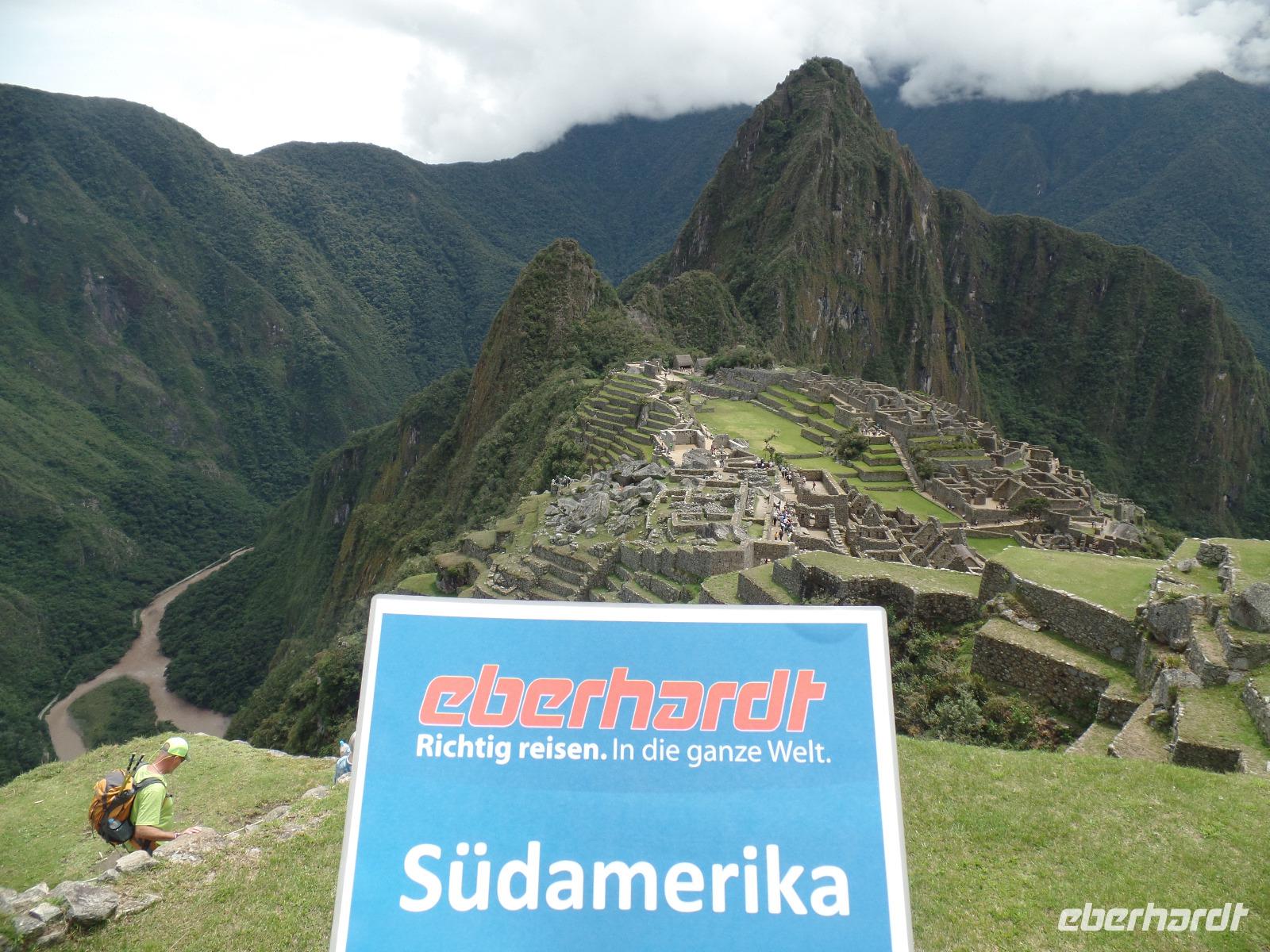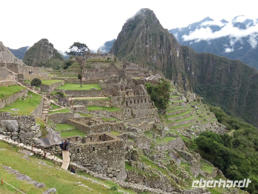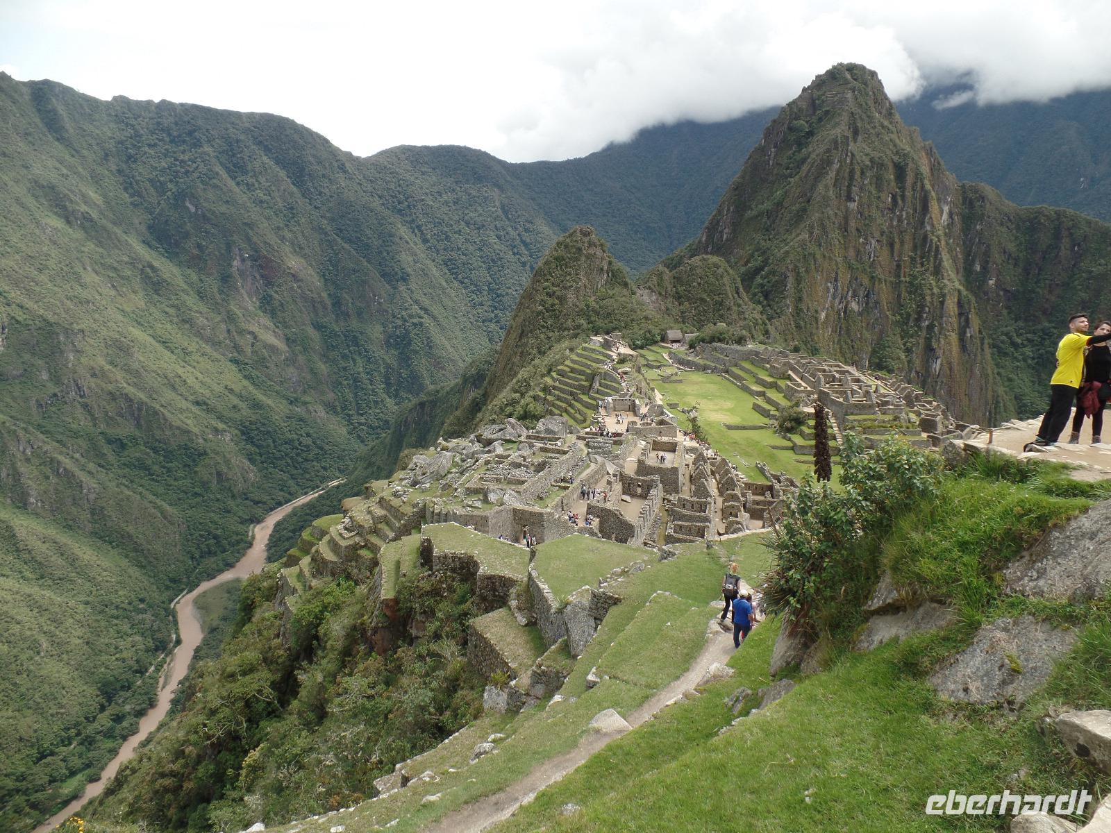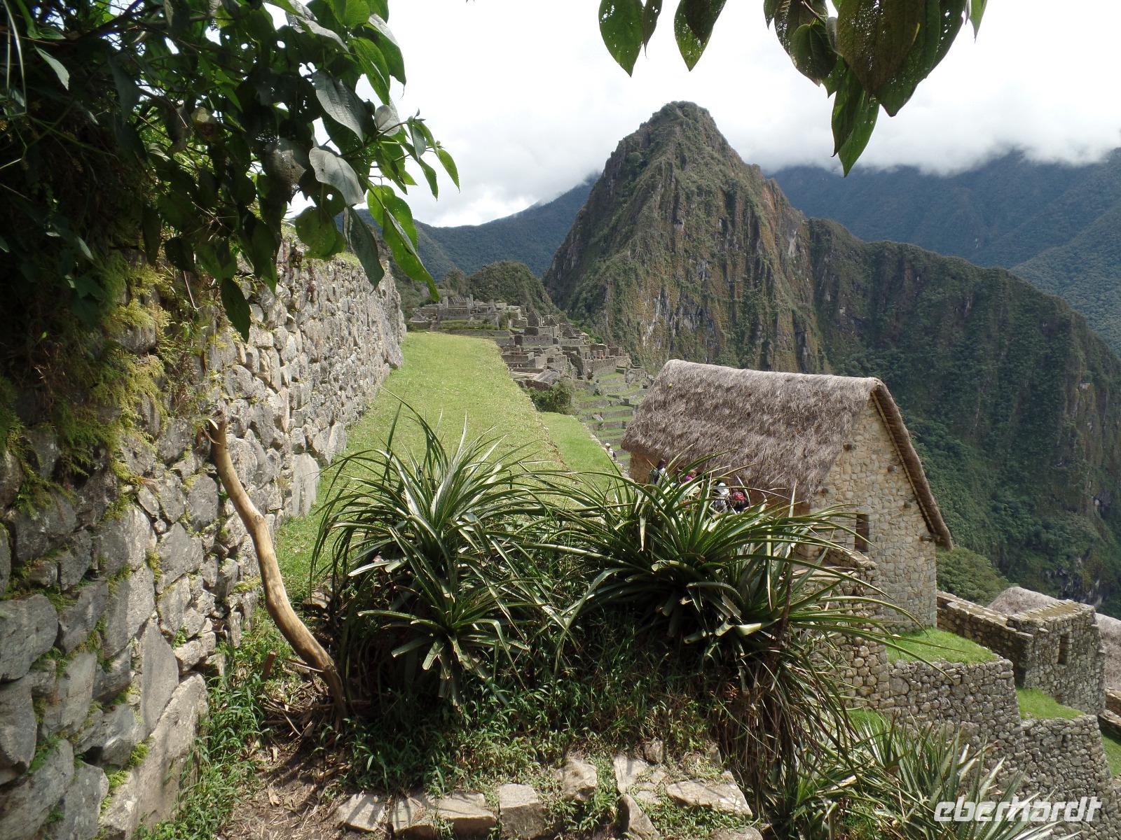 Wir könnten noch nicht die Zimmer beziehen aber wir lassen unsere kleine Rücksack und machten uns frisch. Nun war es so weit und wir fuhren von Hotel El Mapi aus mit dem öffentlichen Bus hinauf zur verlorenen Inkastadt Machu Picchu, wo gemeinsam mit unserem Reiseleiter Jorge eine geführte Tour durch die gesamte Anlage erwartet. Eingebettet zwischen dicht bewachsenen Bergen war die Stadt für die spanischen Eroberer im Jahre 1532 unsichtbar und ist dadurch der Zerstörung entgangen. Erst 1911 stiess der deutsche Forscher Hiram Bingham auf die verwitterten Mauern der mächtigen Anlagen.