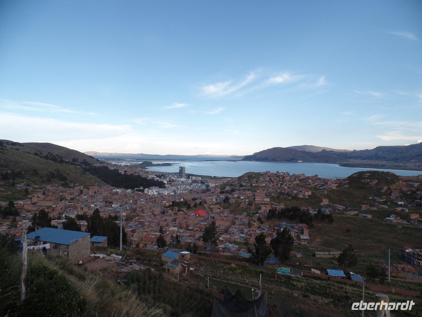 Wecker klingelte heute um 5.30 Uhr. Wir haben gut geschlafen, öffnen die Augen und plöztlich vor uns... der Titicaca See! Ja. Wir sind hier. Noch ein 2. Traum geht in Erfüllung. Nicht nur Machu Picchu sondern der Titicaca see über 3.800 Meter hoch! Wir begrüßen Benito, unser lustiger Reiseleiter bis zur Grenze. Benjamin füllte das Anreise Formular für Bolivien aus. Nach dem Frühstück direkt am See mit herrlichen Blick fuhren wir entlang des Südufers des Titicacasees. Wir fahren von Puno mit dem Reisebus ca. 2 Stunden nach "Copacabana", aber zuvor werde wir die Grenze nach Bolivien überqueren. Und zwar...zu Fuß ;) Wir wechselten hier noch die übrigen „Soles" von Peru auf die neue Währung: die „Pesos Bolivianos". Auf der andere Seite steht schon Roger, unser örtliche Reiseleiter in Bolivien, der uns alle einen sehr guten Eindruck machte und gemeinsam mit ihm 3 Tage sein werden.