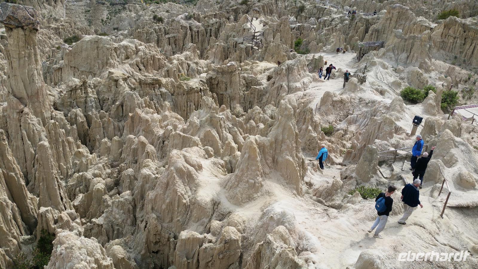 Um 14.15 Uhr fangen wir an mit dem zweiten Teil unseres Stadtrundfahrt. Der Ausflug began mit dem Besuch des landschaftlich einzigartigen Mondtals. Ein hübscher kleiner Abstecher zu einer geologischen Skurrilität von Mutter Natur führt durch die schicken Vororte von La Paz in das Mondtal im Tal des La-Paz-Flusses. Wind und Regen haben in Jahrmillionen aus rötlichem und grauem Gestein einen geomorphologischen Alptraum geschliffen: eine trostlose Mondlandschaft, deren Besichtigung für jeden La Paz-Besucher ein „Muss" ist.