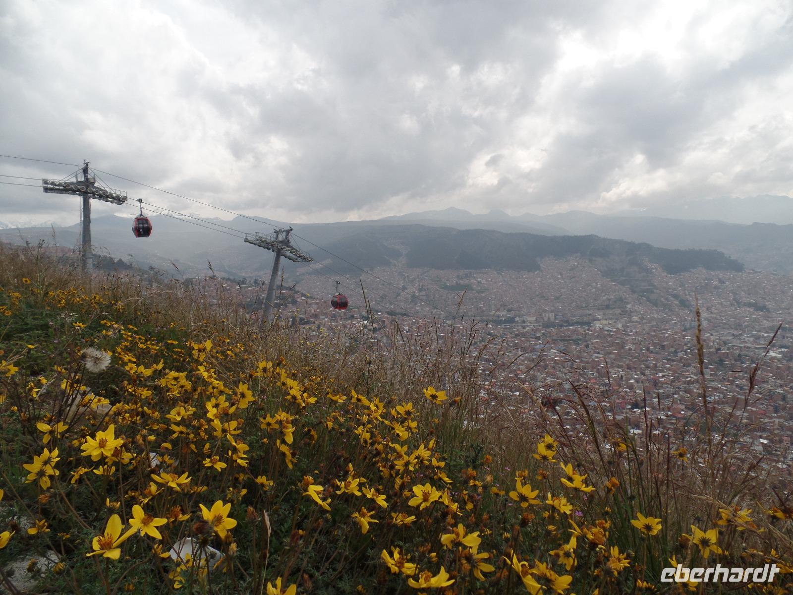 Wir fuhren über El Alto durch, eine riesige Megastadt, die sich um die Megastadt La Paz gegründet hat. Unser Reiseleiter Roger hat eine tolle Überraschung und er fragt uns alle ob wir ein Kinderspiel machen wollen und die Augen zumachen können und von 10 bis 0 zählen.... warum? Ok. Wir spielen mit: 10, 9, 8, 7, 6, 5, 4, 3, 2. 1 und ... wir offen die Augen und plötzlich eine schöne riesige Stadt zu unsere Füßen: La Paz! Wahnsinn! Wir hätten es nicht gedacht. So wie auf eine riesigen Loch oder Kessel und oben mit schöne Berge mit Schnee. Einige Gipfel hier sind auch über 6000 Meter Hoch.