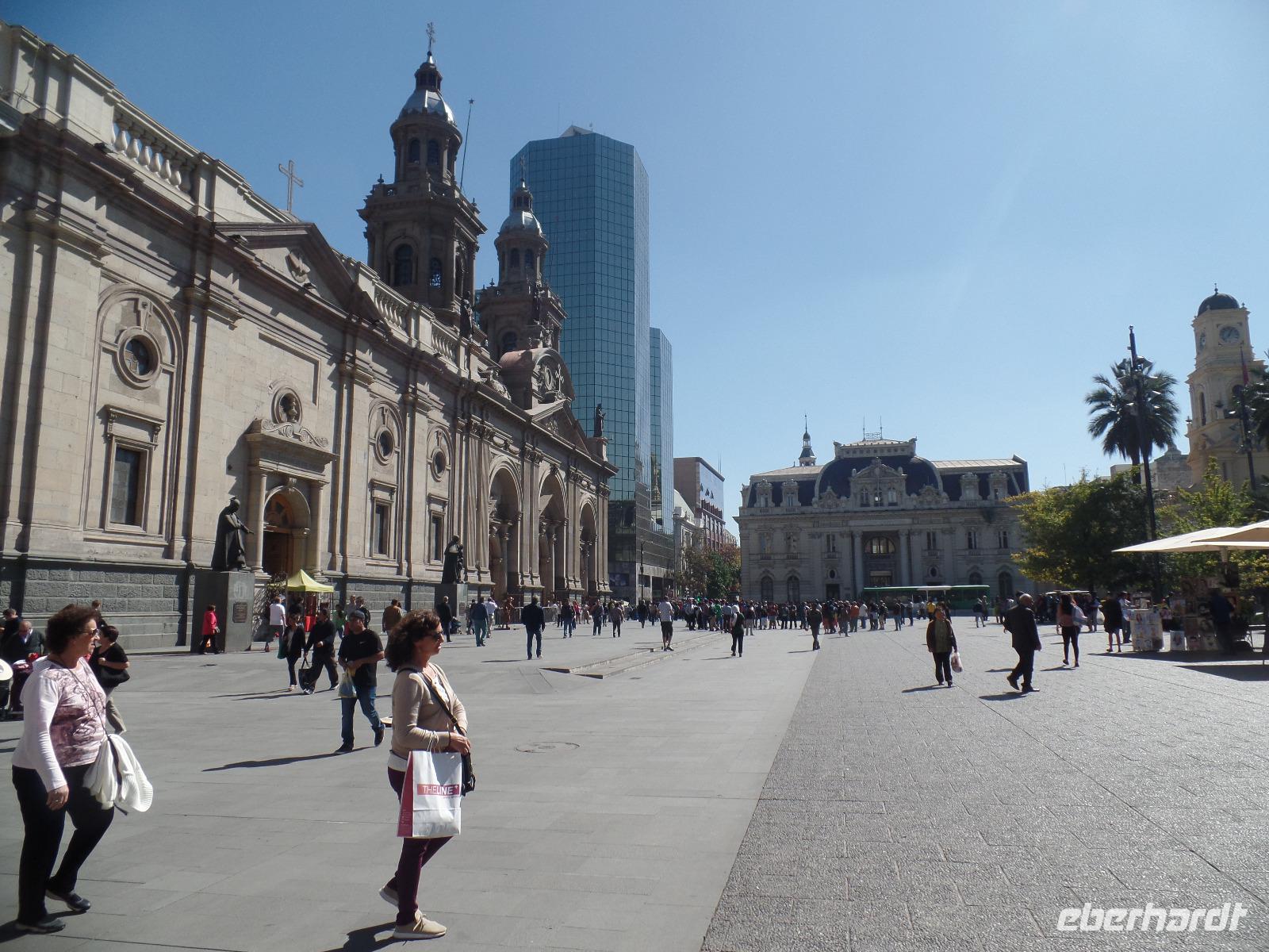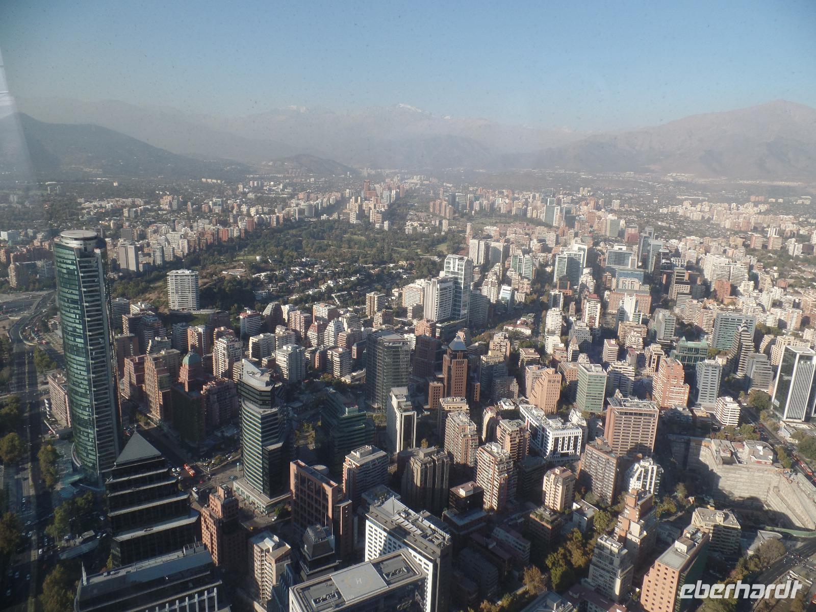 In dieser riesigen Hauptstadt, Santiago de Chile, die mehr als 6 Millionen Einwohner hat, machte Benjamin wieder eine Überraschung....und zwar wir fuhren hoch zu dem grössten Gebäude Südamerika, Gran Torre Costanera, mit 300 Meter hoch. Ein architektonisches und kommerzielles Wahrzeichen von Santiago. Unter all den Gebäuden ragt das höchste Gebäude Südamerikas, das Gran Torre Costanera mit 300 Metern Höhe, empor. Was uns besonders beeindruckt hat, ist der riesen Unterschied zwischen der Stadt, die nur 520 Meter über dem Meerspiegel liegt, im Vergleich zu den riesigen Hochkordillere, deren Berggipfel mit bis zu 5.000 Meter Höhe, sehr viel höher liegen. Wir hatten heute Glück dass man was doch sehen könnte. Tolle höhe Berge voll mit Schnee. Unvergesslich. An anderen Tagen im Hochsommer, merkt man ganz besonders die Umweltprobleme, die Santiago hat. Das größte ist dabei der Smog, der vor Allem durch den Verkehr und die Industrie verursacht wird.