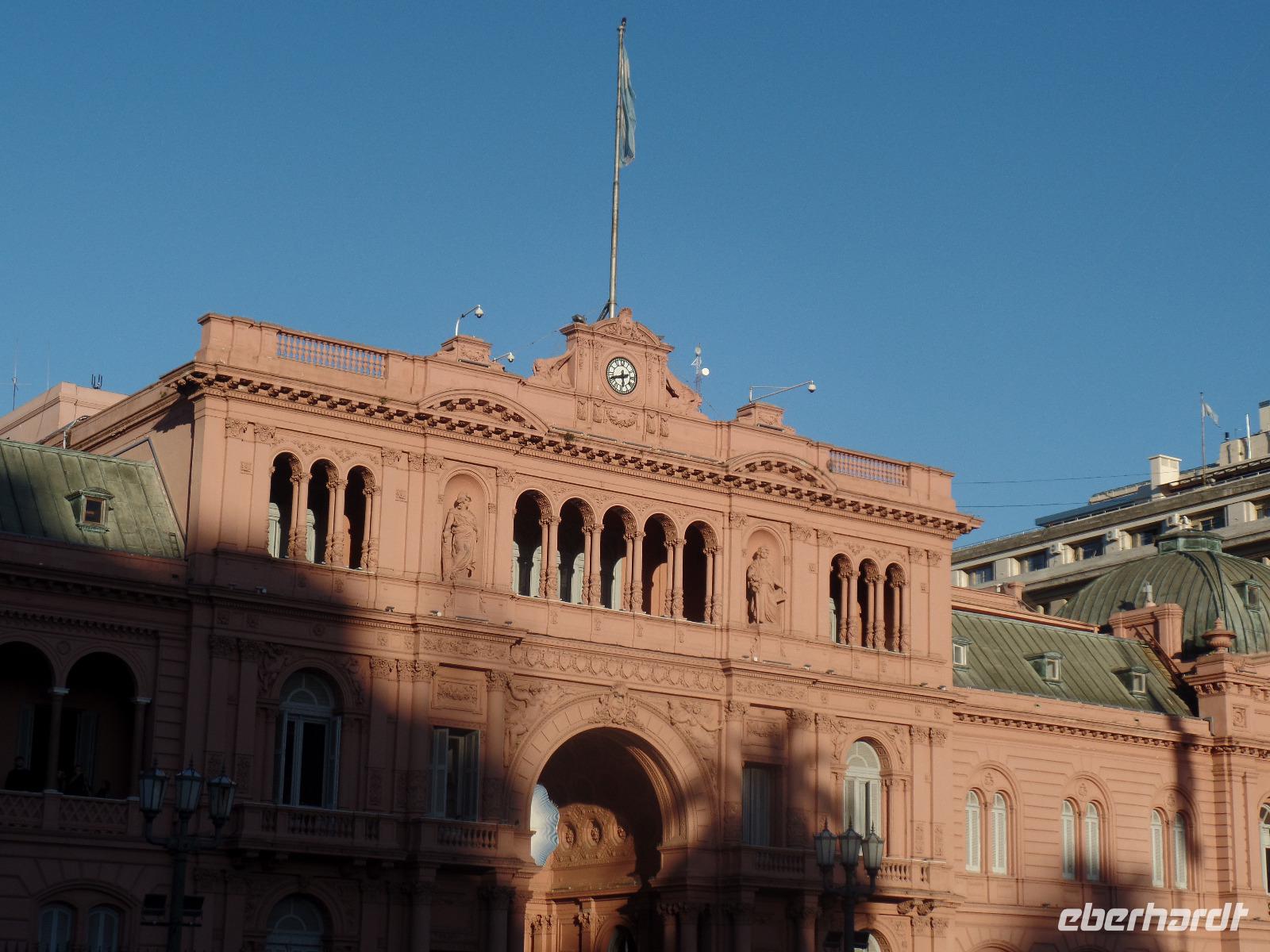 Weiter im Bus fuhren auch wir ins San Telmo Viertel, wo heute ein Antiquitäten-Markt und auch ein Flohmarkt stattfanden. San Telmo Viertel war bis 1888 ein Hafen, ist aber heute eine der modernsten und gefragtesten Wohngegenden von Buenos Aires. Schon im Zentrum besichtigen wir zunächst die Kathedrale, wo der heutigen Papst Franziskus als Priester die Messe gehalten hat. Es war schön zu sehen wie ein ganz normaler Mensch, der am heutigen Sonntag die Messe hält, auch zum Priester gewählt werden kann. Am selben Ort befindet sich auch das alte weiße Rathaus oder auch „Cabildo" genannt. Neben dem Plaza de Mayo ist das berühmte Casa Rosada, der Sitz der argentinischen Regierung. Am selben Ort besichtigen wir auch das Regierungsviertel mit der Plaza de Mayo, wo uns erzählt wurde, dass dort heute immer noch Proteste und friedliche Kundgebungen stattfinden. Einmal pro Woche protestierten die Mütter, deren Kinder zu Zeiten des sogennanten schmutzigen Krieges (Guerra Sucia) zunächst spurlos verschwunden waren, am „Las madres de la Plaza de Mayo". Dort auf, der einen Seites des Platzes befindet sich „La casa Rosada", ein rosafarbenes Haus, wo die Präsidentin täglich ihr Amt ausübt. Links davon war der Balkon zu sehen, wo Evita und später Madonna im Film über Evitas Leben zum Volk sprachen („Don´t cry for me Argentina..."). Unsere Stadtrundfahrt war damit zu Ende und wir fuhren ins Hotel um 18 Uhr wo wir Freizeit bis zum Abendessen um 20 Uhr hatten.