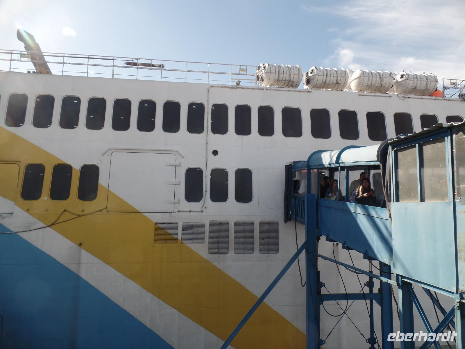 Wir müssten heute bisschen früh aufstehen. Um 6.30 Uhr klingelte der Wecker. Nach dem vorgezogenen Frühstück im Hoten NH Latino fuhren wir mit dem Bus und Ines zum Hafenterminal. Vor dem Betreten des Schiffes wurde heute unser Handgepäck kontrolliert und es gab auch hier eine Passkontrolle mit Foto und Fingerabdruck. Erst danach konnten wir an Bord einsteigen. Wir setzten uns am Morgen über den Rio de la Plata nach Uruguay über. Wir überquerten den unglaublich breiten Fluss „Rio de la Plata", die breiteste Fluß der Welt mit über 200 Km weiter vorne bei seiner Mundung in Punta del Este. Die genaue Bezeichnung des Schiffes ist „Silvia Ana"-Katamaran, es fuhr mit 52 Knoten, was 94 km/h entsprach.