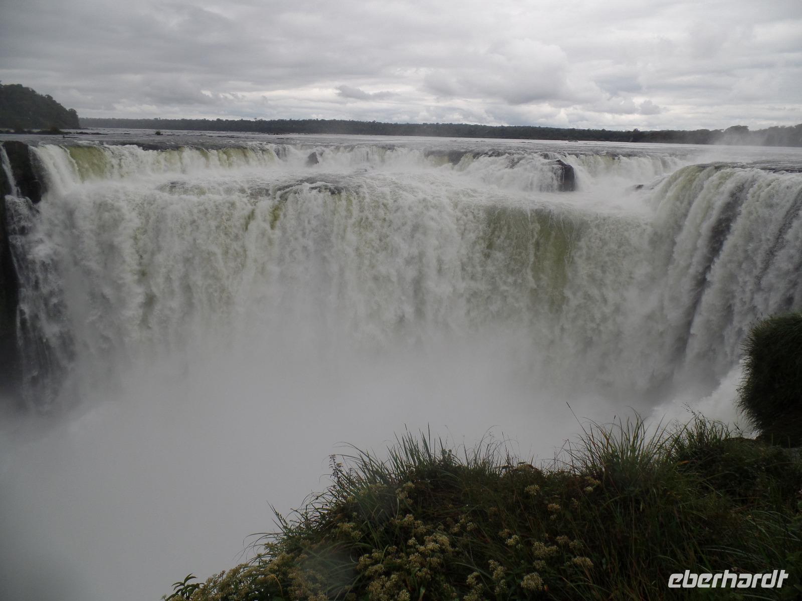 Nach dem Frühstück fuhren wir zum Flughafen, von wo wir nach Iguazú (in Argentinien) fliegen. Am Flughafen bedankten und verabschiedeten wir uns bei Ines und freuten uns schon auf der nächste Traum, der in Erfüllung gehen wird: Iguazú. Wir fliegen über die Rio de La Plata Fluss und das Wasser strahlt wie Silver als wir abflogen. Vor der Landung konnten schon einige von uns auf der rechten Seite die Wasserfälle und ihr Dampf in der Ferne sehen. Es war kein Feuer sondern Dampfwolken von den Wasserfälle. Wir landeten nach 13 Uhr am Dreiländereck Brasilien, Argentinien und Paraguay. Iguazú, am Dreiländereck zu Argentinien, Brasilien und Paraguay, ist vor allem für die atemberaubenden drei Kilometer breiten und 80 Meter hohen Wasserfälle bekannt. Hedio, unser örtlichen Reiseleiter war schon da und erklärte das es viel besser sei heute die argentinische Wasserfälle schon heute zu sehen und morgen wie geplant die brasilianische Seite. Da der letzte Bahn zur Teufel Schlucht kurz nach 16 Uhr fährt, fuhren wir voll Begeisteirung mit der Bahn direkt dorthin und in Ruhe um ganz entspannt zu genießen. Der Tag ist gekommen. Wir freuten uns alle auf die Wasserfälle heute. Die sind einmalig auf der Welt. Auf einer Breite von gut 2.700 Metern stürzt das Wasser inmitten einer einzigartigen Urwaldszenerie bis zu 80 Meter in die Tiefe. Wir hatten heute ausgiebig Zeit, dieses Naturschauspiel zu genießen - einmal von argentinischer heute und einmal von brasilianischer Seite morgen!