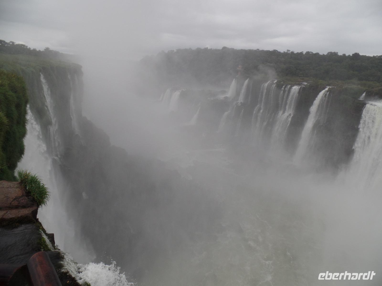 Wir weckten heute in Brasilien auf und nach dem Frühstück fuhren wir um 9 Uhr los um die brasilianische Seite der Wasserfälle zu erkunden. Von der Aussichtsplattform bekamen wir einen ersten tollen Überblick über die enormen Ausmaße der Wasserfälle. Wir hörten und sahen die Gewalt dieses Naturschauspiels, ein berauschendes Erlebnis! Inmitten eines subtropischen Urwaldes donnern Sie mit großem Getöse in den Abgrund hinab. Das Wetter war prima, einfach Klasse. Kaiserwetter. Nicht zu heiß und im Laufe des Tages wird immer sonniger. Wir spazierten den rund ein Kilometer langen Weg entlang. Am Ende erreichten wir ein wunderschön angelegtes Plateau, wo man diese enorme Kraft des Wassers ganz nah wieder erleben konnte. Wie gesagt, ein berauschendes Erlebnis! Inmitten eines subtropischen Urwaldes donnerten die Wassermassen mit großem Getöse bis zu 80 Meter hinab. Von den verschiedenen Aussichtsplattformen hatten wir einen echten tollen Panoramablick über die Wasserfälle. Die Gewalt dieses Naturschauspiels zu Hören und Sehen war echt ein unvergessliches Erlebnis! Als wir heute Morgen beim Frühstück saßen, hätten wir nie gedacht, dass wir so ein Naturschauspiel erleben würden. Nach diesen unvergesslichen Eindrücken fuhren wir wieder zurück zu unserem Hotel San Martin außer 2 liebe Gäste, die wollten heute noch für sich allein weiter hier bleiben und ganz in Ruhe diese Naturwundern zu erstaunen.