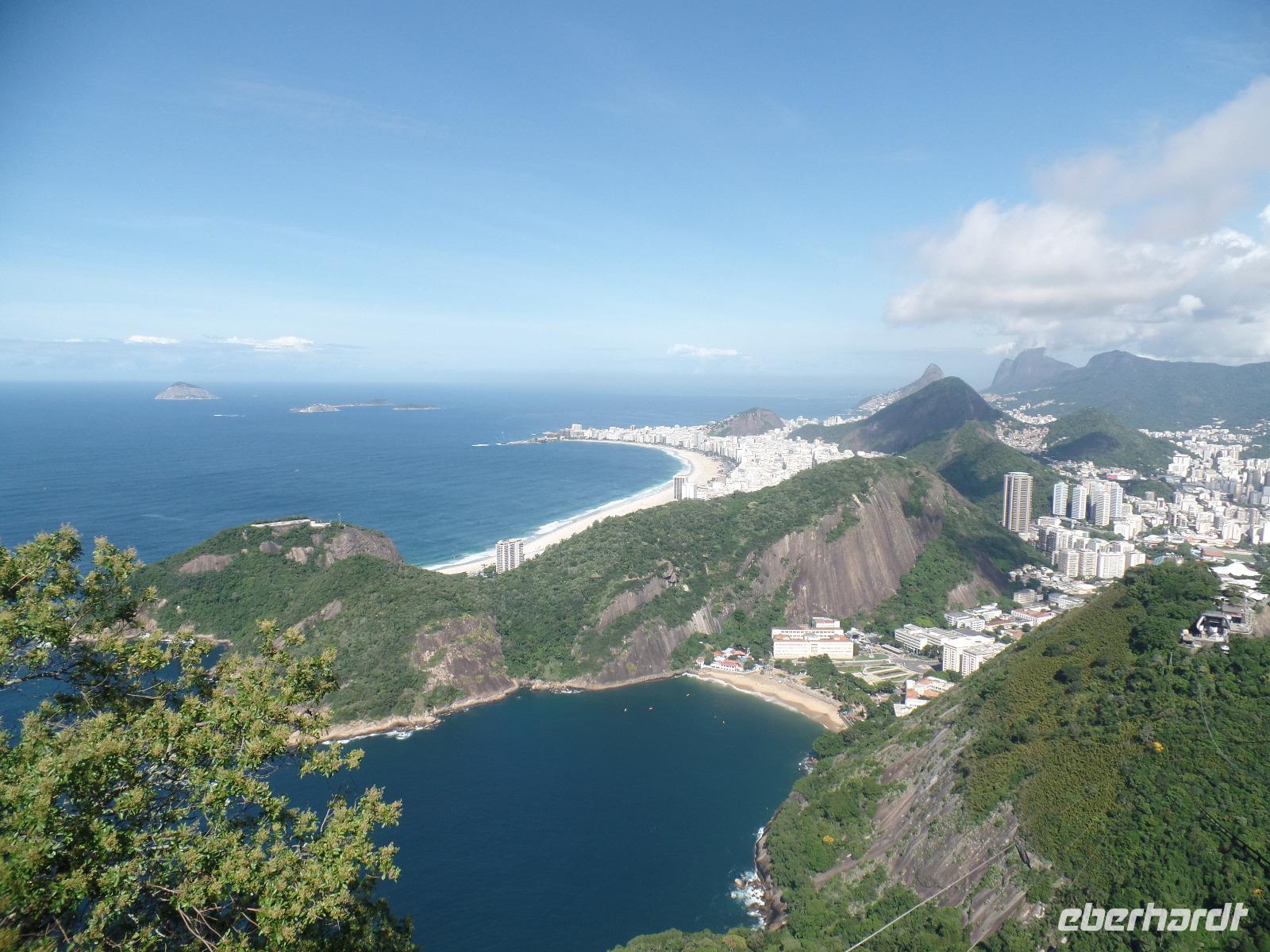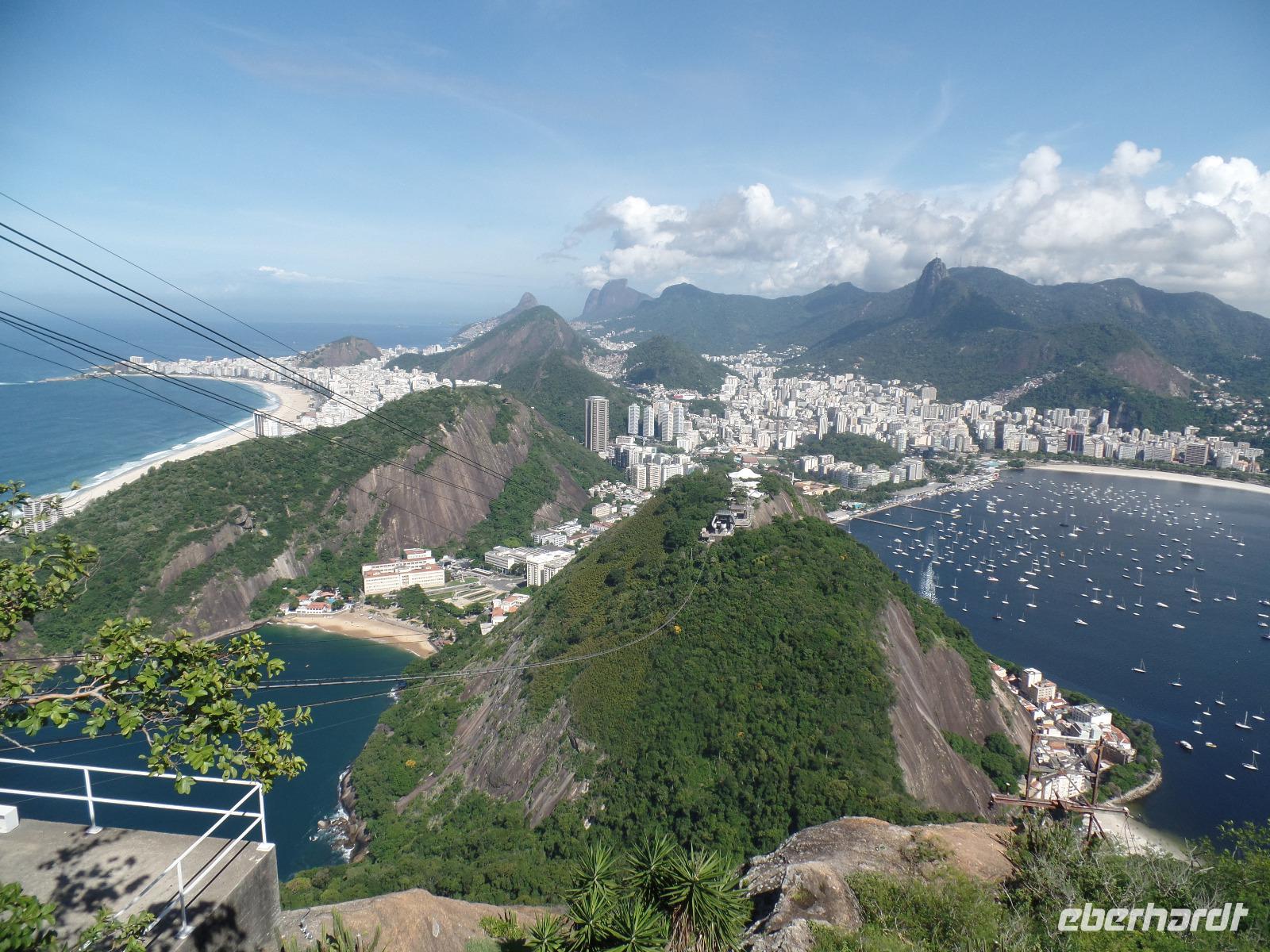 Frühstück in Hotel Merlin war super. So kann man den Tag gut anfangen: Papaya, Kaffee, Honig, usw.. Wir wussten nicht genau was am besten heute war: Zuckerhut oder Christus... wir wollten versuchen beide ohne Wolken zu sehen. Und wir vertrauten unsere Reiseleiterin Iolanda, die meinte heute lieber Zuckerhut. Und das war richtig so. Und damit erlebten wir heute den Zuckerhut! Zuerst fuhren wir mit der Seilbahn auf den Gipfel des Berges. Aus der Höhe von 440 Metern bietet sich ein fantastischer Blick auf Rio's weltberühmte Strände Copacabana, Ipanema, Leblon und Aterro de Flamengo. Wir hatten wieder Glück mit dem Wetter... "Hier stimmt was nicht, oder?". Wir fuhren zu einem der berühmtesten Wahrzeichen Rios: dem Zuckerhut. Der Berg ist über 400 Meter hoher Granitfelsen (Morro), der den bildhaften Namen aufgrund seiner Form erhielt. Seinen Gipfel erreichten wir mit einer Seilbahn in zwei Etappen. Deren Seitenwände waren komplett verglast, sodass wir bereits während der Auffahrt von allen Seiten eine herrliche Aussicht hatten. Vom Gipfel aus hatten wir einen noch umfangreicheren Blick und genossen später einen traumhaften Sonnenuntergang über die Strände. Von Weiten konnten wir sogar den Granitfelsengipfel Christus, zu welchem wir morgen noch hinfahren werden, sehen.